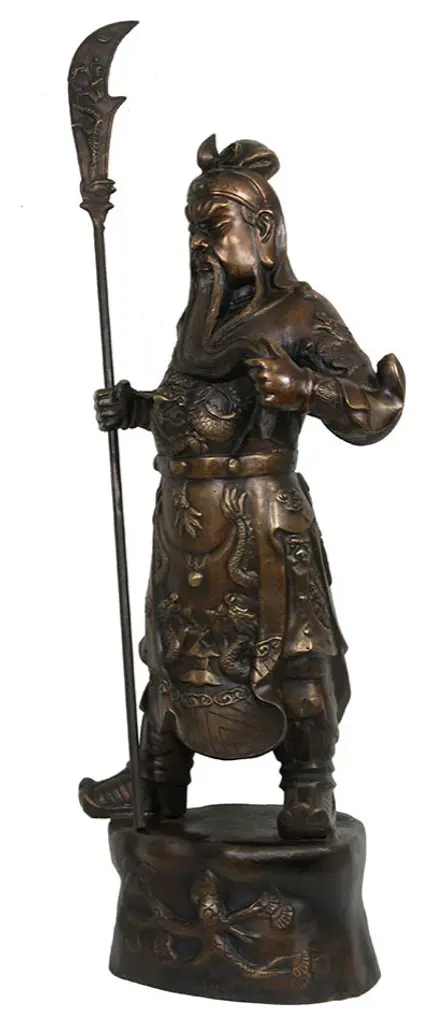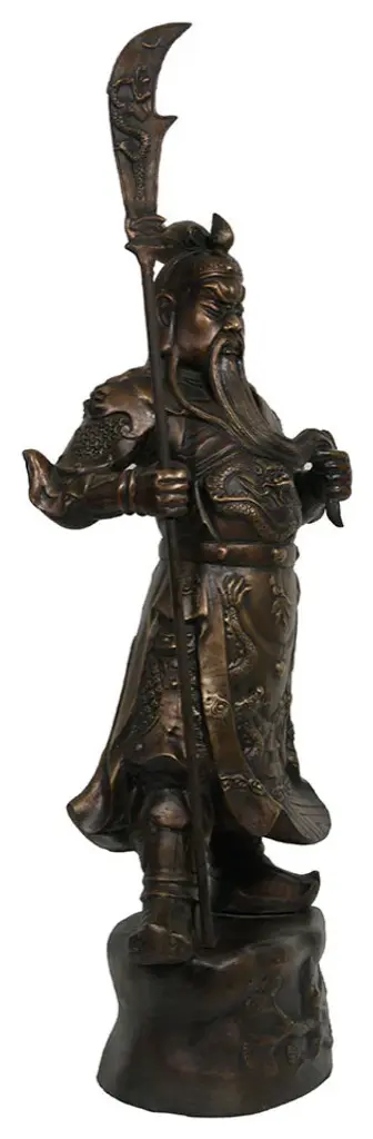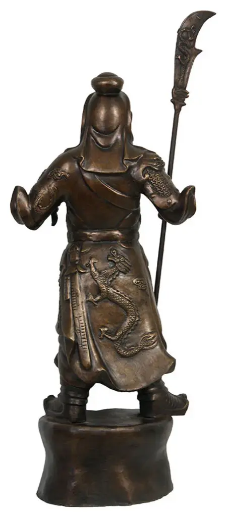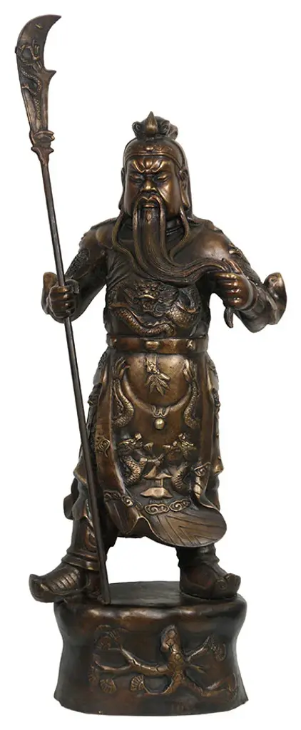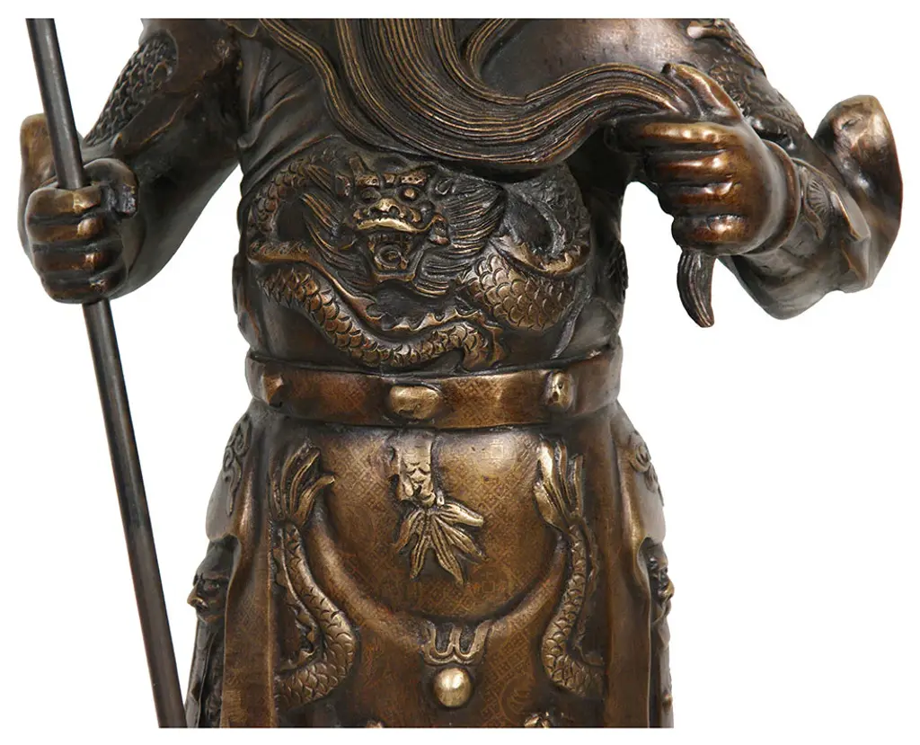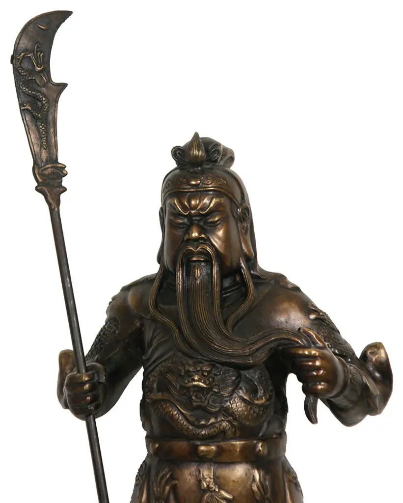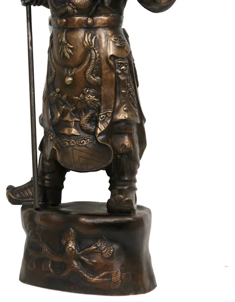 Take look at this magnificent Chinese Antique Carved Bronze Guan Gong Statuary. It shows very detailed carving works on it. It is all hand made and hand carved Guan Gong standing on a rock and holding his Weapon. Guan Gong is very famous in Chinese folks by his loyalty to his King. His was a very famous Warrior in Han Dynasty. Nowadays people pray him for protection and safety. It is made by bronze. You can see from the pictures that they are in many years history with some age wears. Now you can have them on your collection shelf. They are not only a great adornment but also a wonderful gift! Don''t miss it.Size: 31in H x 13in W x 7in D without weaponwith weapon high: 35in HOrigin: Shan Xi, ChinaCirca: 1900 - 1940Material: BronzeCondition: Original condition, normal age wear.Disclaimer: Due to differences in monitor/screen settings, product colors may differ slightly between product photos and the physical product.