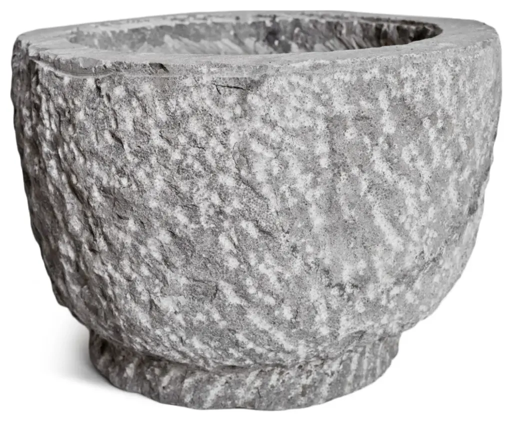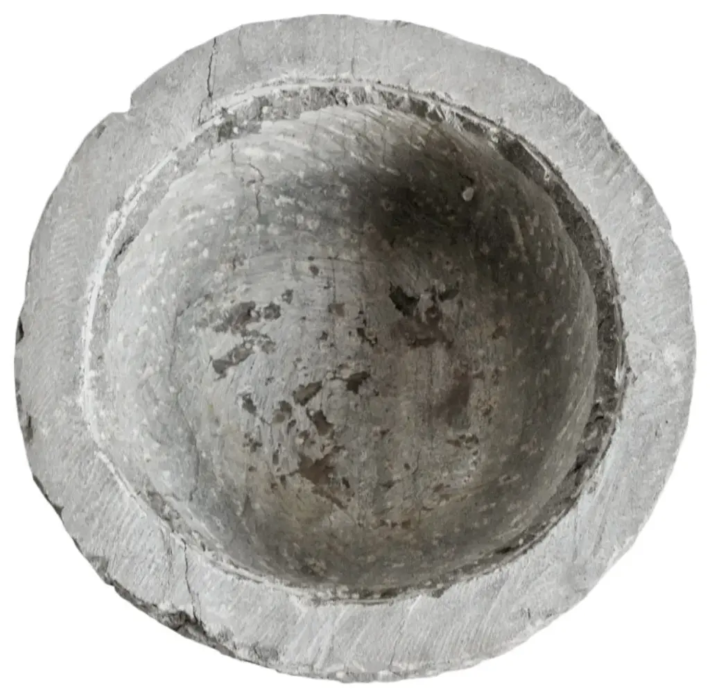 Consigned rustic small old chiseled granite stone round pot. Wonderful rough texture and great for indoors or out.Condition: Great, with signs of age and useOrigin: ChinaEra: Mid 1900''s