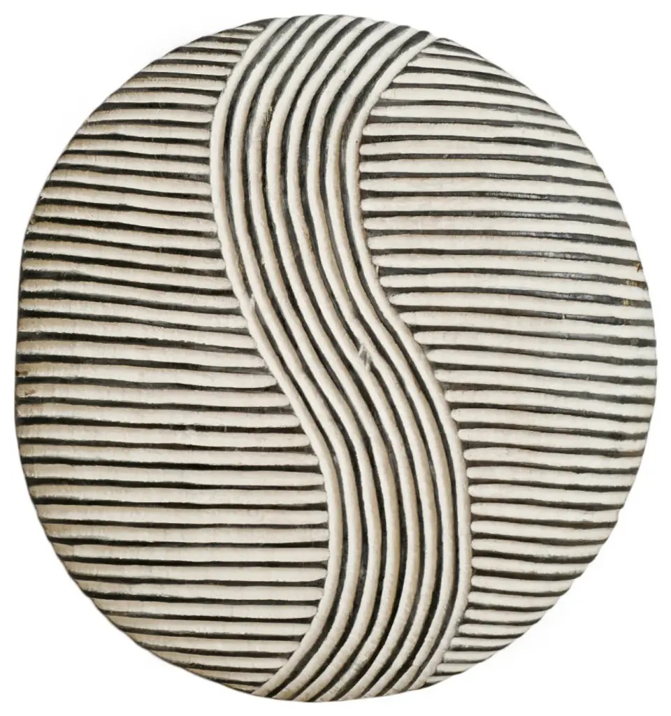 Consigned traditional Round South African Zulu shields date back to King Shaka Zulu and have been used by tribesman in battle for hundred of years. As the modern world has evolved so to has the Zulu tribesman. These shields are no longer used in battle but instead used for traditional Zulu ceremonies such as weddings in telling historic ancestry stories. These carved wood designs painted in bold black and white patterns continue to have a striking modern form displayed in groupings. Each may vary slightly due to unique hand carvings. Comes with hook attached on back for hanging on wall. Antique white finish.Condition: Great, with signs of age and useOrigin: South AfricaEra: Late 1900''s