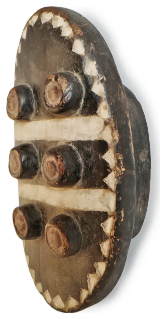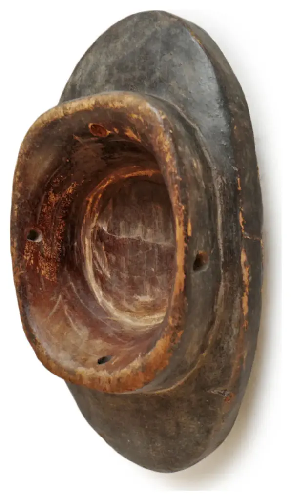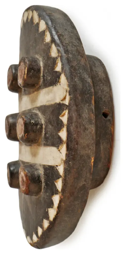 Consigned vintage Grebo carved wood mask in elegant modern oval shape. Original aged black and white paint.Condition: Great, with signs of age and useOrigin: LiberiaEra: Mid 1900''s