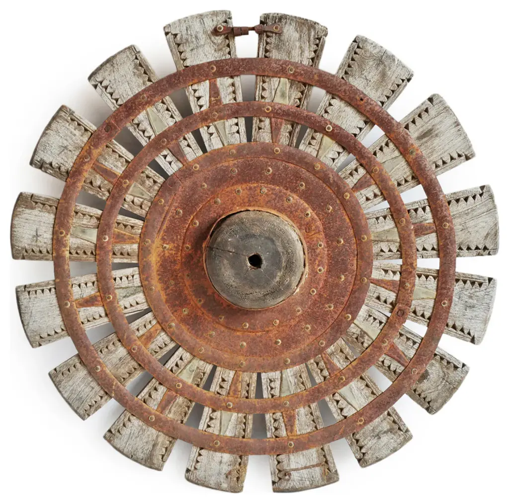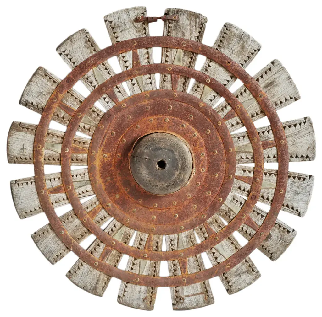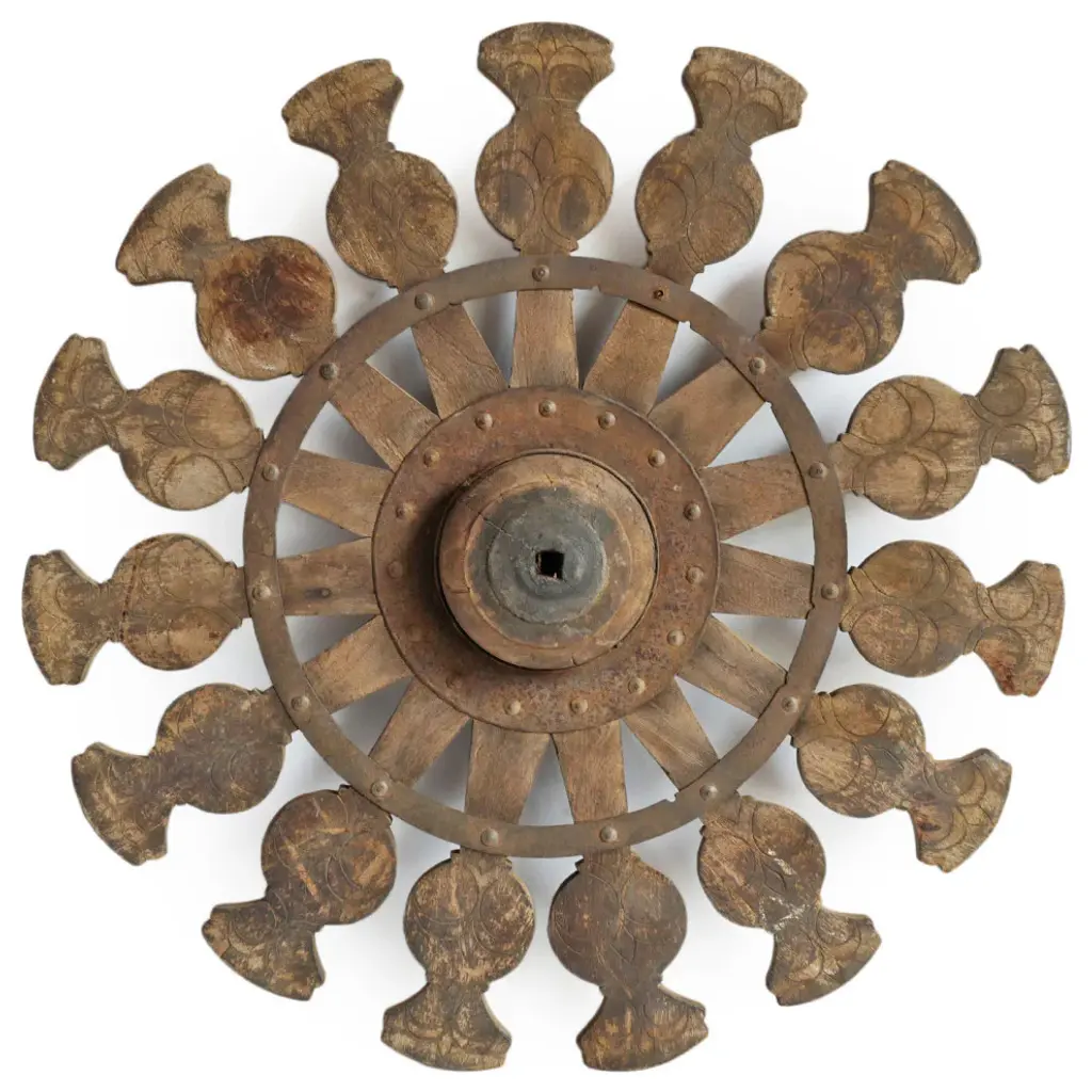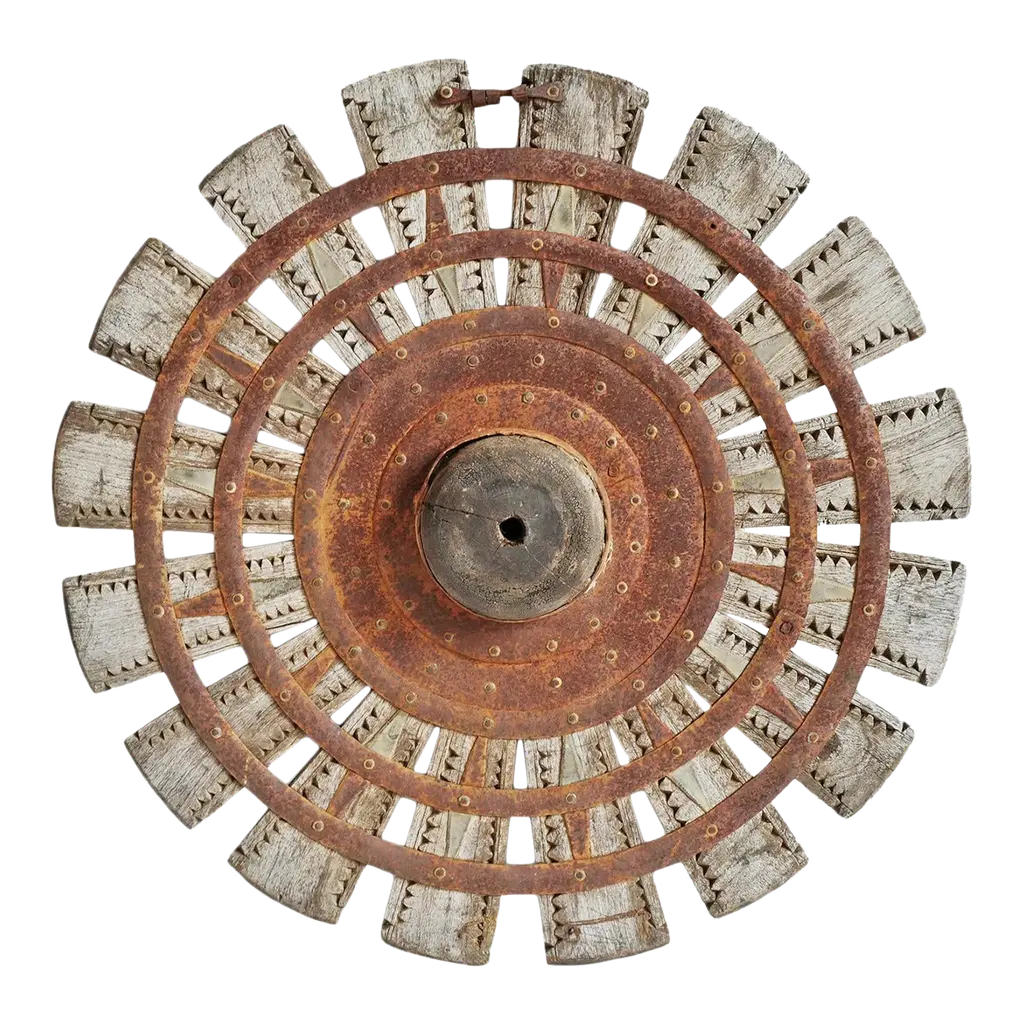 Consigned vintage wood sewing wheel from India. Each is hand crafted is unique in signs of age and use, wood tones, and other details. Measurements may vary slightly. Wonderful displayed as unique wall art. Each is sold individually.Condition: Great, with signs of age and useOrigin: IndiaEra: Mid 1900''s