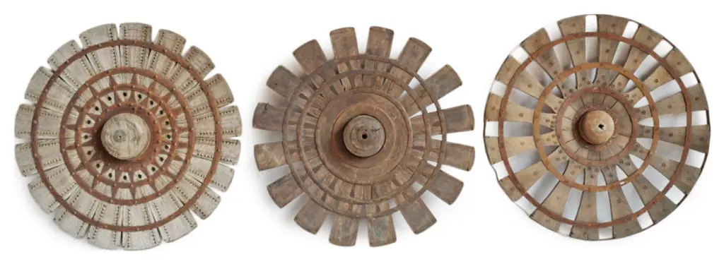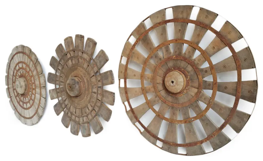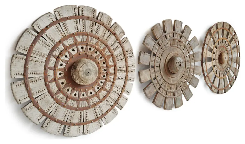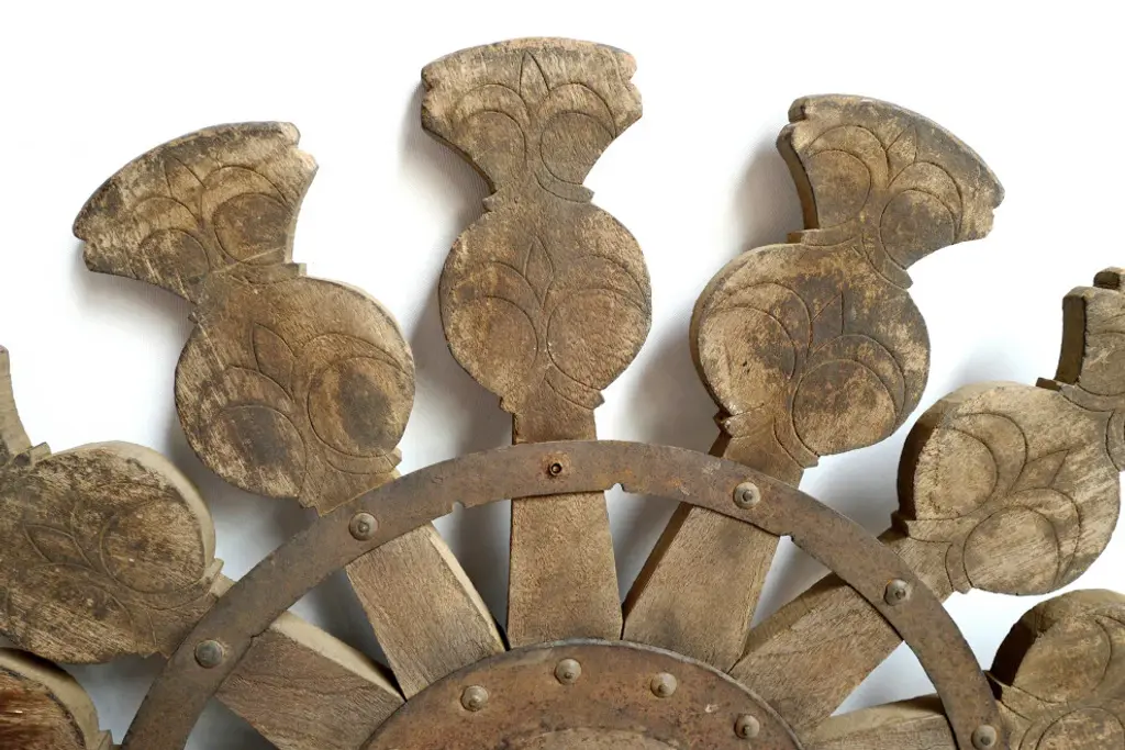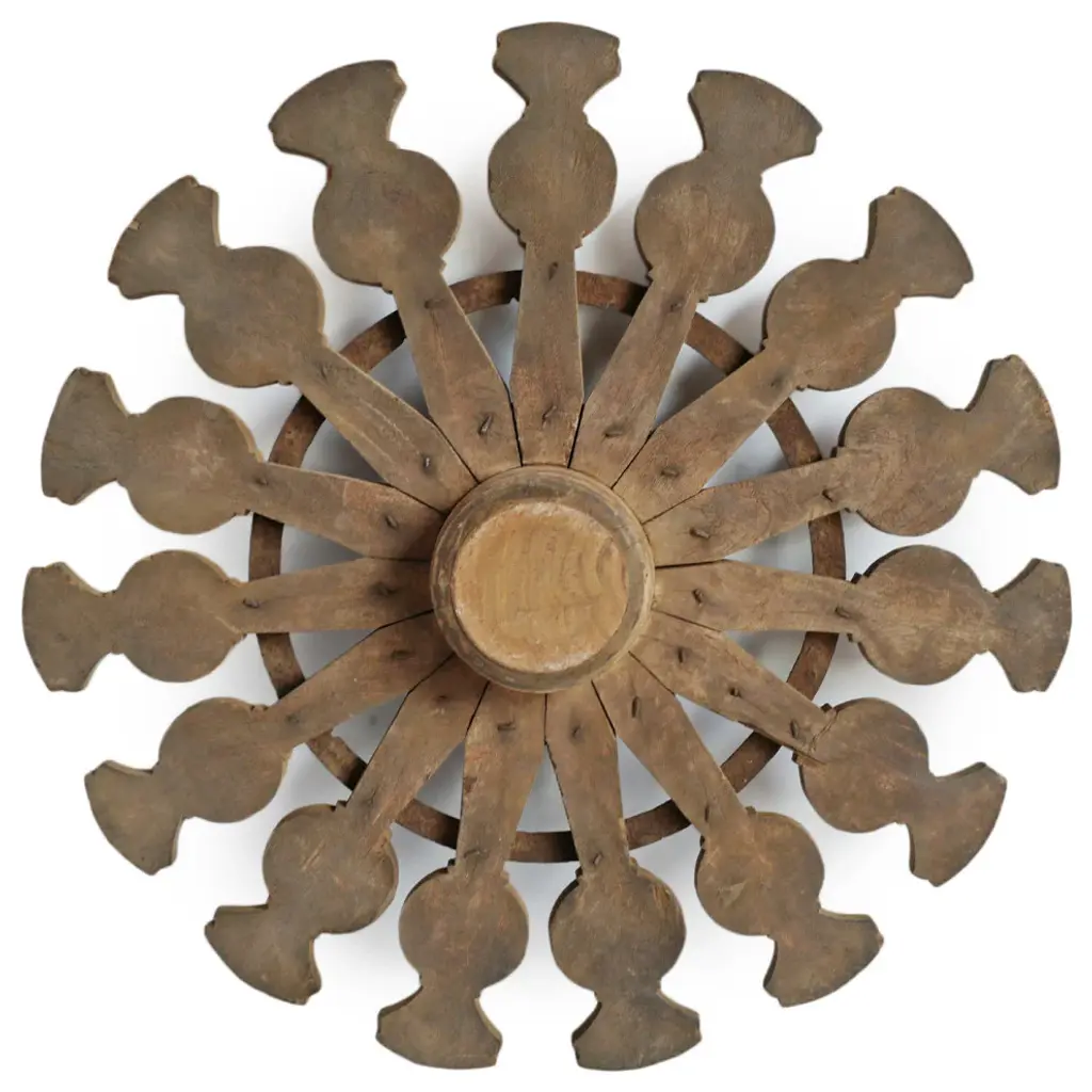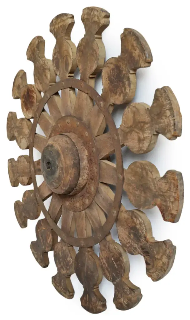Consigned vintage wood sewing wheel from India. Each is hand crafted is unique in signs of age and use, wood tones, and other details. Measurements may vary slightly. Wonderful displayed as unique wall art. Each is sold individually.Condition: Great, with signs of age and useOrigin: IndiaEra: Mid 1900''s