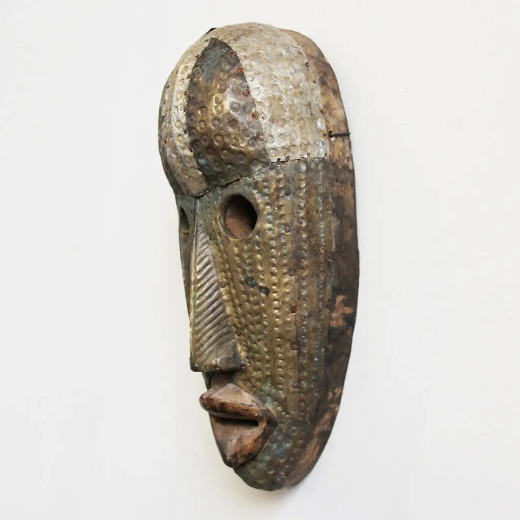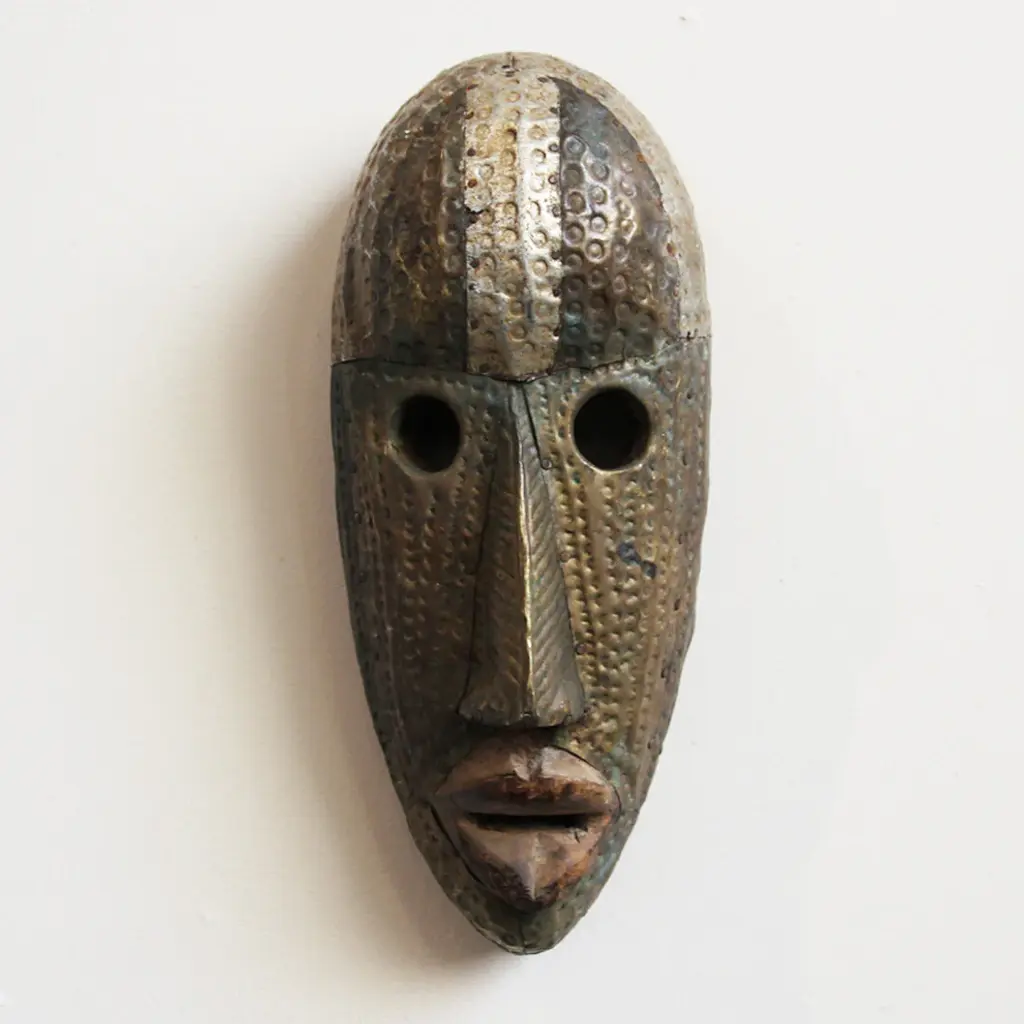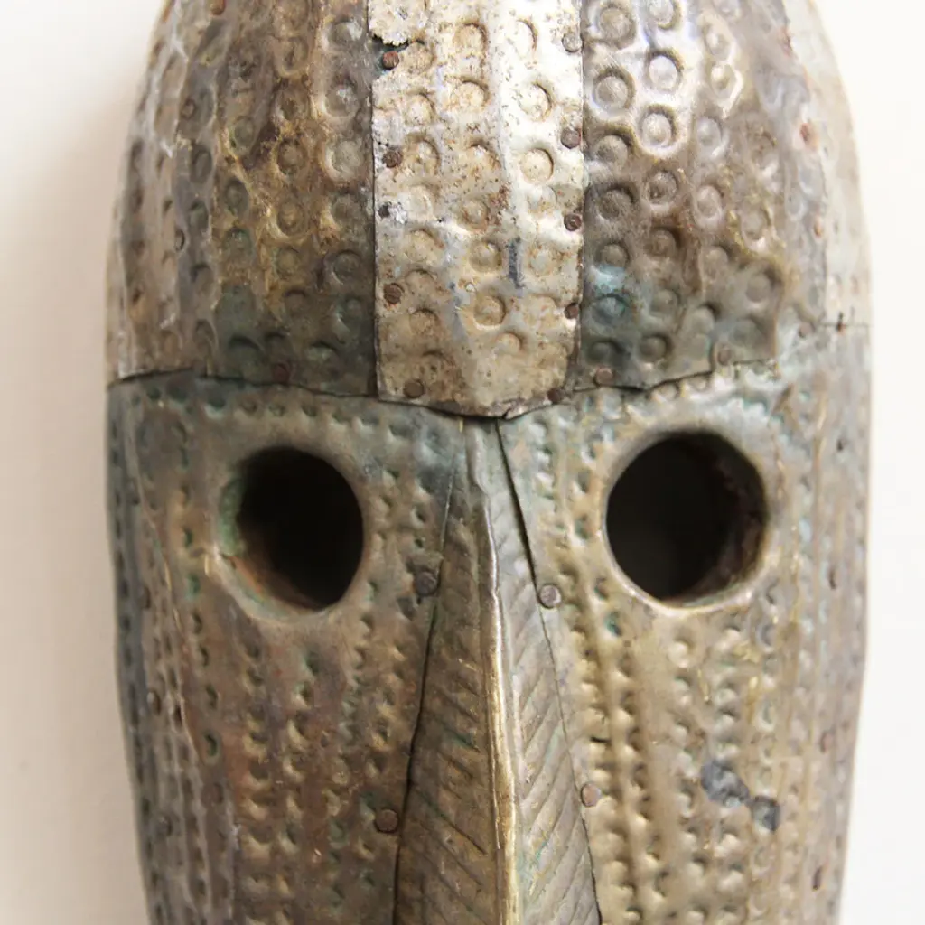 Consigned Marka Bamana traditional metal work brass nickel copper and tin tribal mask. Great patina and hand hammered texture with traditional circular cut out eye holes.Condition: Great, with signs of age and useOrigin: MaliEra: Mid 1900''s