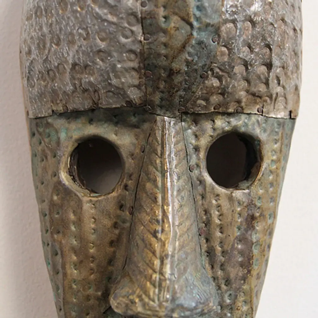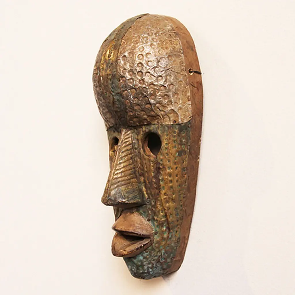 Consigned Marka Bamana traditional metal work brass nickel copper and tin tribal mask. Great patina and hand hammered texture with traditional circular cut out eye holes.Condition: Great, with signs of age and useOrigin: MaliEra: Mid 1900''s