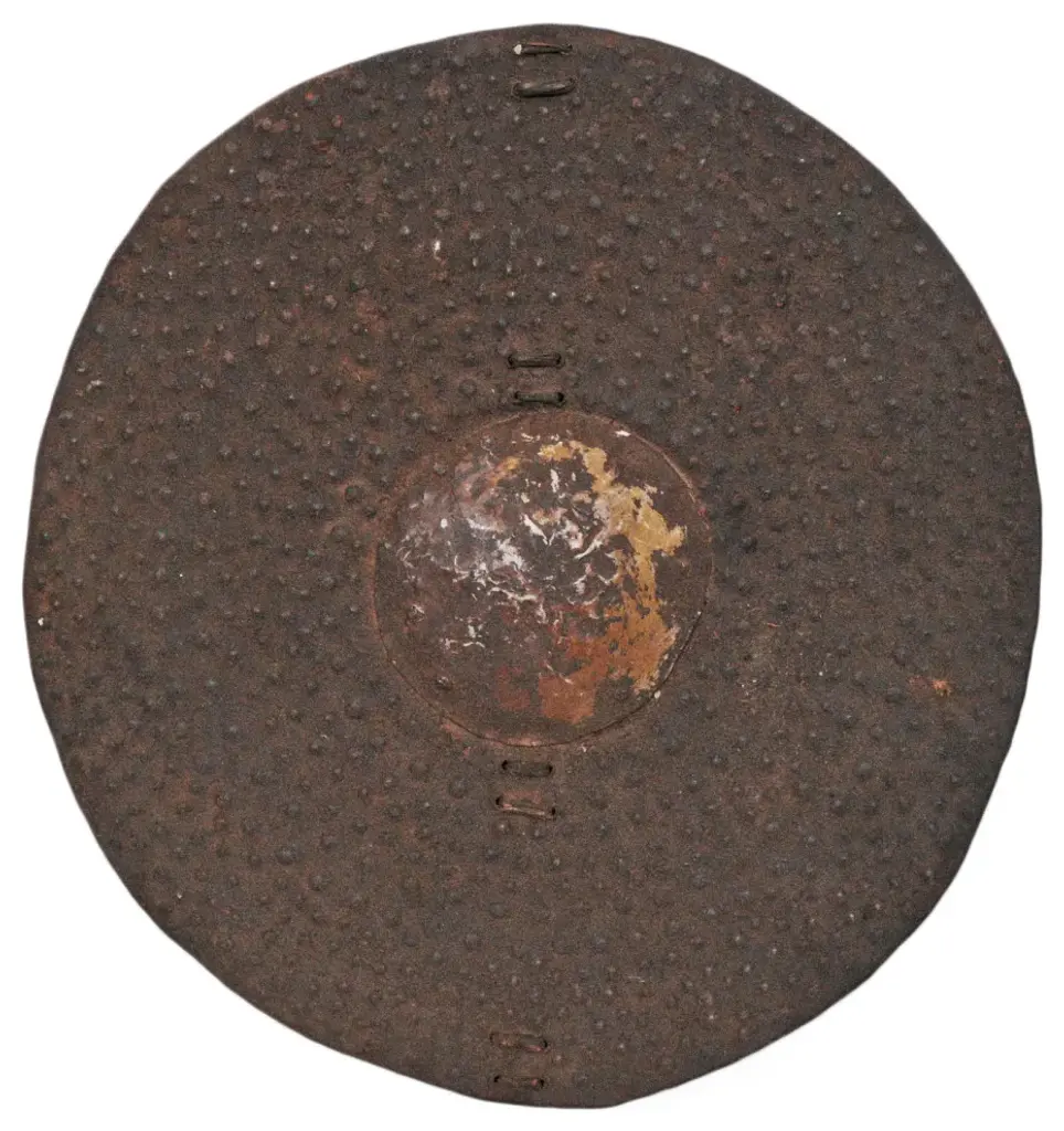 Consigned old round iron Dinka shield from Sudan. Each slightly unique with original aged patina and textures.Condition: Great, with signs of age and useOrigin: SudanEra 1900''s