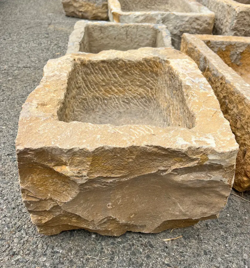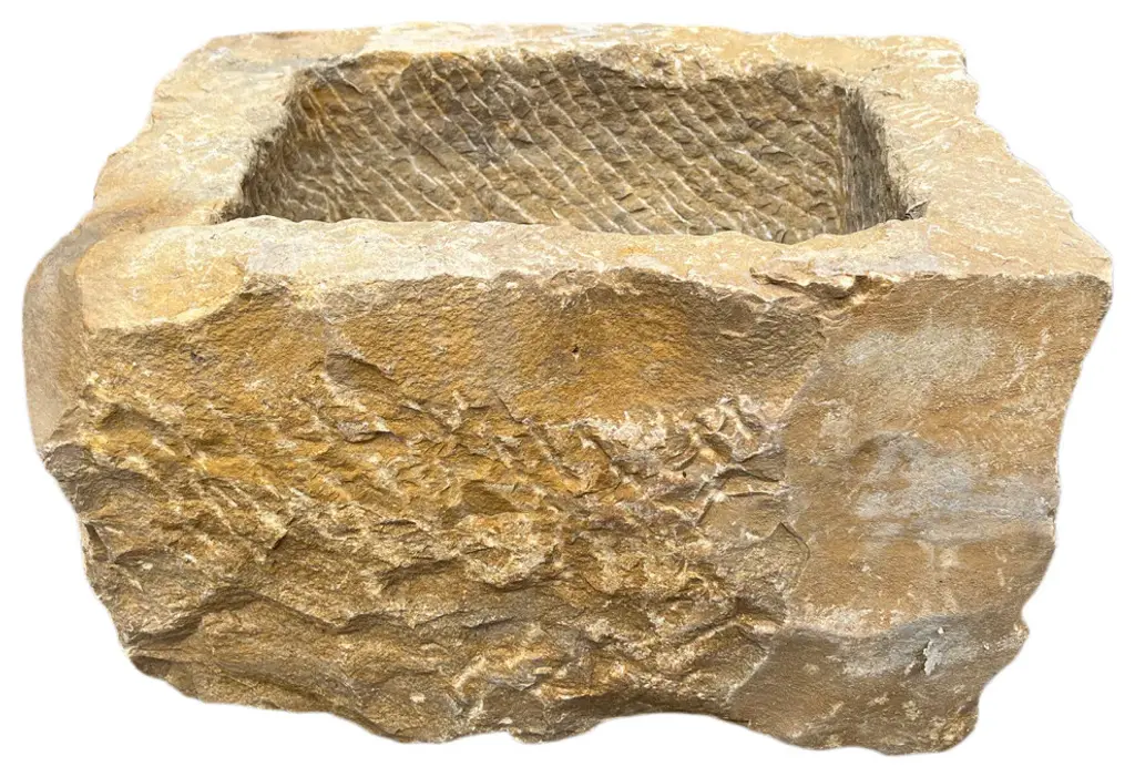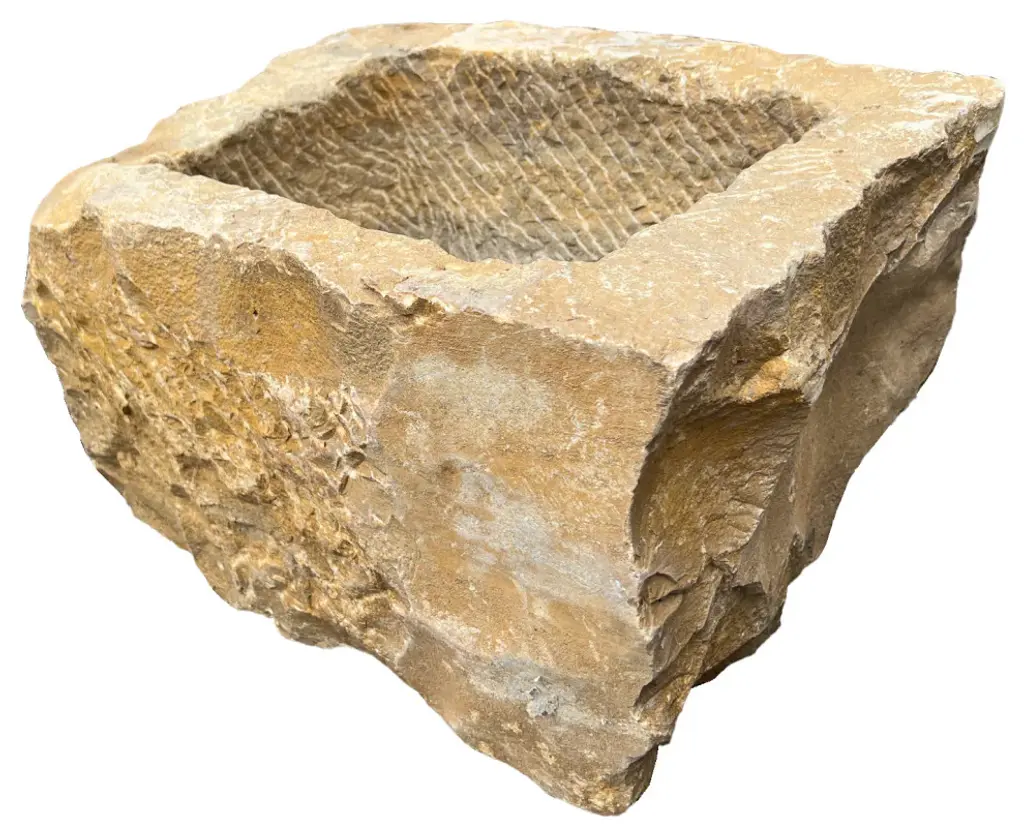 Consigned large vintage old sandstone trough from north India. Beautiful rustic aged textures and patina. Inside depth measures 10".Condition: Good, with signs of age and useOrigin: IndiaEra: Mid 1900''s