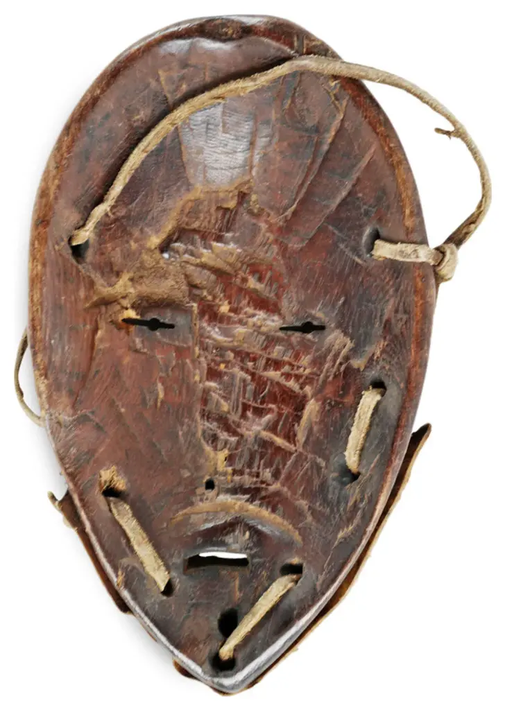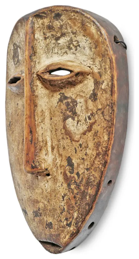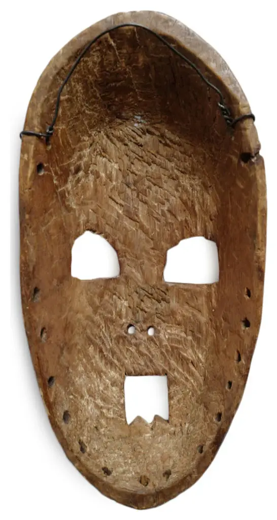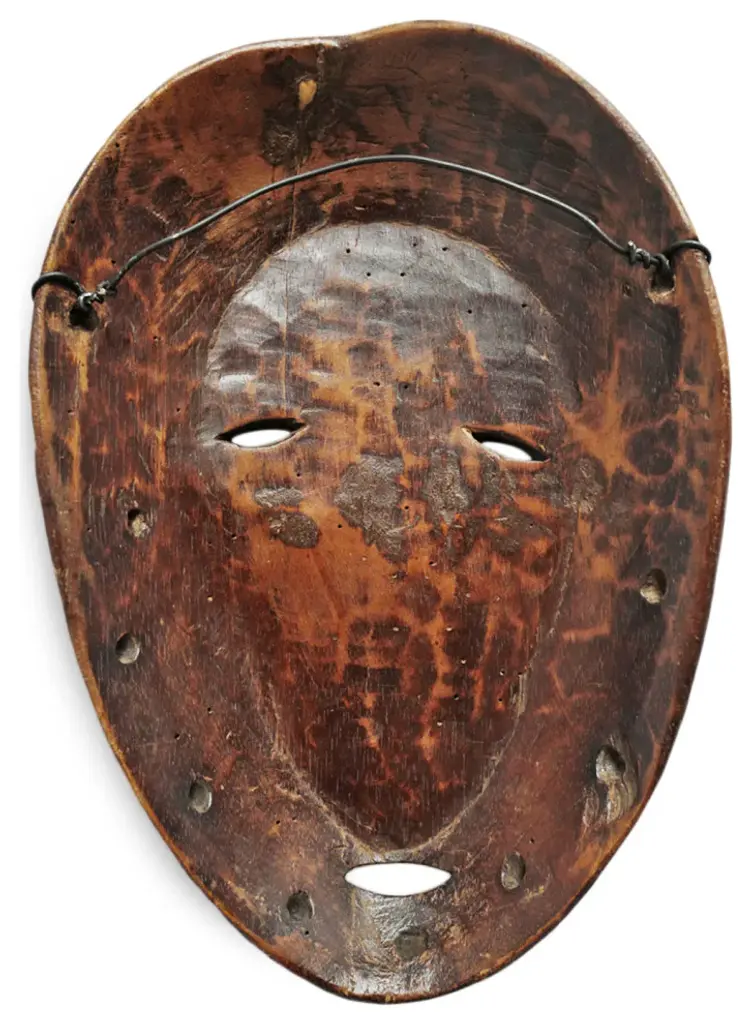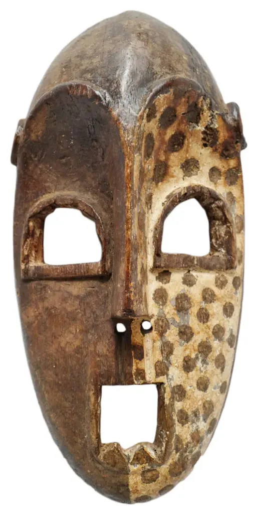 Consigned original wood carved mask from Democratic Republic of Congo with leopard painted spots on half of face. Wonderful displayed as wall art on its own or as part of a collection.Condition: Great, with signs of age and useOrigin: Democratic Republic of CongoEra: Mid 1900''s