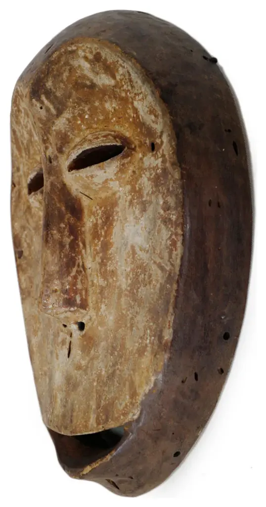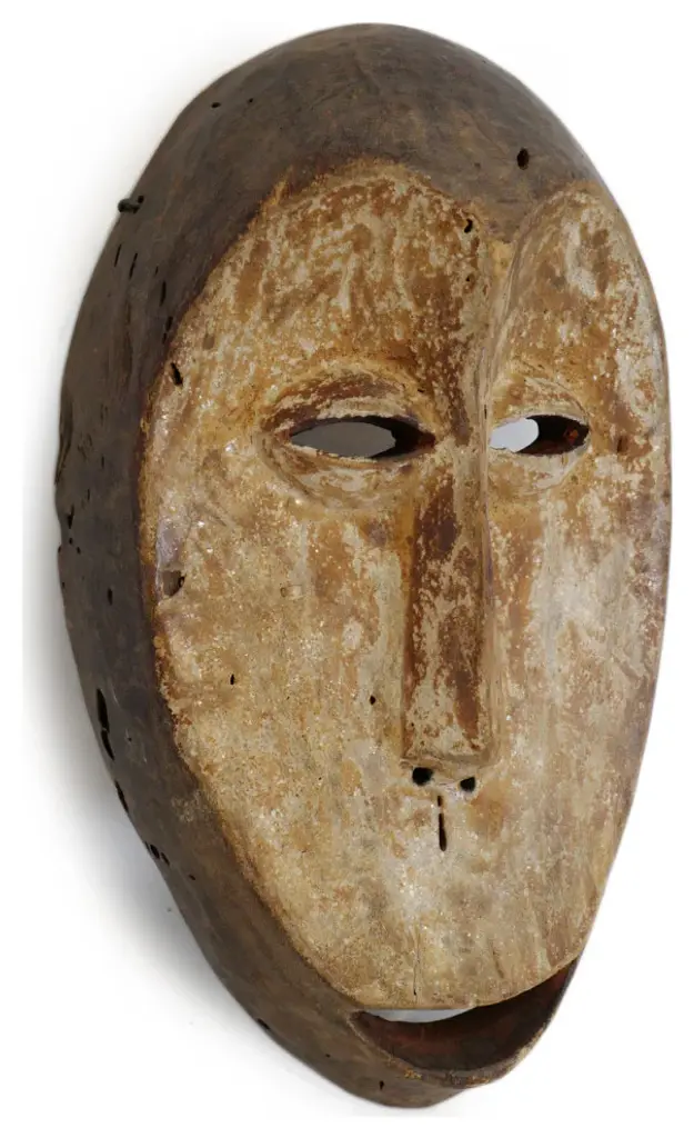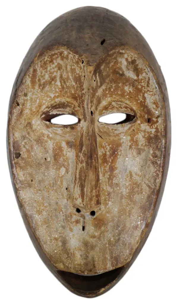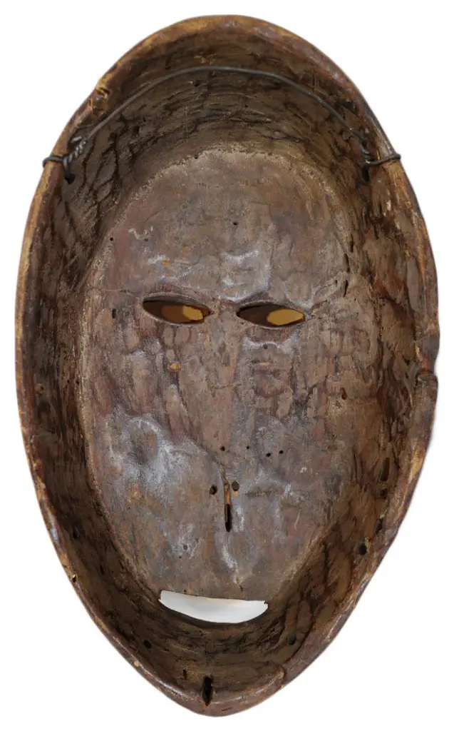Consigned original vintage Lega mask with white reflective mica mud applied to face. From Democratic Republic of Congo. Traditionally used as identification symbol or for initiation purposes.Condition: Great, with signs of age and useOrigin: Democratic Republic of CongoEra: Mid 1900''s