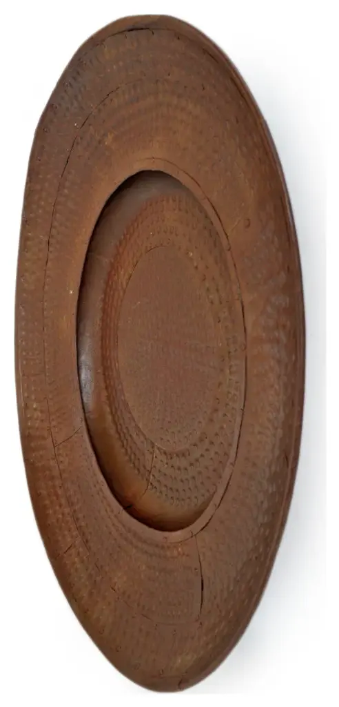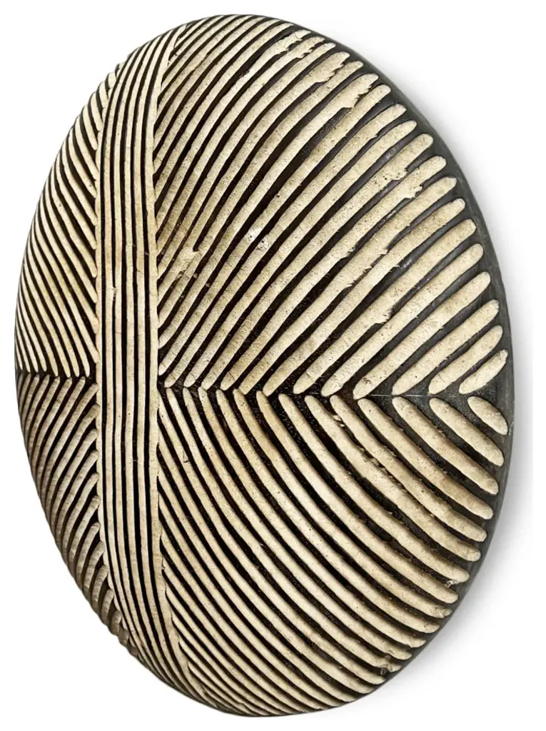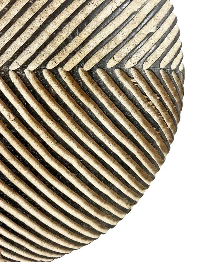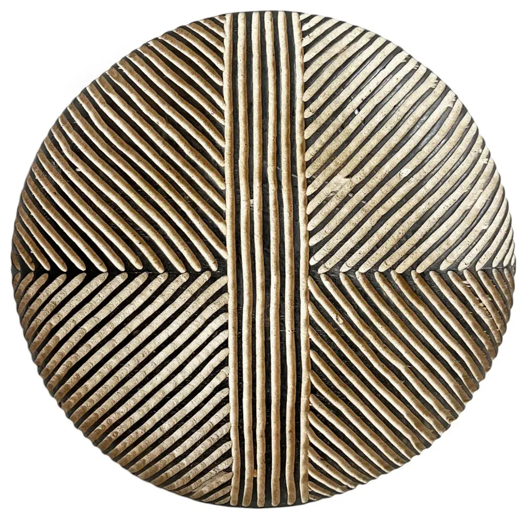 Consigned vintage round black and antiqued white carved wood Zulu shield. Traditional round South African Zulu shields date back to King Shaka Zulu and were used by tribesmen in battle for hundreds of years. In more recent times, they are no longer used in battle but are used in traditional Zulu ceremonies, such as weddings, and in telling stories of ancestors. These carved wood designs painted in contrasting black and white patterns have a striking modern form and are quite impactful, especially when displayed in groupings. Each shield will vary due to unique hand carvings and signs of age/use. Some may be more stark black and white while others may have a more aged finish. Comes with hook attached on back for hanging on wall.Condition: Great, with signs of age and useOrigin: South AfricaEra: Late 1900''s