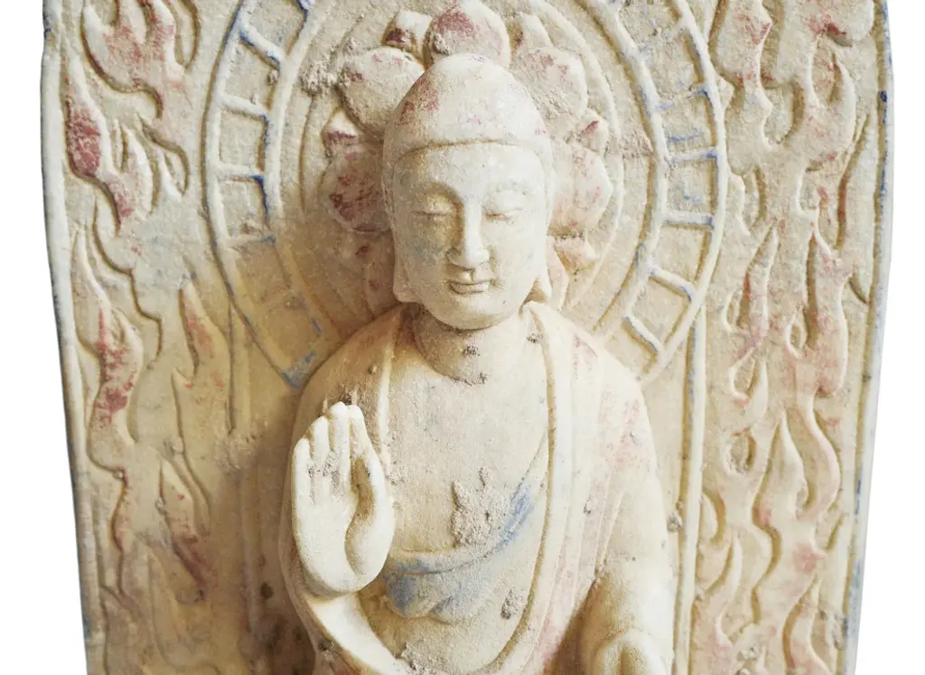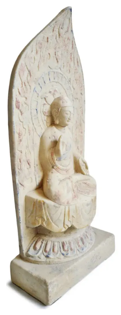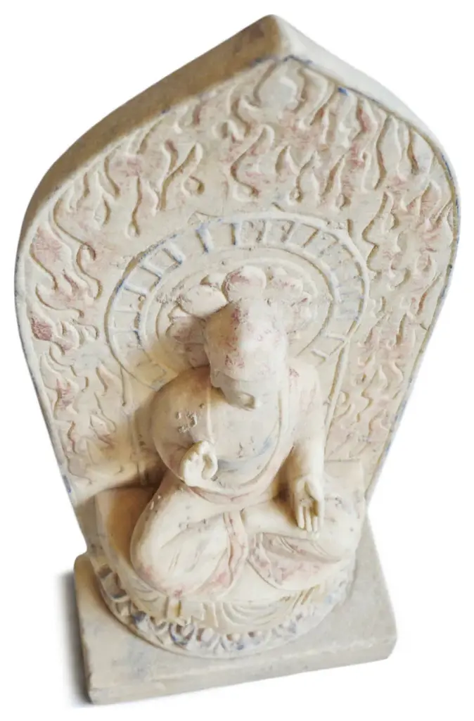 Consigned vintage hand carved marble sitting Buddha. Cross-legged resting pose with flames and center lotus behind head with hands in the Abhaya mudra, which means fearlessness and is used to dispel fear and develop courage. Great for decorative use indoors.Condition: Great, with signs of age and useOrigin: IndiaEra: Mid 1900''s