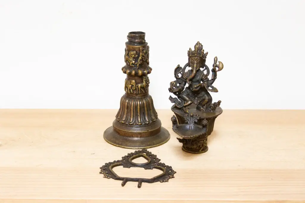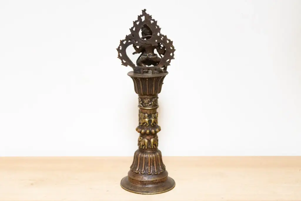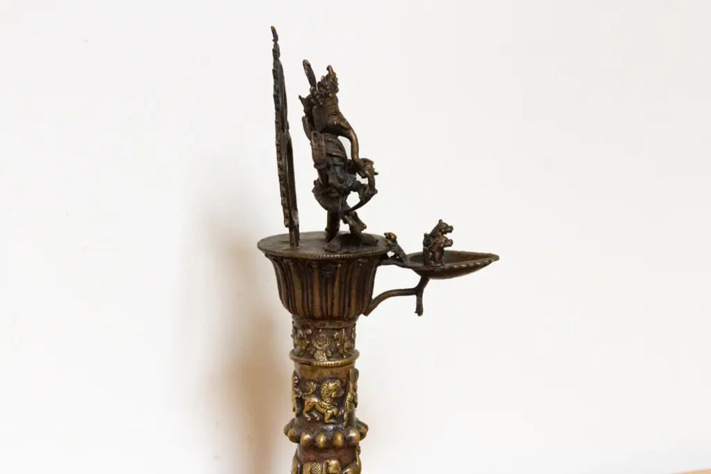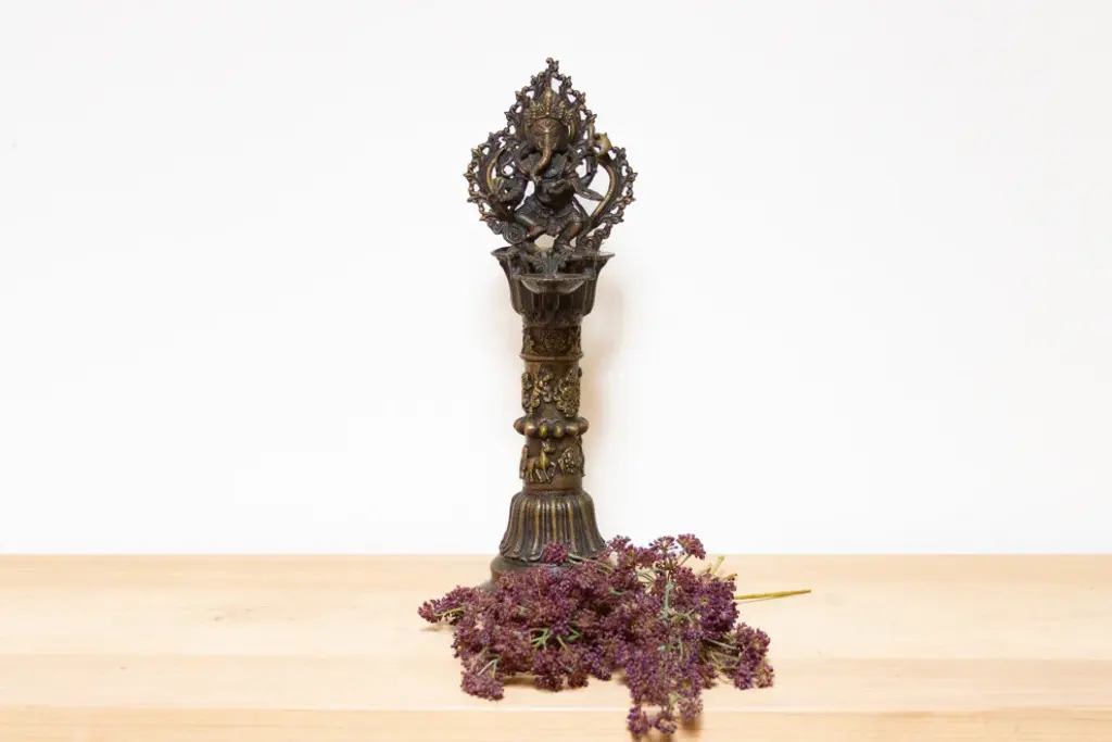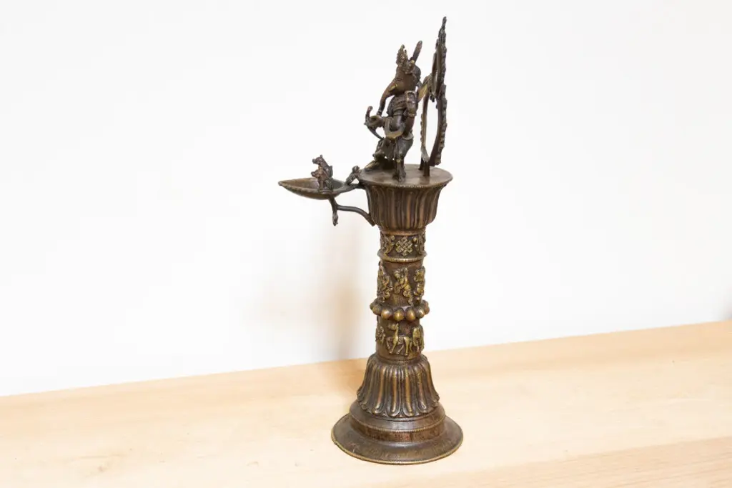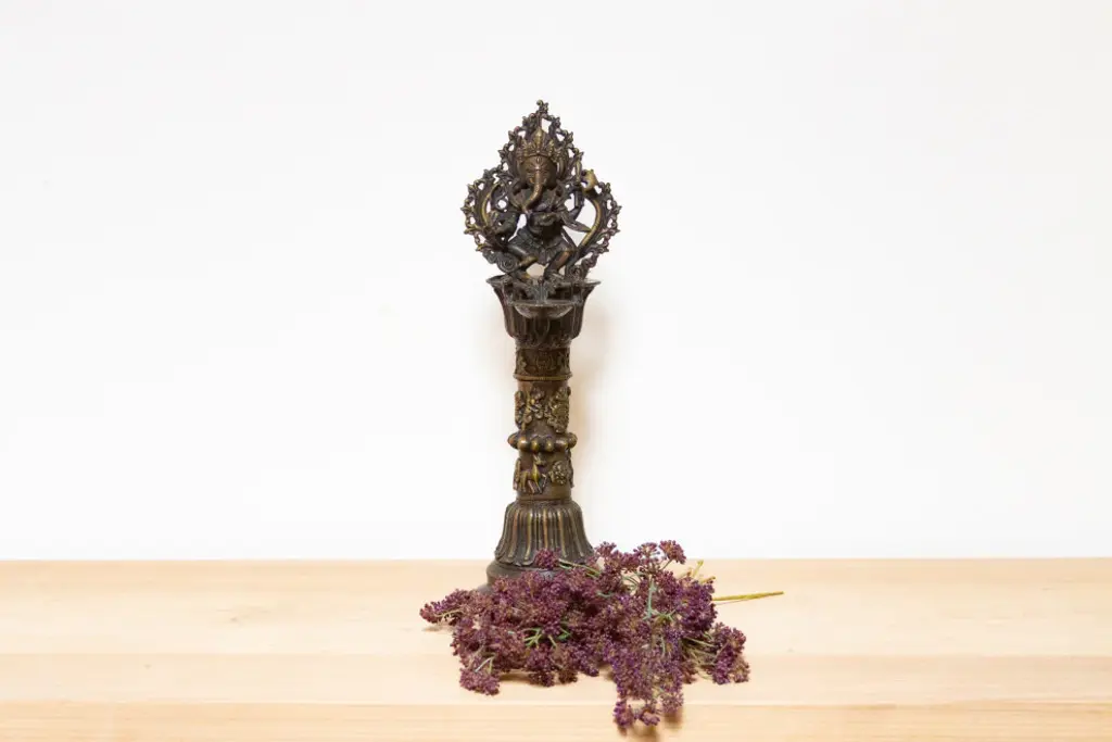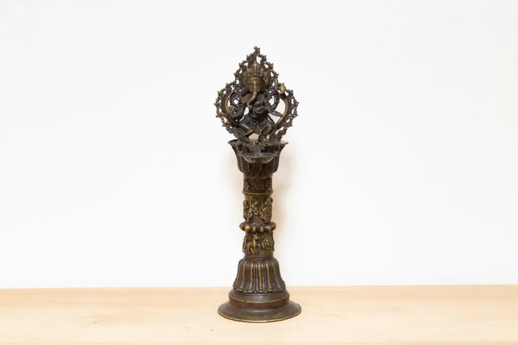 Antique Ganesha brass metal oil lamp from India, a slender and tall piece that reflects the artistry of the region. Constructed in three parts, this lamp stands as a testament to craftsmanship. At its zenith, a Ganesha figure graces the design, symbolizing prosperity and auspicious beginnings. The aged brass finish adds character, telling a story of time and tradition.The slim and tall design of this Nepalese lamp not only serves a functional purpose but also doubles as a decorative element. Whether placed in a sacred space or as a statement piece in your home, it radiates vintage charm and cultural richness.