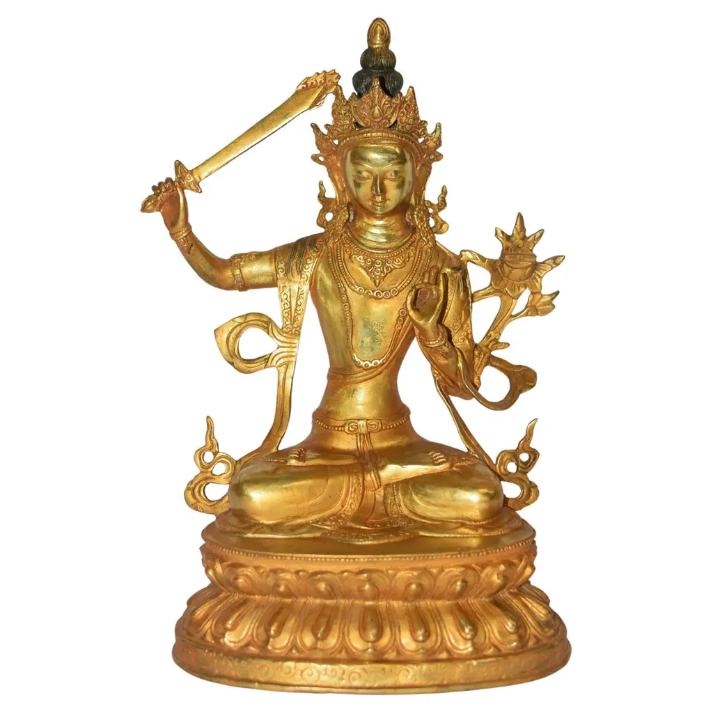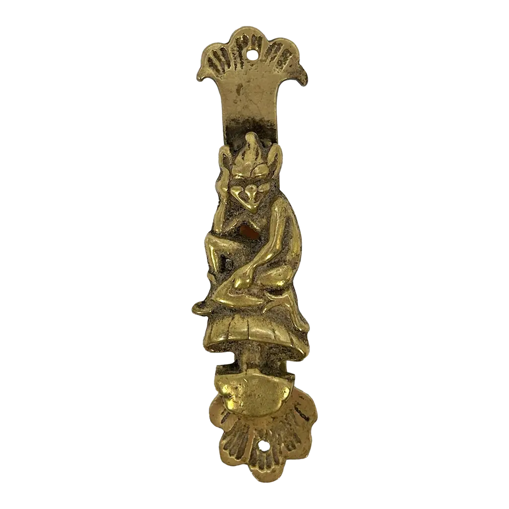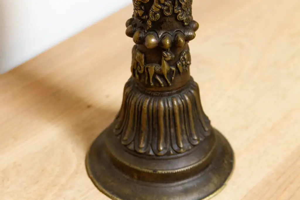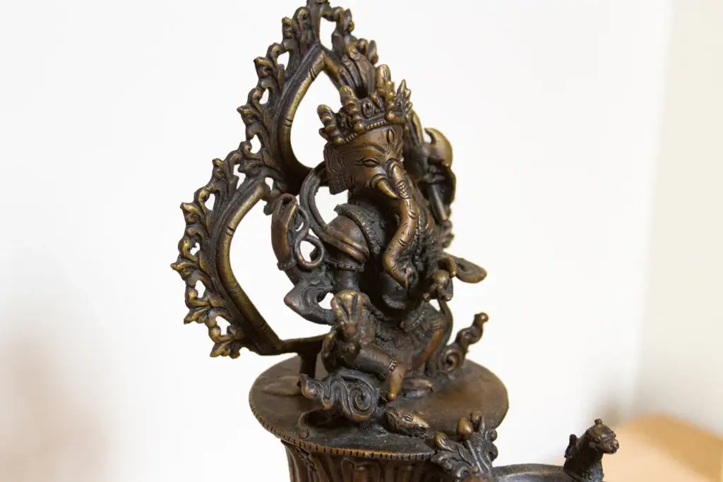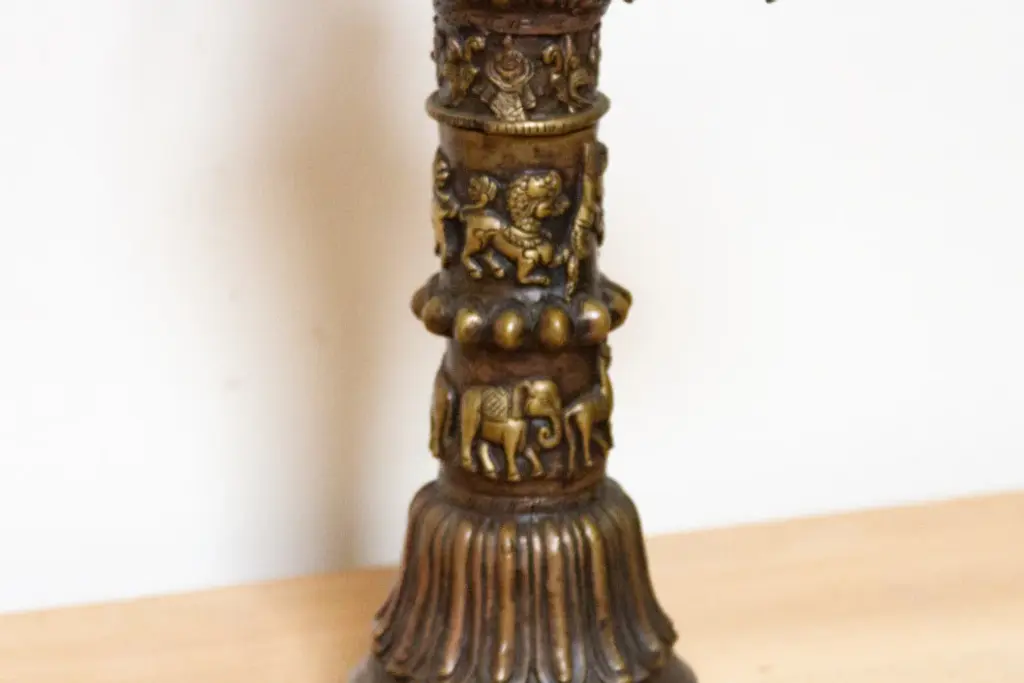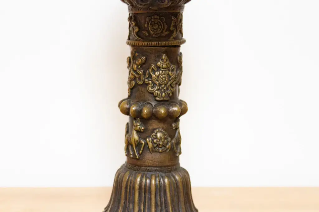 Antique Ganesha brass metal oil lamp from India, a slender and tall piece that reflects the artistry of the region. Constructed in three parts, this lamp stands as a testament to craftsmanship. At its zenith, a Ganesha figure graces the design, symbolizing prosperity and auspicious beginnings. The aged brass finish adds character, telling a story of time and tradition.The slim and tall design of this Nepalese lamp not only serves a functional purpose but also doubles as a decorative element. Whether placed in a sacred space or as a statement piece in your home, it radiates vintage charm and cultural richness.