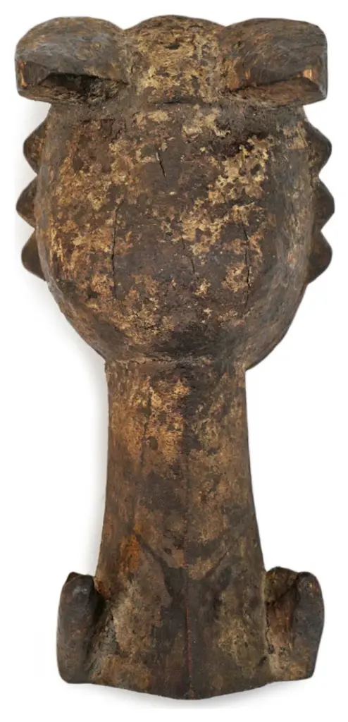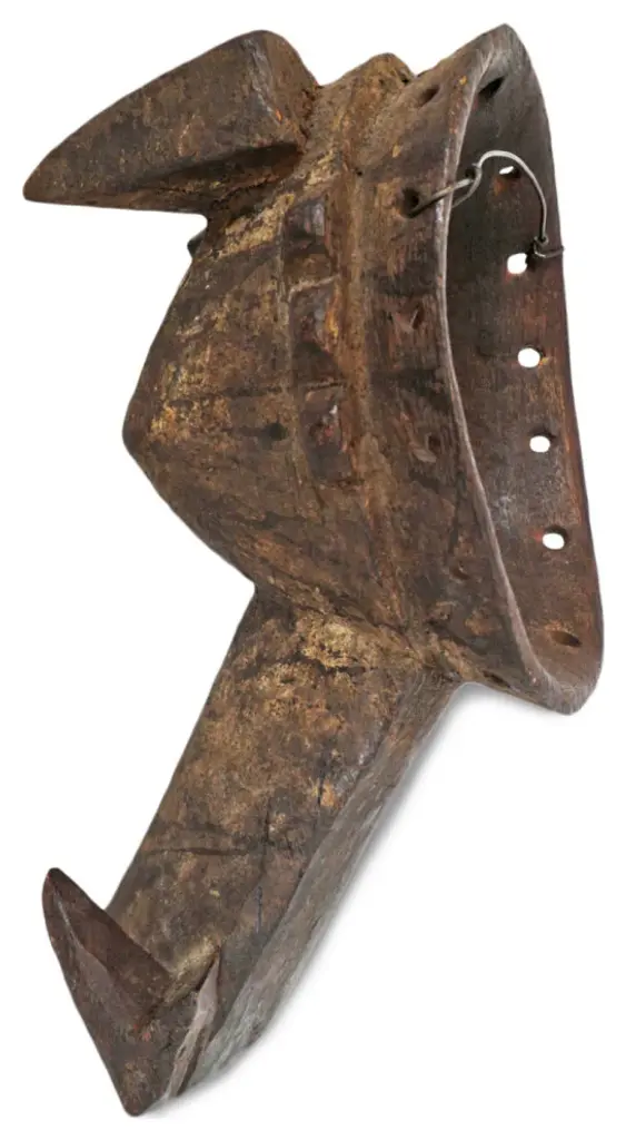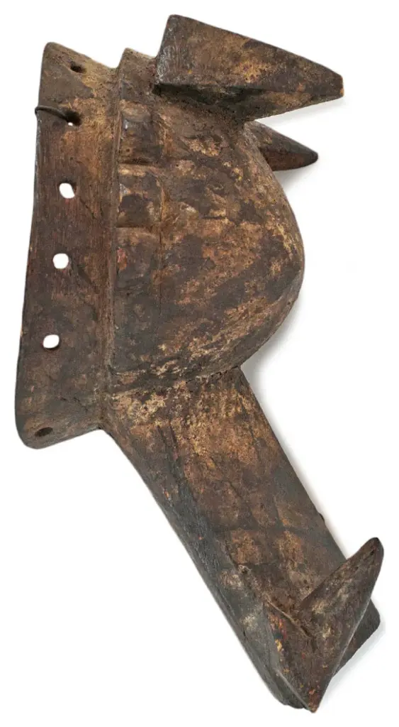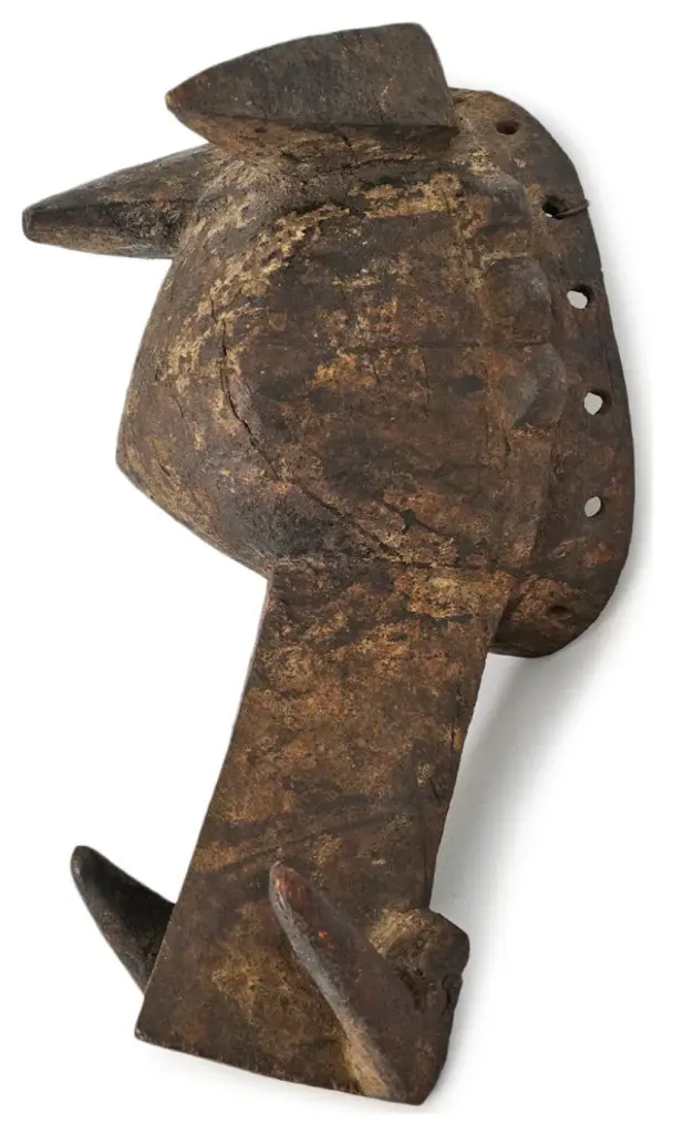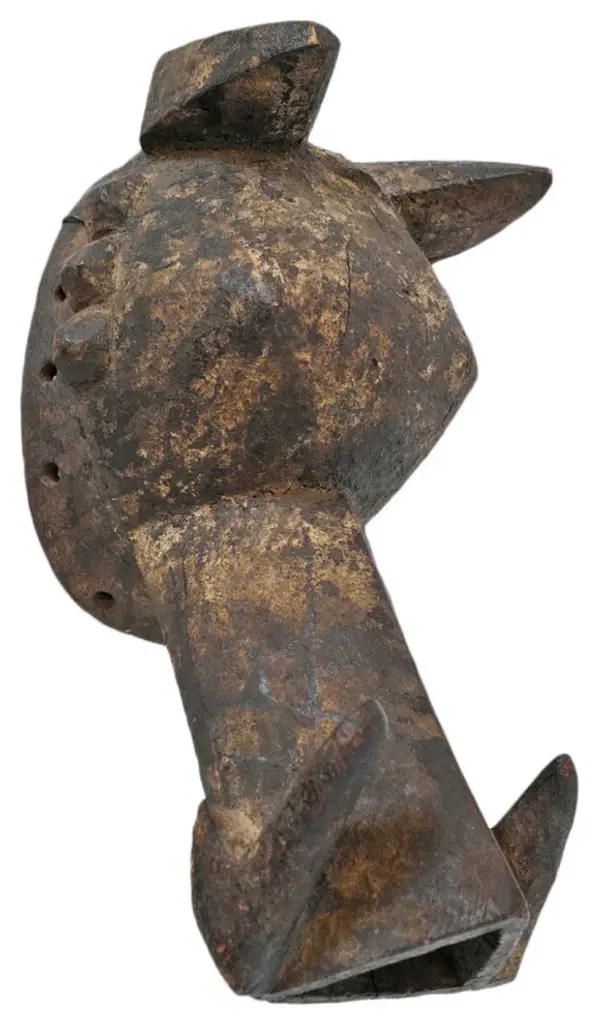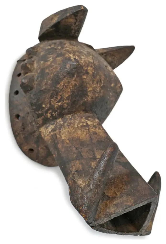 Consigned authentic vintage Bobo carved wood wild boar mask from Burkina Faso. Geometric stylized shape with aged patina to be cherished.Condition: Signs of age and useOrigin: Burkina FasoEra: Mid-Late 1800''s