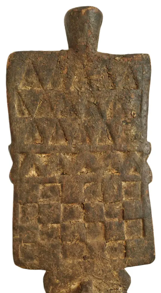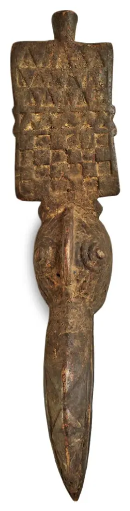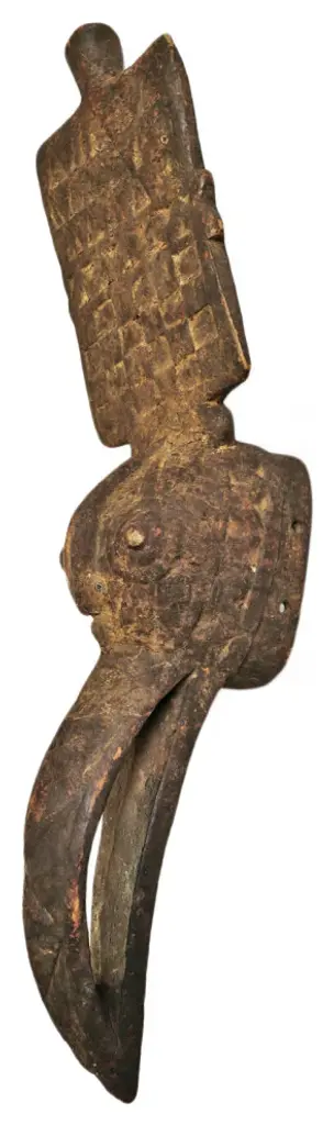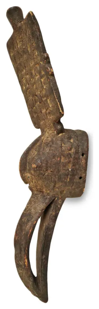 Consigned Original vintage carved wood bird mask from the Nuna people of Burkina Faso. Used during various ceremonies such as spirit invocation, boys'' initiation, village purification, or divination. Traditional geometric design patterns with encrusted surface and aged patina. Ready to hang on wall as sculptural wall art.Condition: Great condition with signs of age and useOrigin: Burkina FasoEra: Mid 1900''s