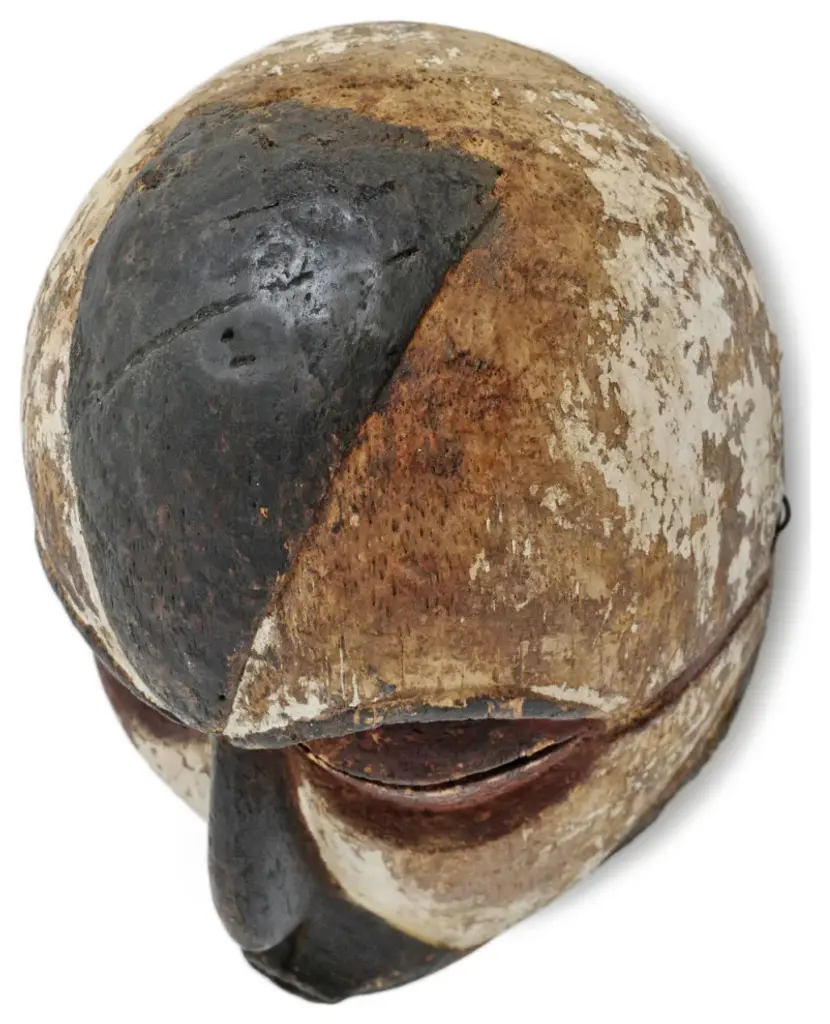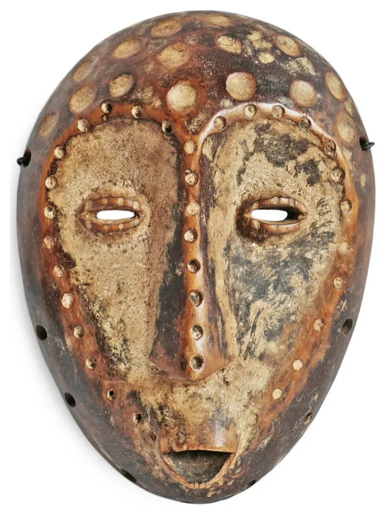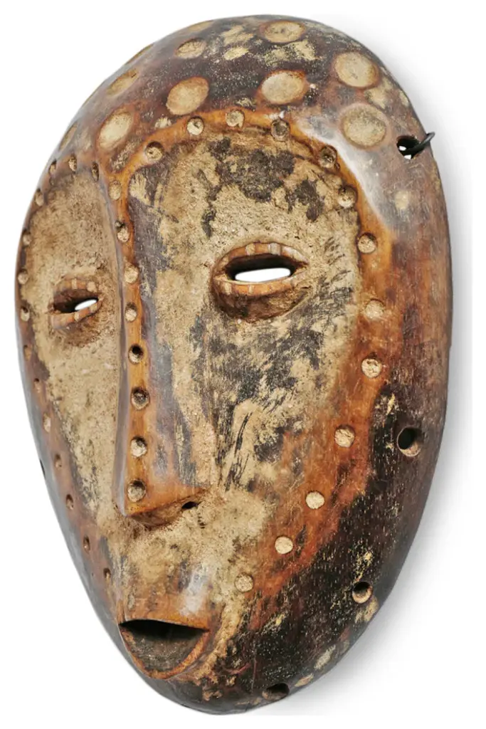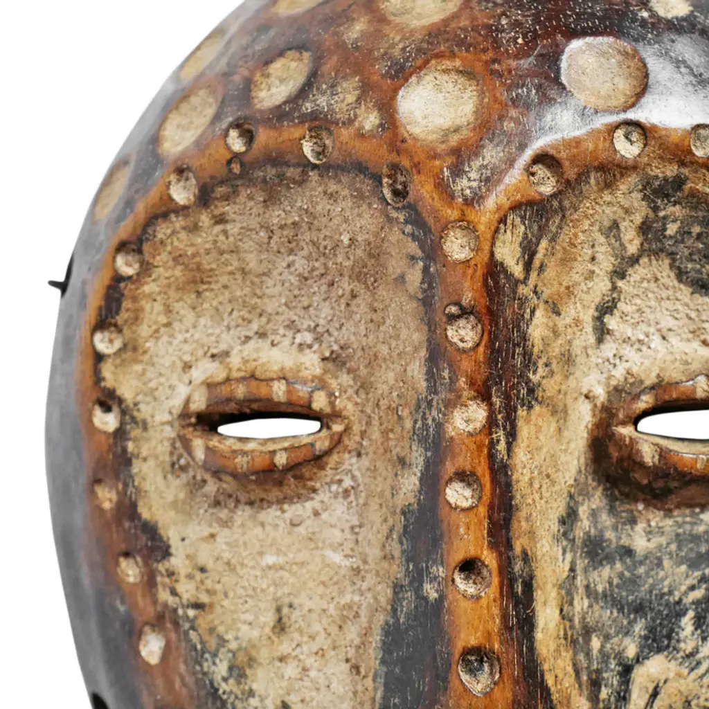Consigned vintage carved wood Lega wood mask from Democratic Republic of Congo. Carved indented circular dot patterns on face. Characteristic signs of age and use to be cherished. Wonderful collectors piece and ready to hang on wall in a grouping or on its own.Condition: Great, with signs of age and useOrigin: Democratic Republic of CongoEra: Mid 1900''s