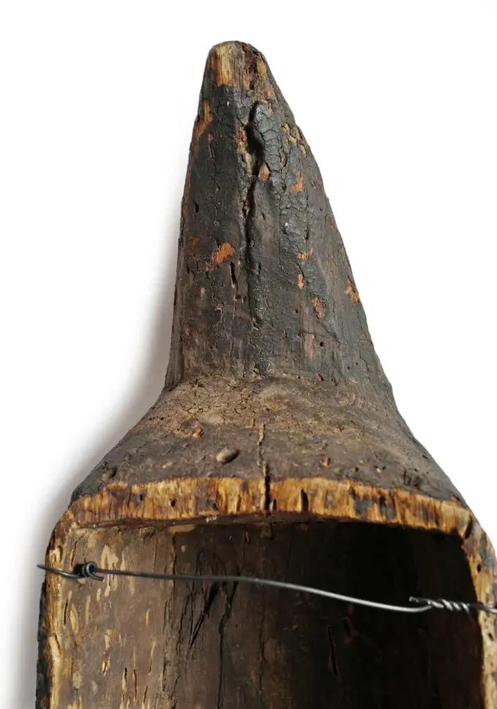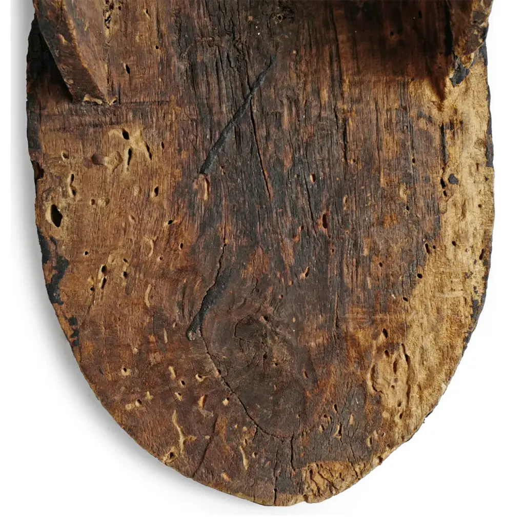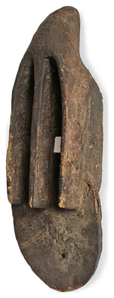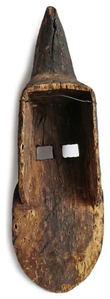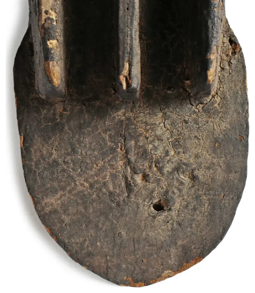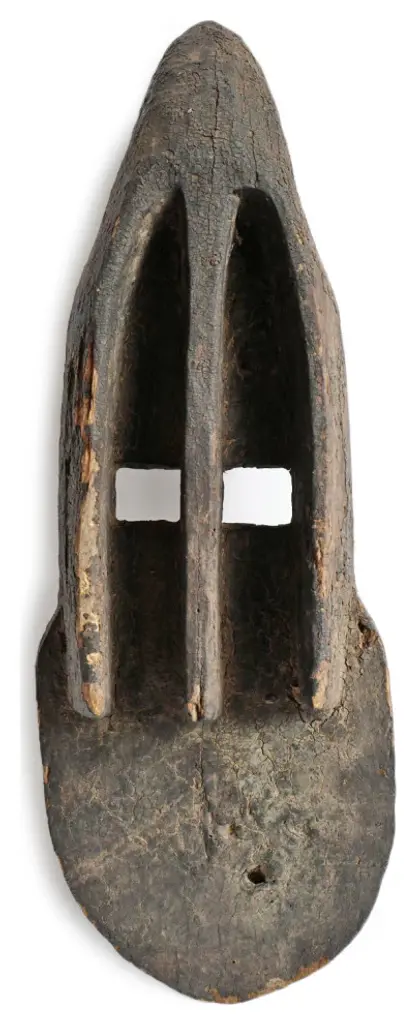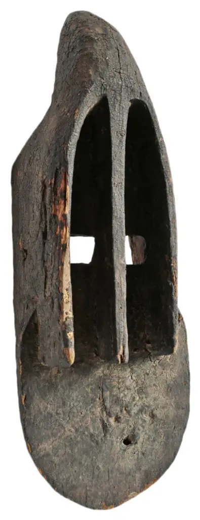 Consigned authentic old Dogon Mali mask with traditional geometric shaped eyes and top horn. Original patina and signs of age and use.Condition: Great, with signs of age and useOrigin: MaliEra: Late 1800''s