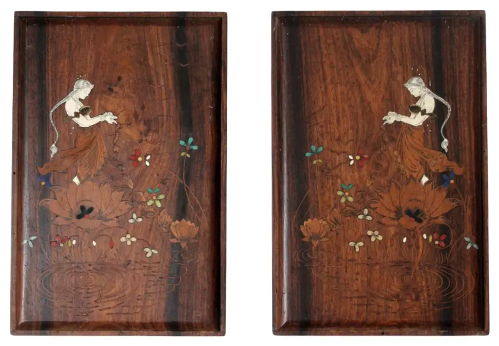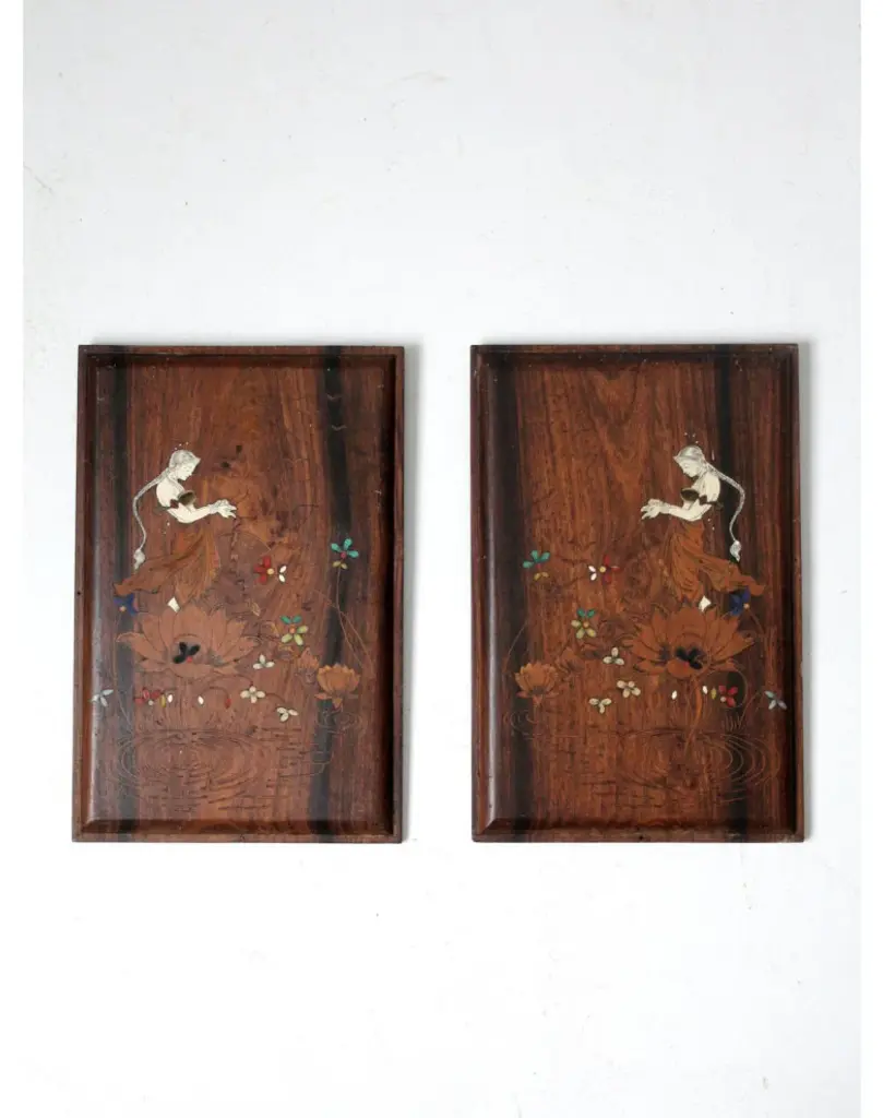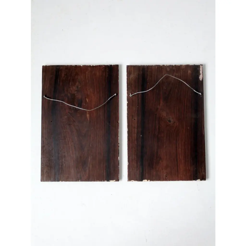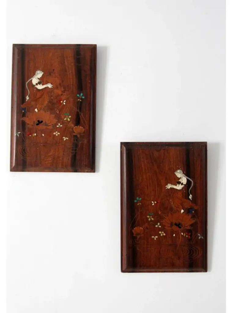 This is a pair of vintage wooden plaque wall hangings. Romantic, art nouveau styled etchings of floral goddess or nymphs decorate the wood panels with painted accents. They have wire back hangs.CONDITIONIn good condition with wear consistent with age and use. Some small nicks in the wood.MEASUREMENTSHeight: 15" .. 38.1 cmWidth: 9.875" .. 25.1 cmDepth: 5/8" .. 1.6 cm