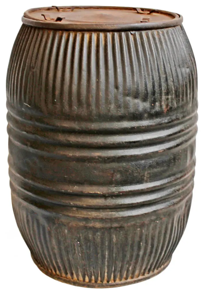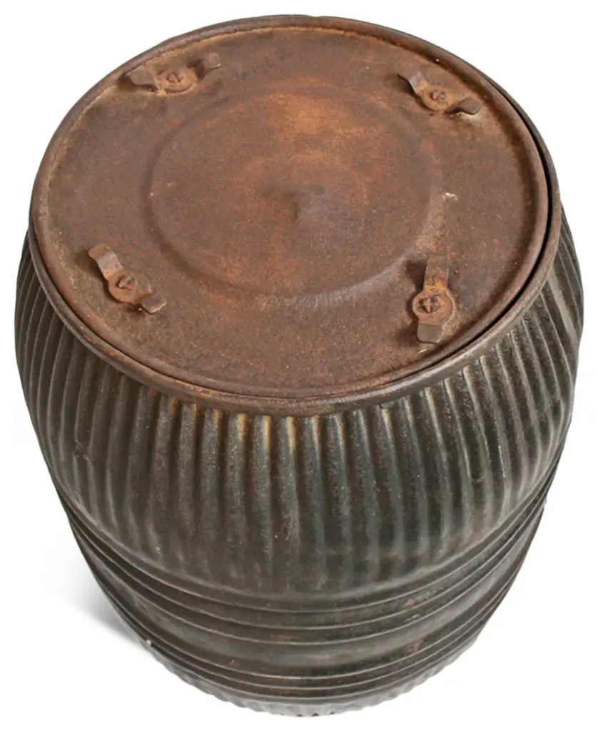 Vintage iron grain barrel from North India with removable lid. Solid construction and great for display or functional container for plants and trees. Can be used outdoors or indoors. Great addition to a farmhouse, rustic, or industrial style space. Lots of character with signs of age to be cherished.Condition: Signs of age and useOrigin: IndiaEra: Mid 1900''s