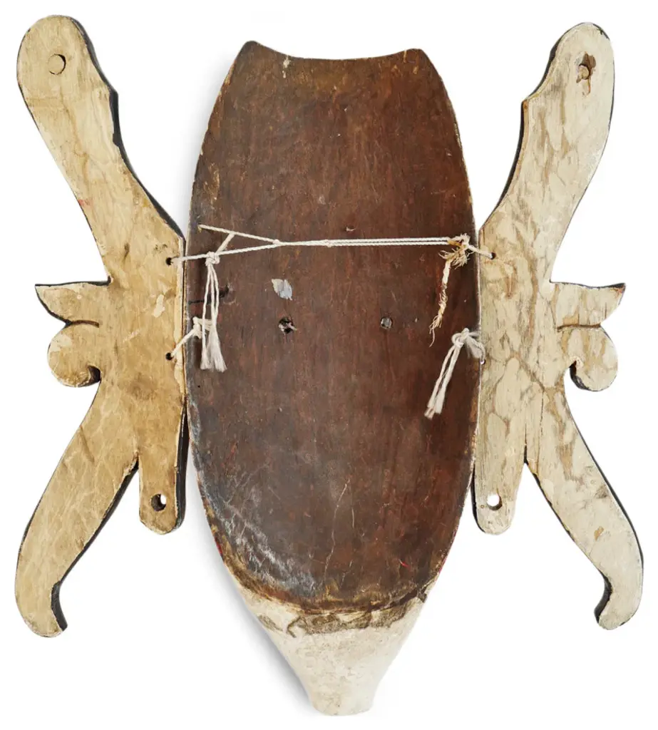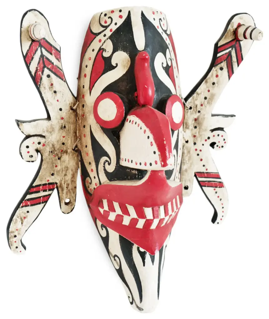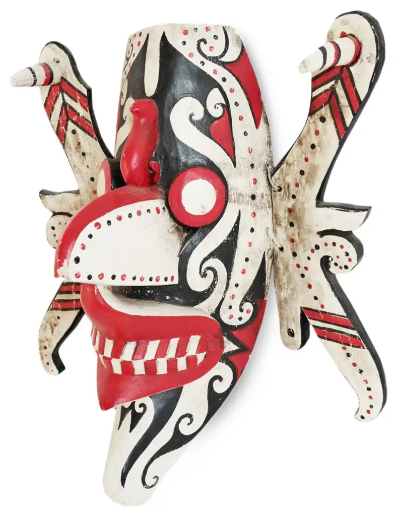 Consigned original Hudoq Dayak mask from Borneo. These traditional Indonesian masks were painted in striking red , black and white pigments representing crop destroying pests and are used during the village thanksgiving festival each year. The dance ends with humans chasing away the bad masked pests to protect the fields and rice paddies while praying for an abundant harvest. Signs of age and use with winged sides and wire on back ready to hang in your display collection.Condition: Great, with signs of age and useOrigin: IndonesiaEra: Mid 1900''s