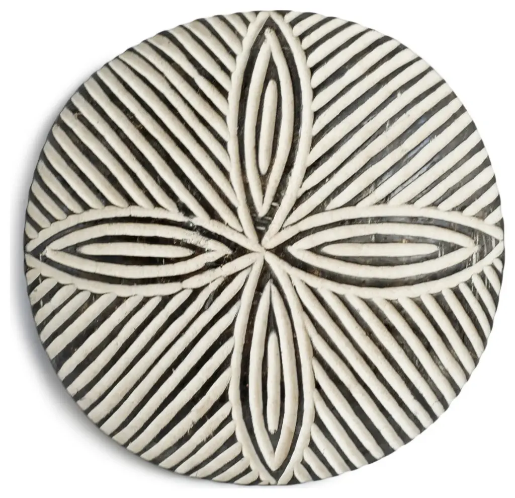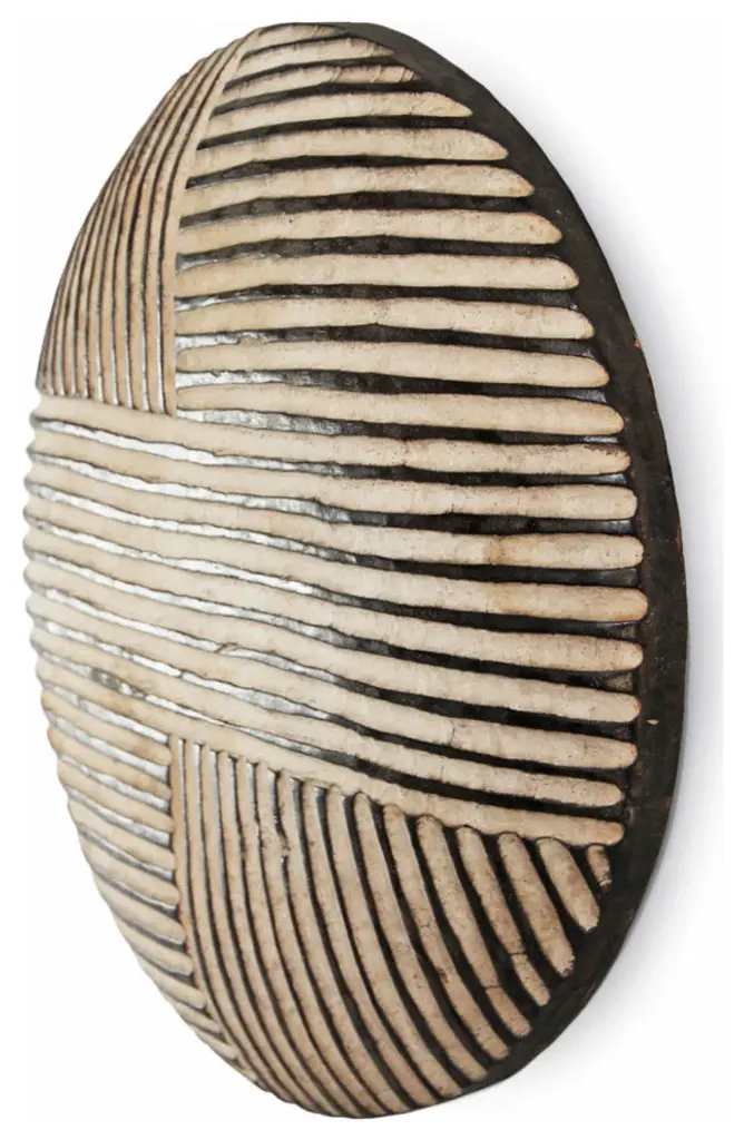 Consigned Zulu shield. Traditional round South African Zulu shields date back to King Shaka Zulu and have been used by tribesman in battle for hundred of years. As the modern world has evolved so to has the Zulu tribesman. These shields are no longer used in battle but instead used for traditional Zulu ceremonies such as weddings in telling historic ancestry stories. These carved wood designs painted in bold black and white patterns continue to have a striking modern form displayed in groupings. Each may vary slightly due to unique hand carvings. Comes with hook attached on back for hanging on wall. Antique white finish.Condition: Great, with signs of age and useOrigin: South AfricaEra: Late 1900''s