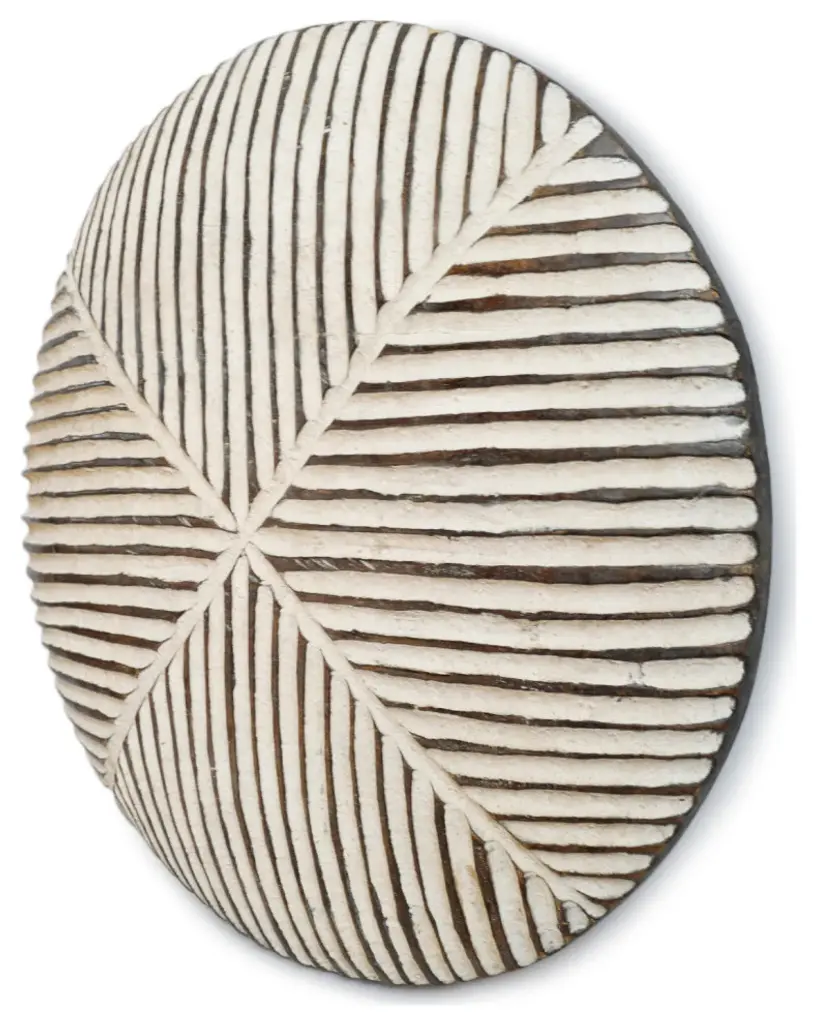 Consigned round Zulu shield. Traditional round South African Zulu shields date back to King Shaka Zulu and have been used by tribesman in battle for hundred of years. As the modern world has evolved so to has the Zulu tribesman. These shields are no longer used in battle but instead used for traditional Zulu ceremonies such as weddings in telling historic ancestry stories. These carved wood designs painted in bold black and white patterns continue to have a striking modern form displayed in groupings. Each may vary slightly due to unique hand carvings and natural imperfections/signs of age are to be expected. Comes with hook attached on back for hanging on wall. Antique white finish.Condition: Great, with signs of age and useOrigin: South AfricaEra: Late 1900''s