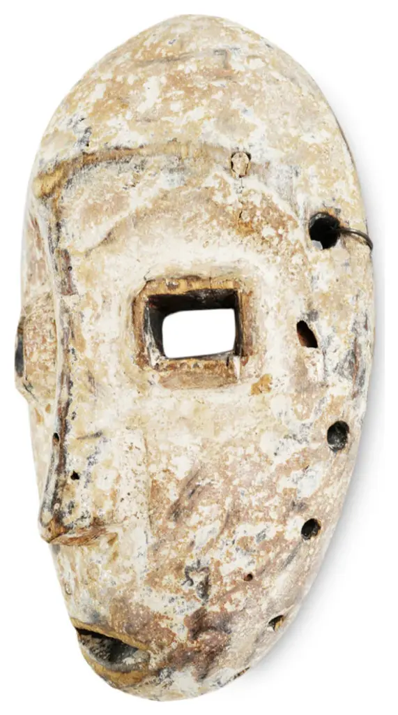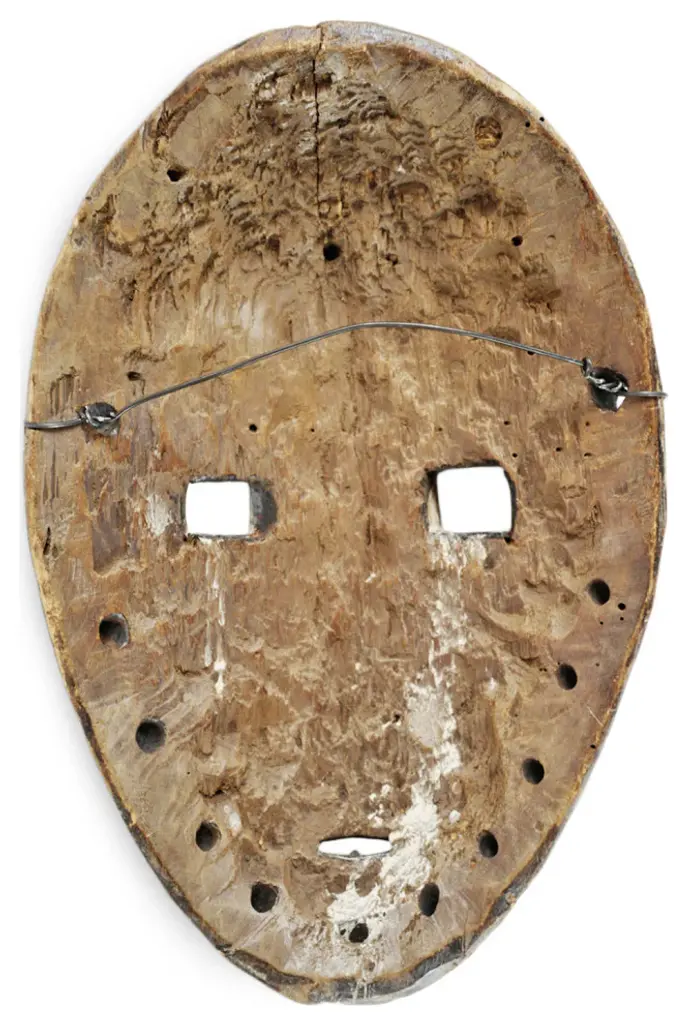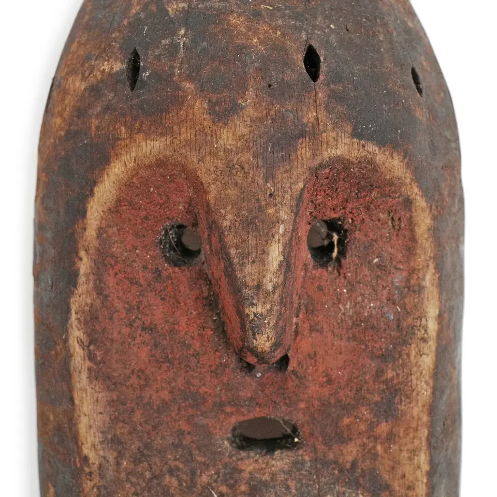 Consigned vintage Democratic Republic of Congo Kumu initiation mask. Beautiful aged white clay patina over carved wood. Stylized geometric features. Characteristic signs of age and use. Perfect displayed as wall art in a grouping of masks or on its own.Condition: Signs of age and useOrigin: Democratic Republic of CongoEra: Mid 1900''s