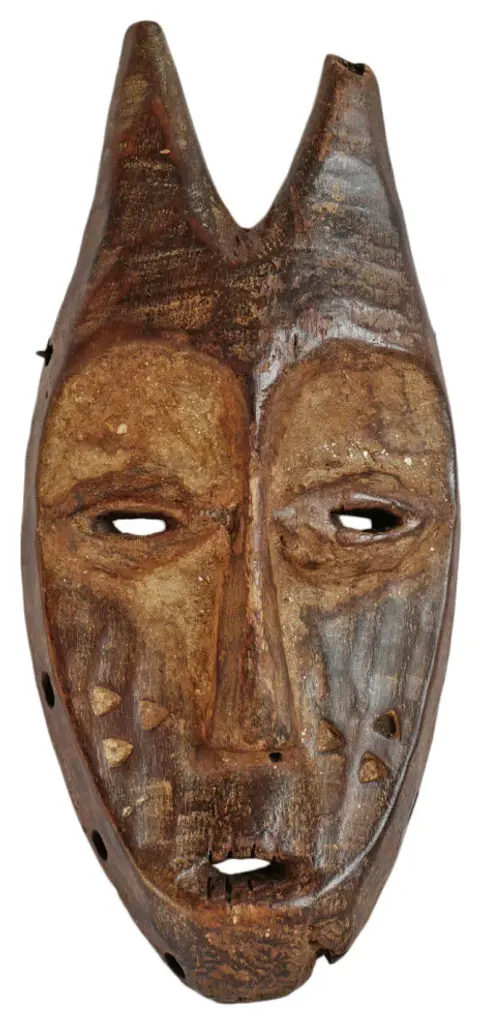 Consigned vintage Lega mask from Democratic Republic of Congo. Traditional stylized features and beautiful signs of age and use. Traditionally used as identification symbol or for initiation purposes.Condition: Great, with signs of age and useOrigin: Democratic Republic of CongoEra: Mid 1900''s