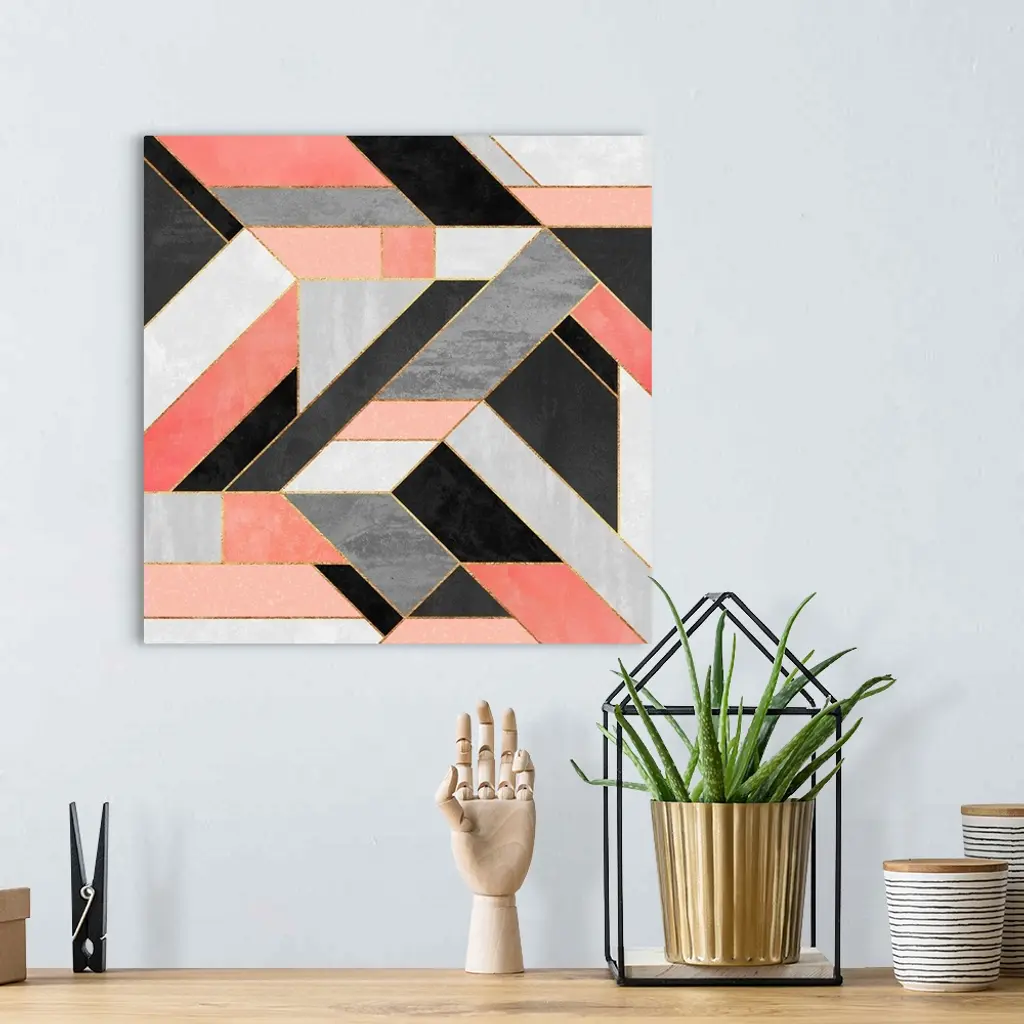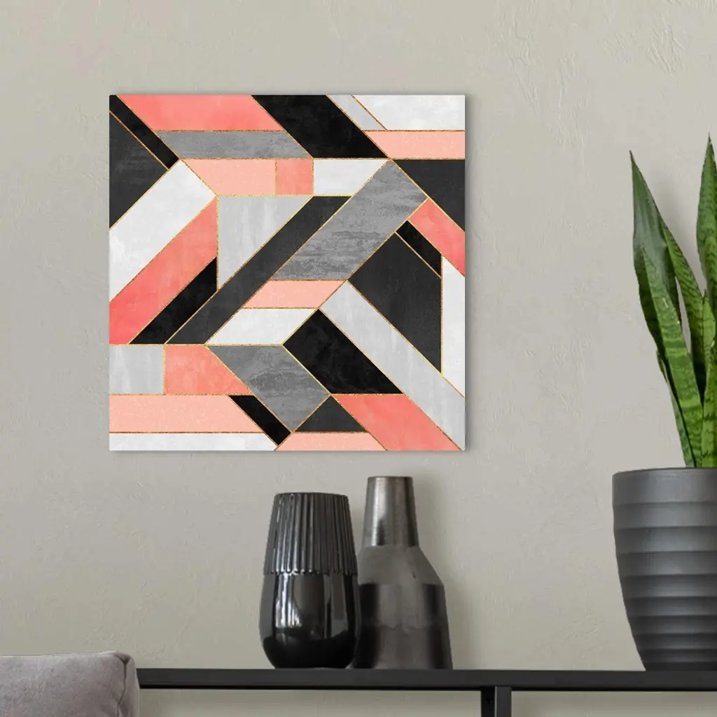 A contemporary, geometric, diagonal art deco design in shades of grey, pink, white and gold.