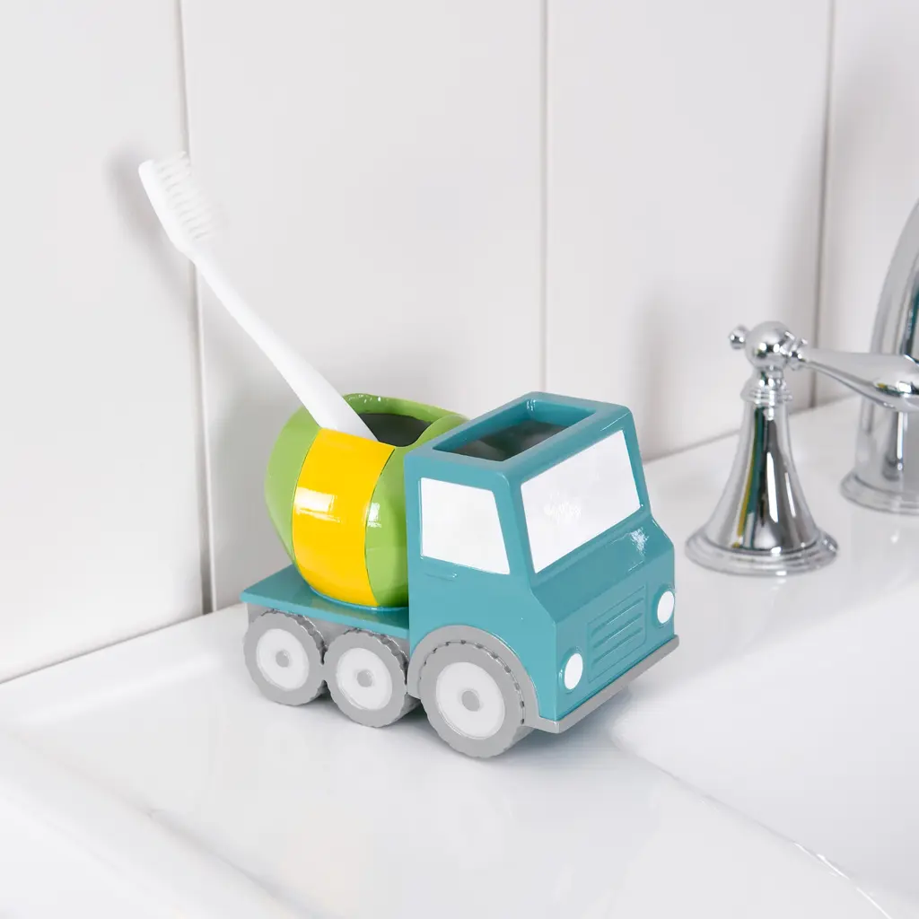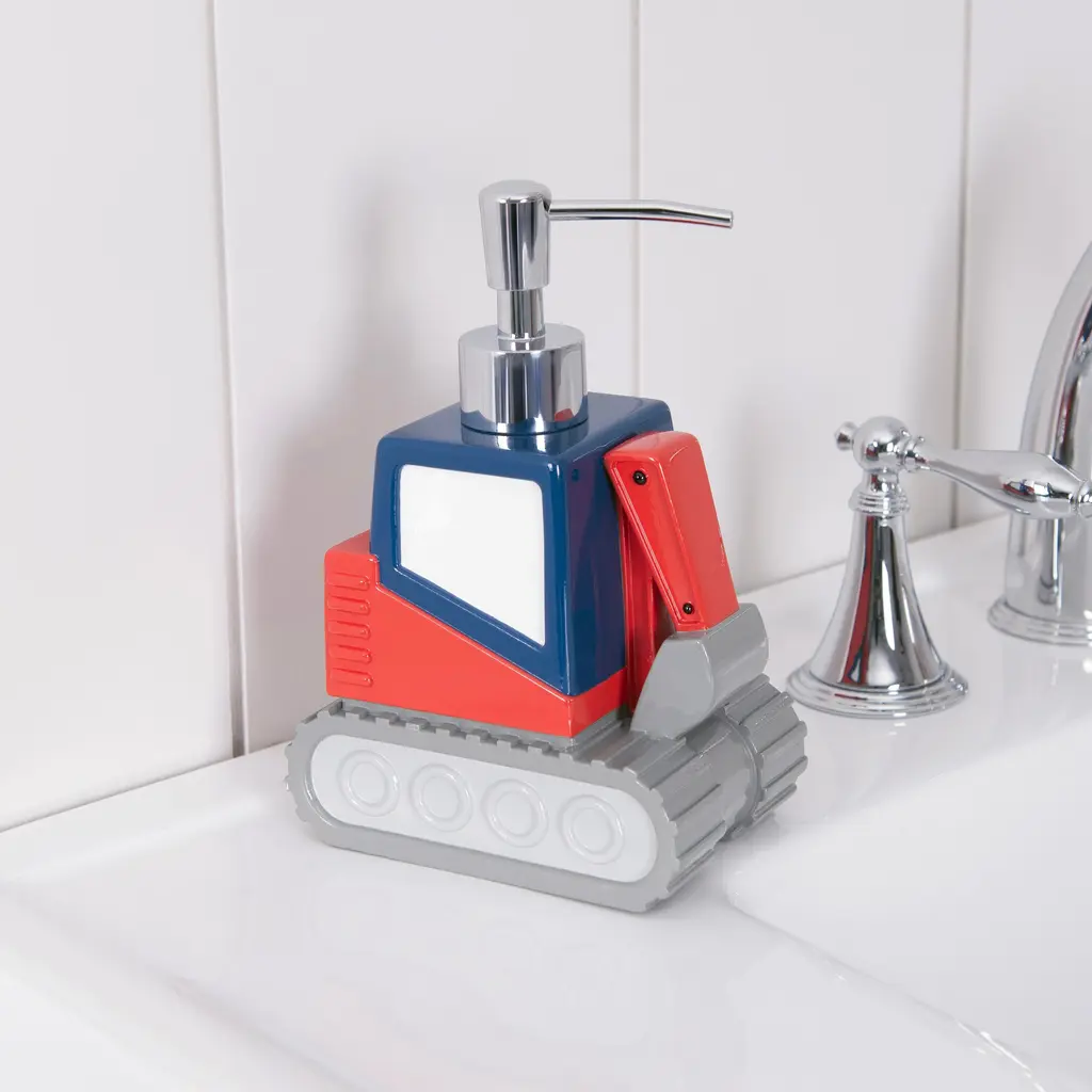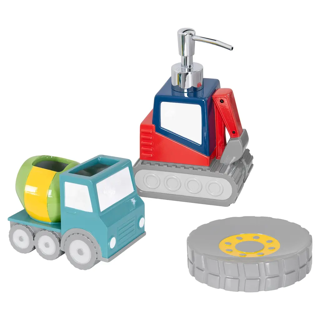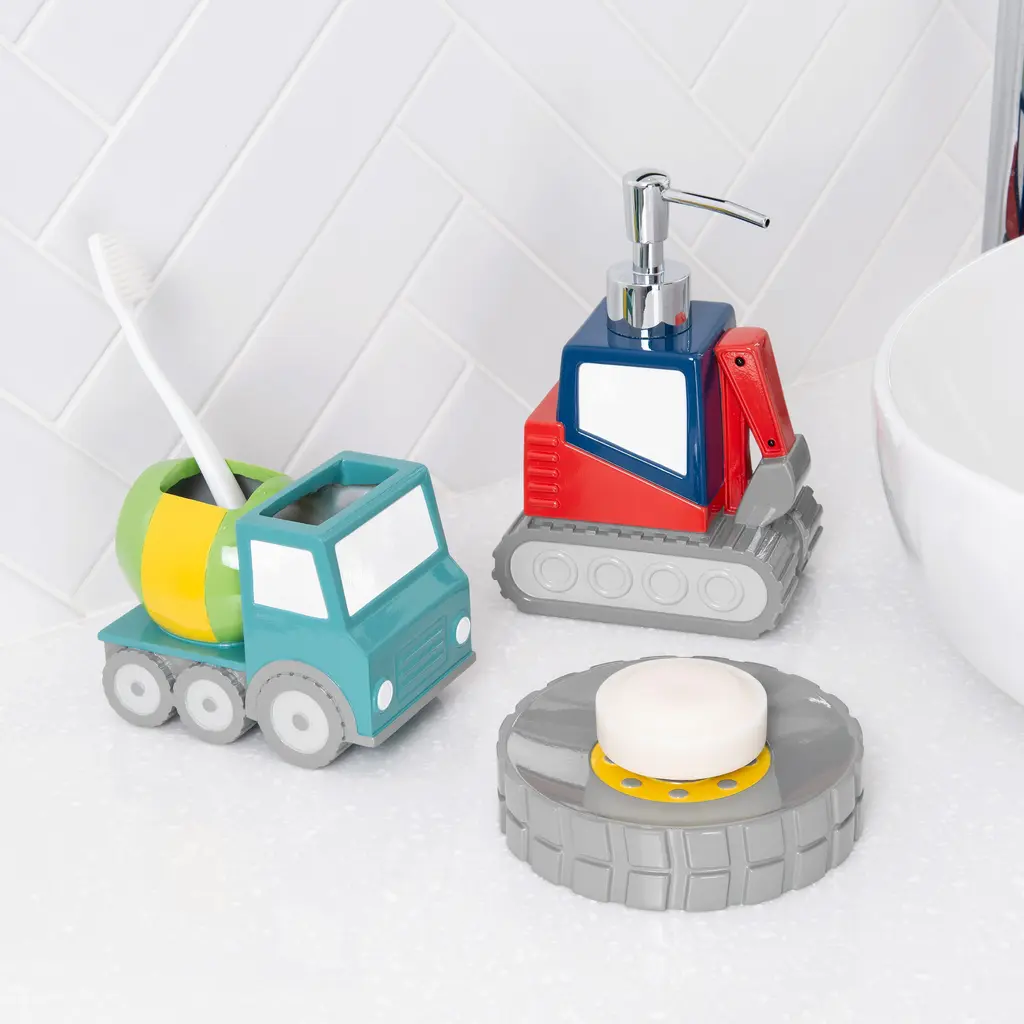 Spark your little one's imagination by transforming their bathroom into a lively construction site with the Constructing 3-Piece Bath Accessory Set by Allure Home Creation. The set includes a Soap/Lotion Pump with a Plastic Chrome Finish Pump Head, Toothbrush Holder, and Soap Dish. Each creatively shaped piece of this construction site themed collection is made of handpainted resin in striking multi-colored brights. Your big machine enthusiasts will dig this novelty accessory set making their bathroom routine more fun-filled and entertaining. Hand Wash, Spot or Wipe Clean. Complete the look by coordinating with other pieces in the Constructing Bath Collection or use alone.