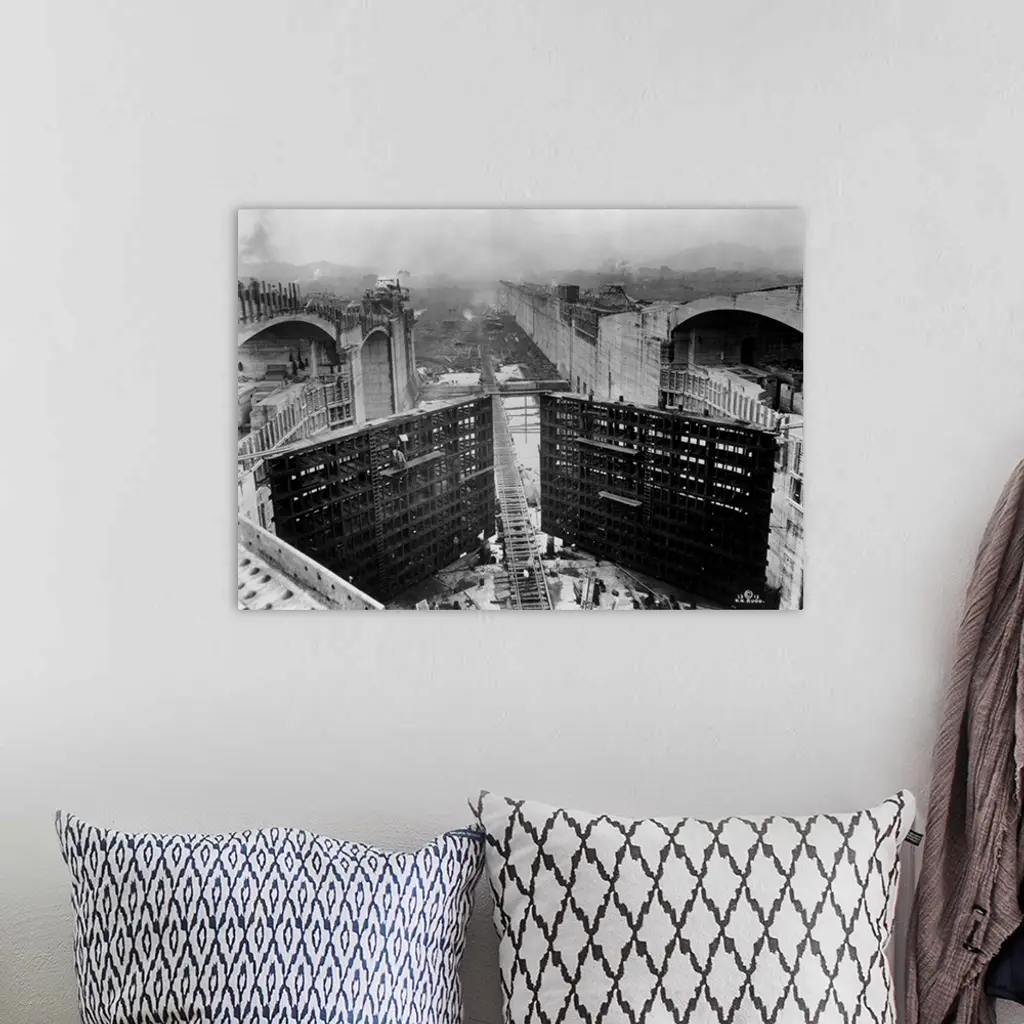 Overview of the construction of canal locks and gates for the Panama Canal. Panama, 1913.
