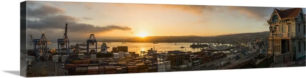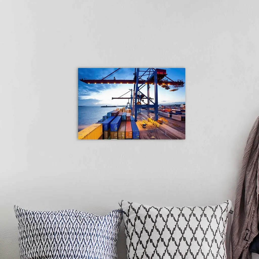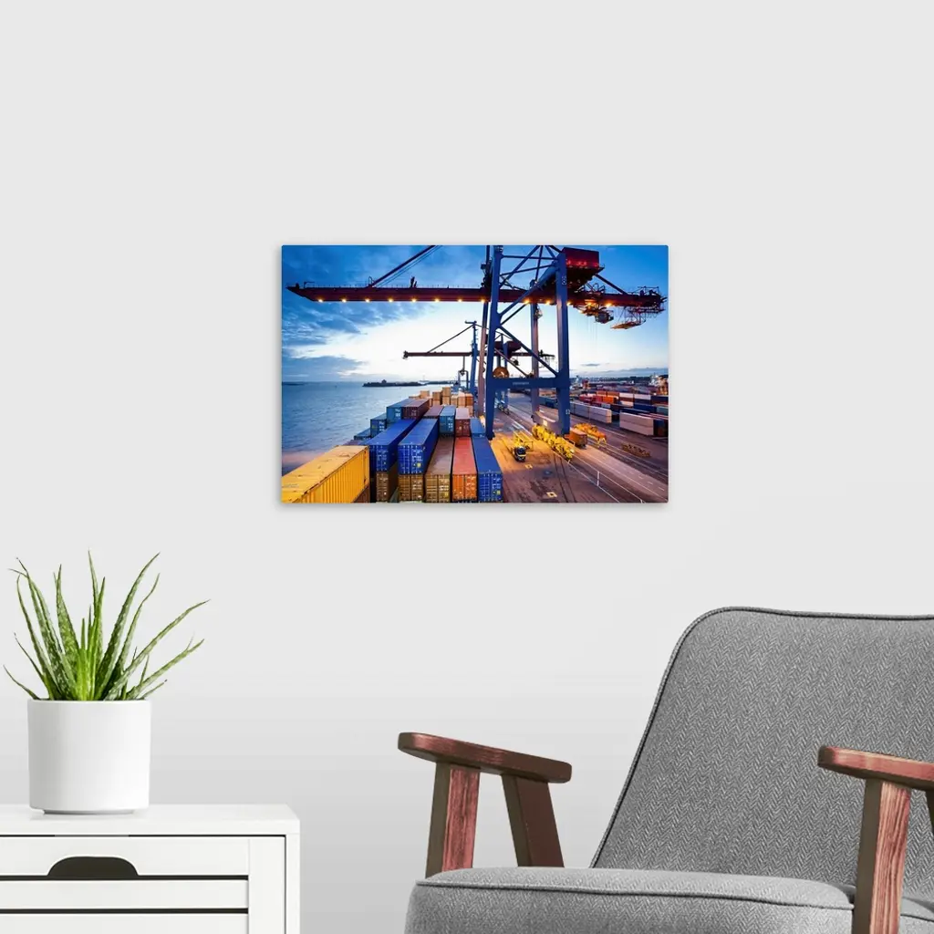 Container terminal at dusk, view from cargo ship