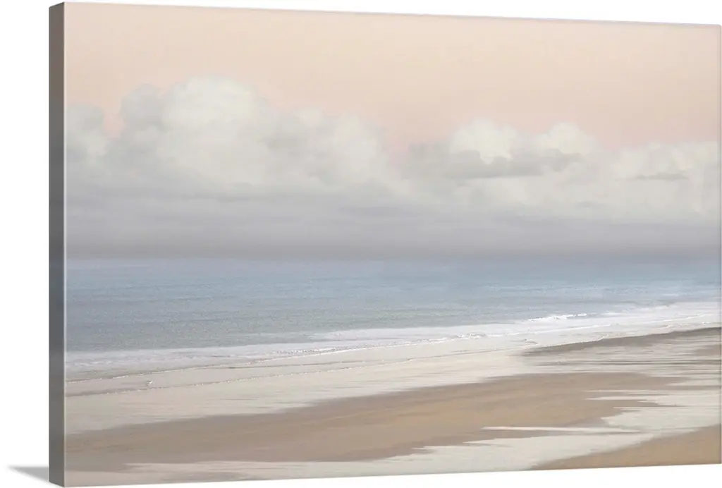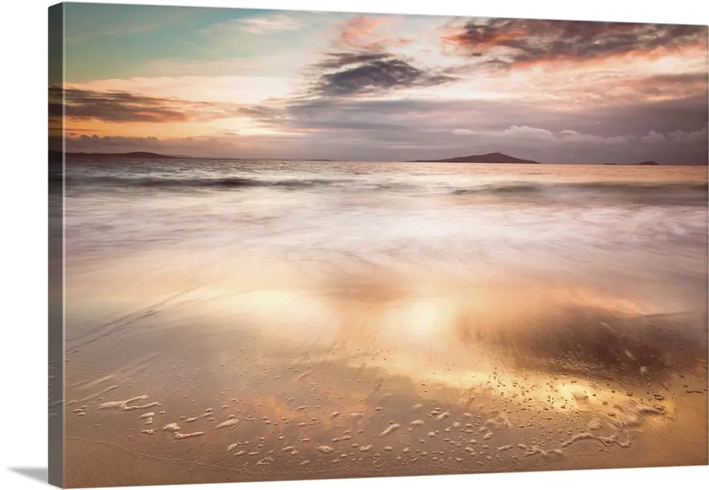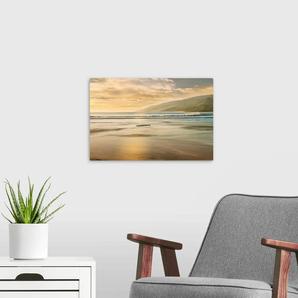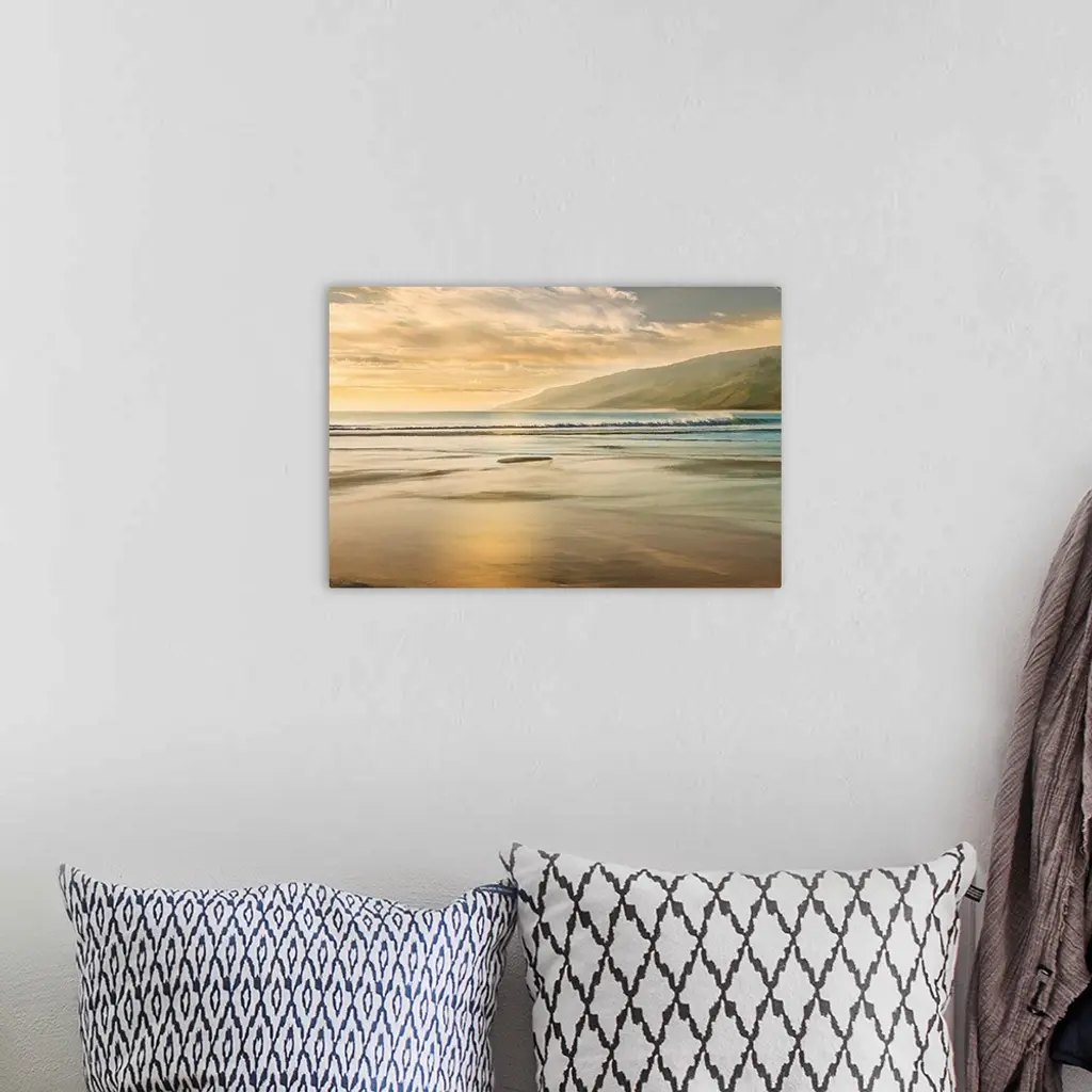 Photograph of a shore with beautiful lighting and mountains in the background.