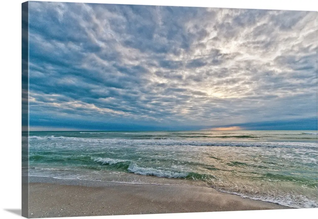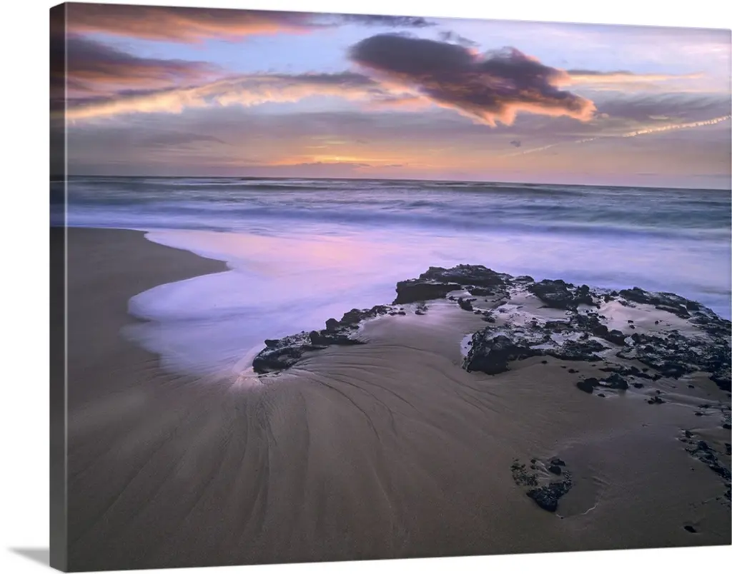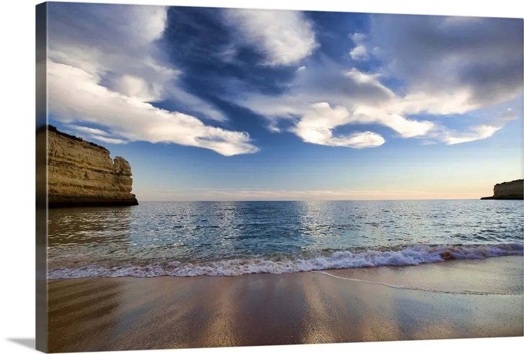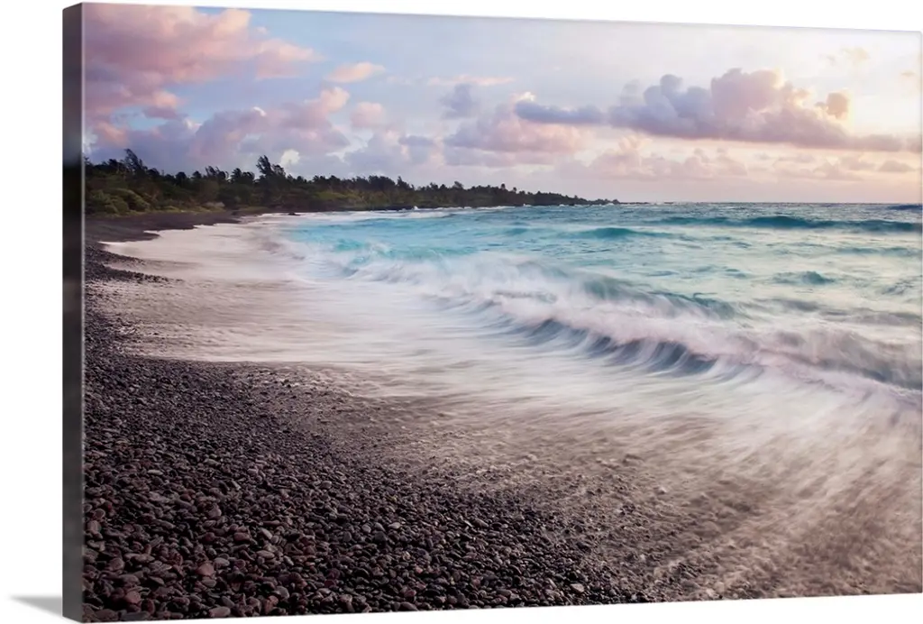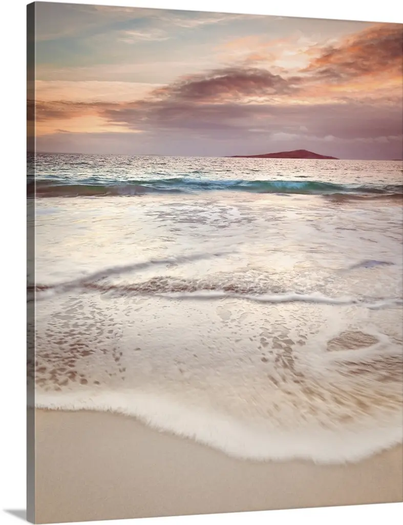 Photograph of a shore with beautiful lighting and mountains in the background.