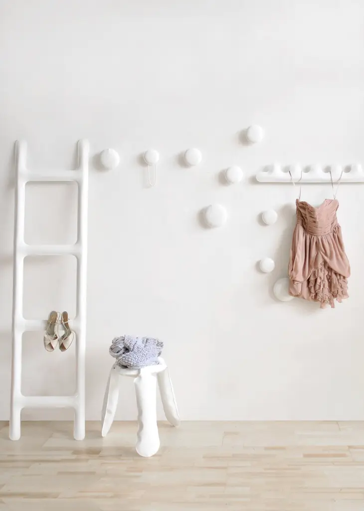 "Drab" Contemporary Hanger by ZietaOriginal Zieta hanger, delivered with certificate. Collection: Zieta collection Material: Carbon steel powder-coated Color: RAL 9003 white glossySize: H: 188 cm W: 46 cm Coat hanger, available in different sizes, welded and inflated very carefully under high pressure to create unique bulges and waves. Drab can be used for hanging coats, shawls, jewelry, bags and other accessories.Zieta is best known for his collection of stools “Plopp” made through the technologist Fidu. With the same principle Zieta Prozessdesign conceived mirror collections made of stainless steel called “Tafla”, “Rondo” and “Rondel”. Two laser-cut metal sheets are first welded together before air is injected between them until they separate from each other forming a three-dimensional object.