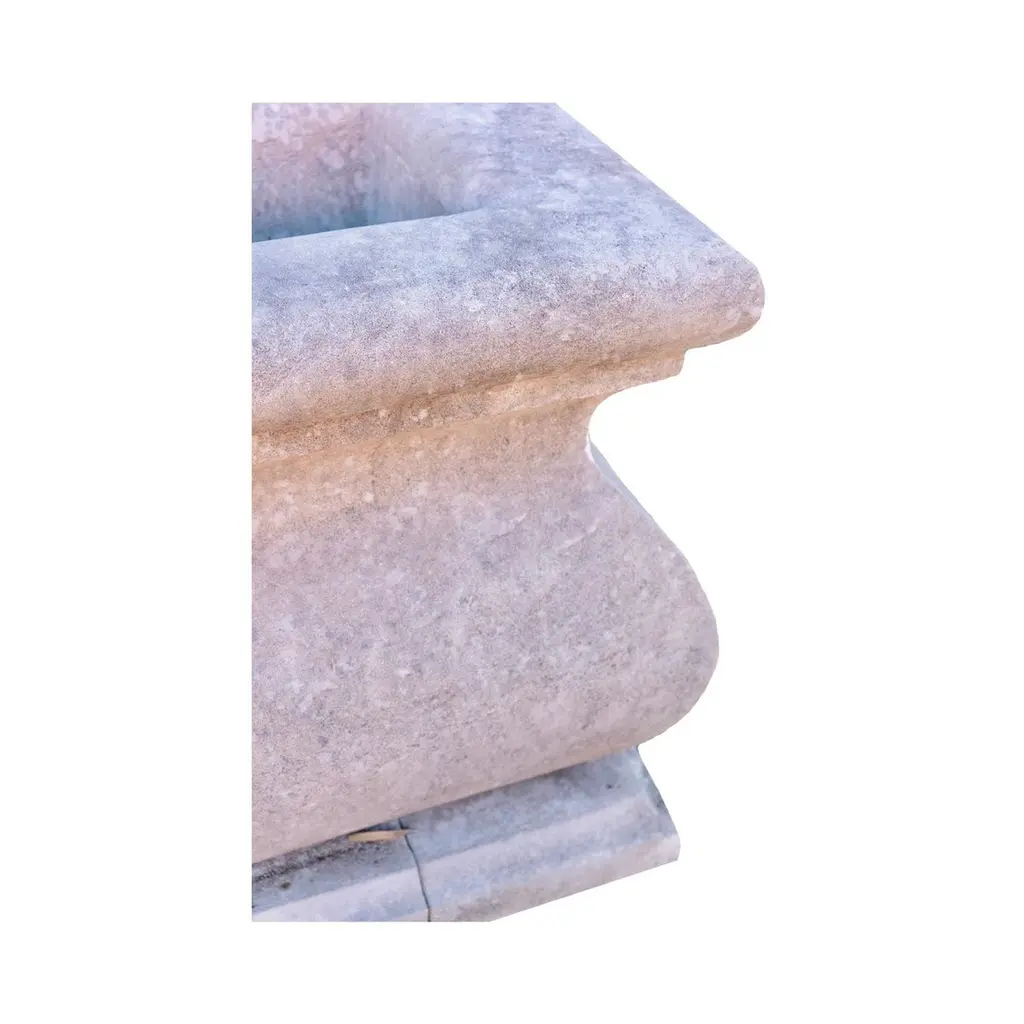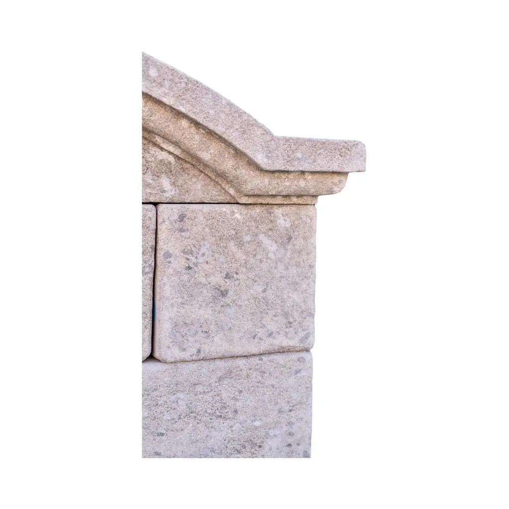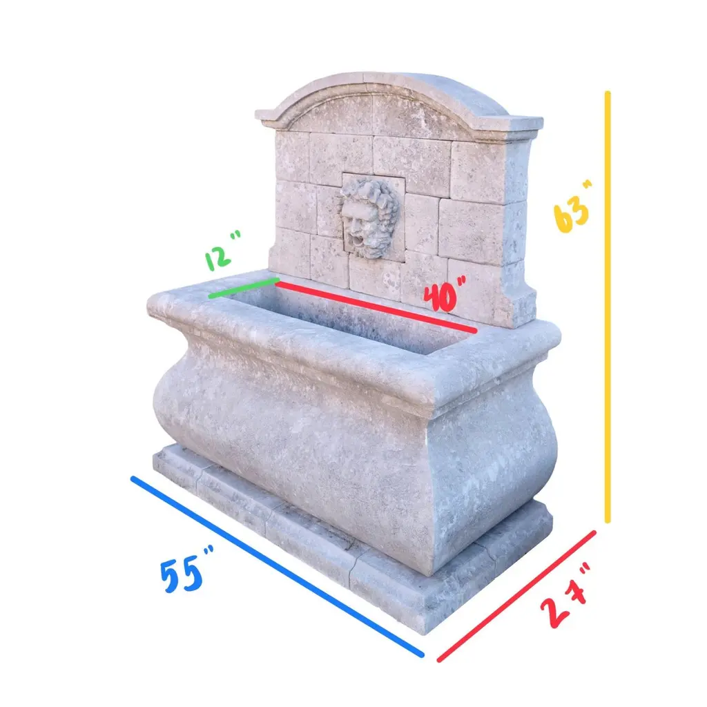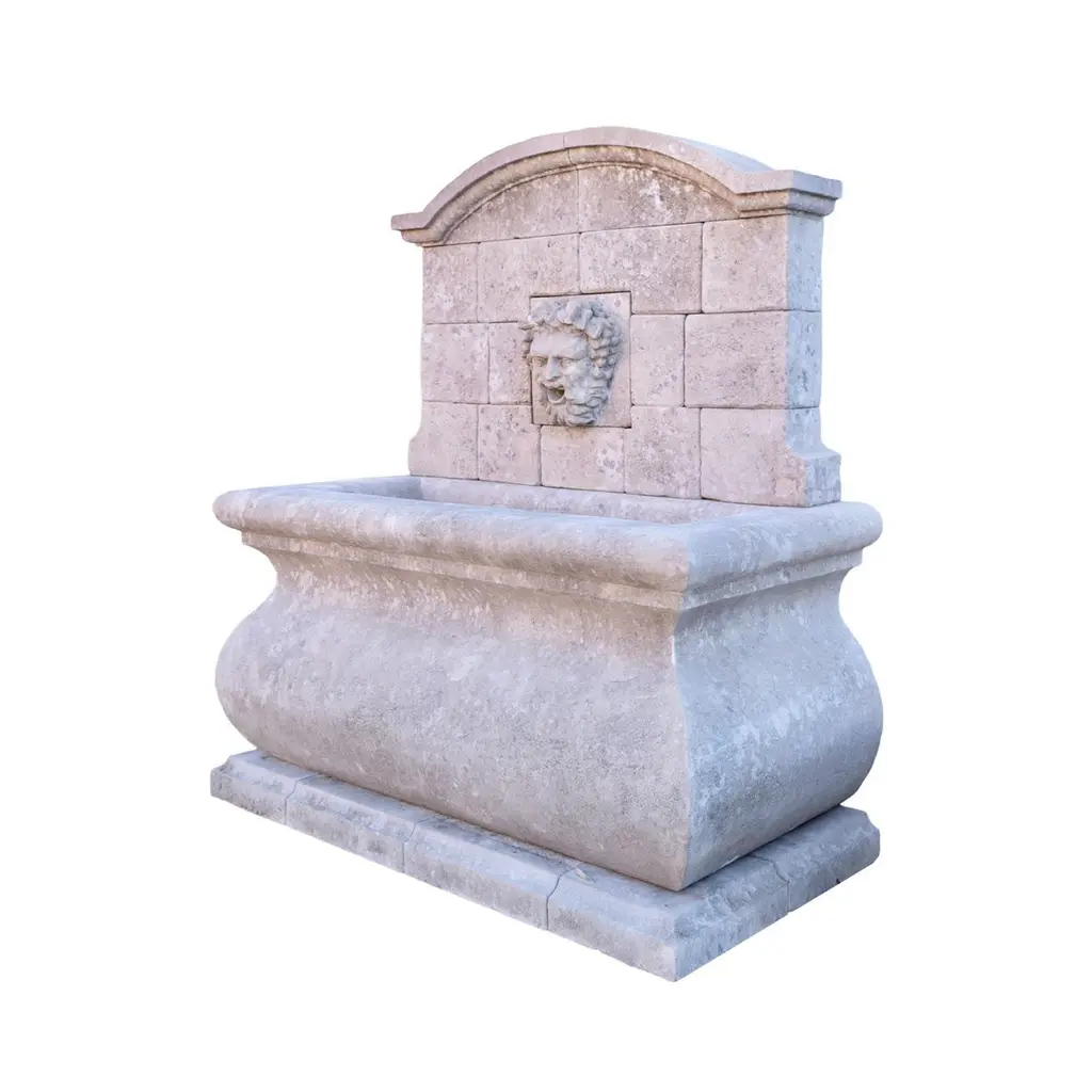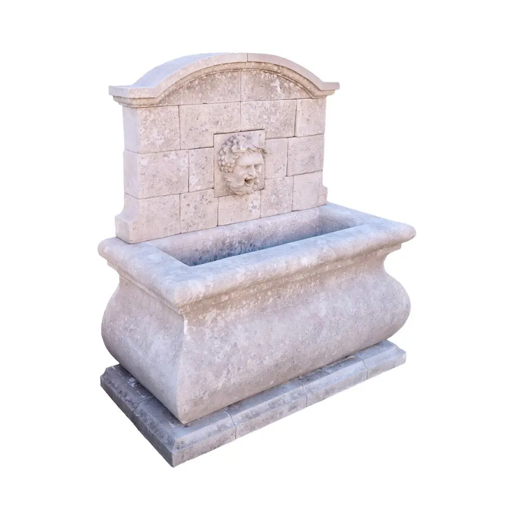 A contemporary hand-carved limestone wall fountain from France, featuring a refined blend of classical and modern design. The fountain boasts a tall, rectangular basin with elegantly curved edges, resting on a flat foundation that elevates its presence for a striking visual effect. The wall panel is crowned with a gracefully carved arched top, adding architectural depth. At its center, a meticulously sculpted Bacchus face serves as the focal point, with water flowing from its open mouth into the basin below. This exquisite fountain embodies timeless elegance, making it a sophisticated addition to any space.