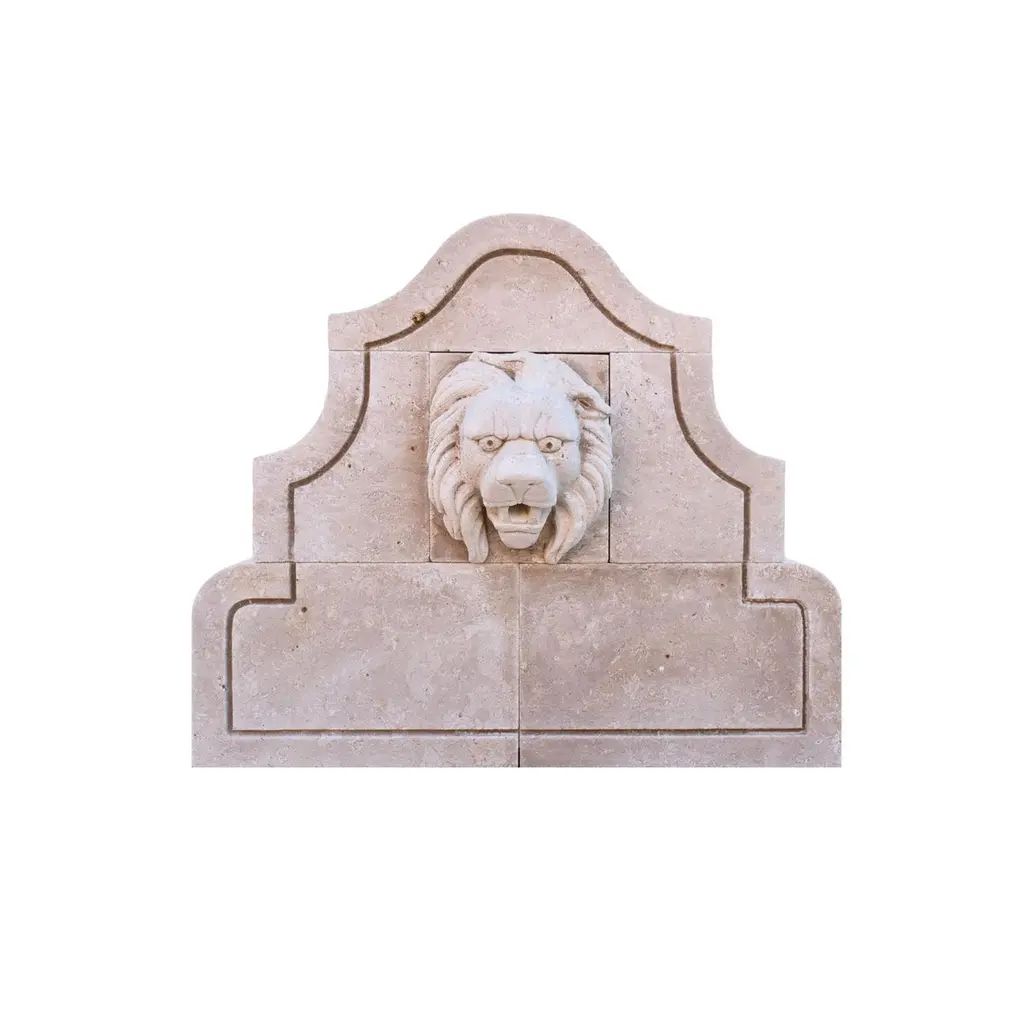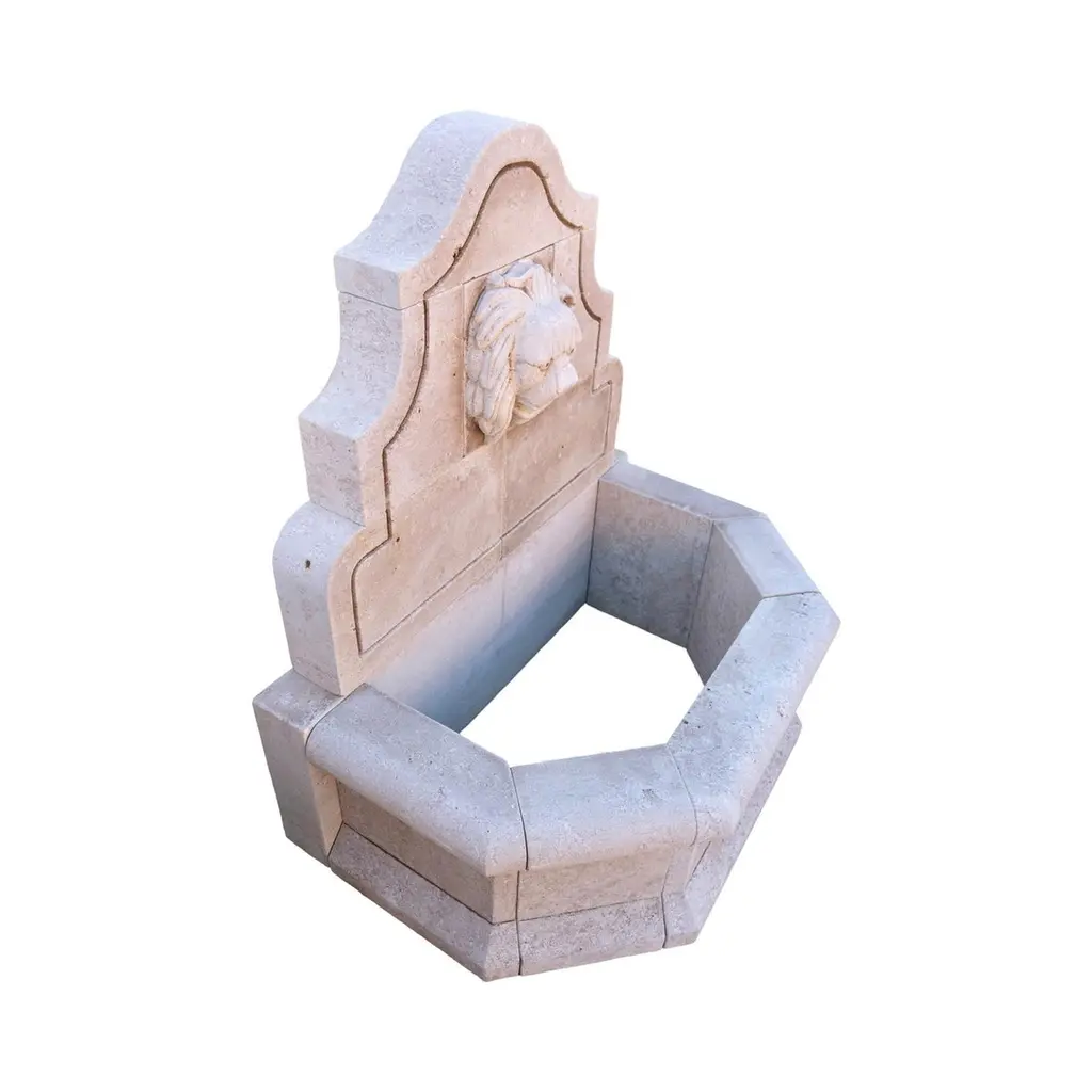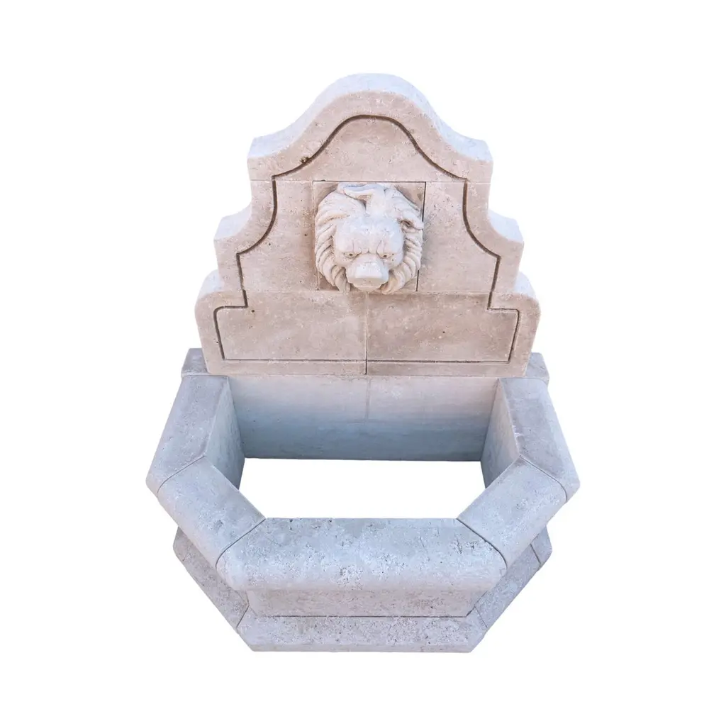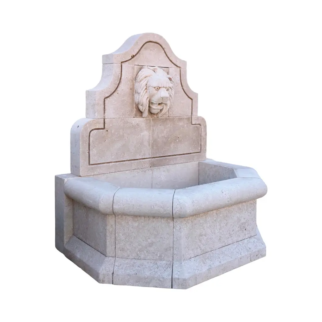 A contemporary hand-carved limestone wall fountain from France, blending geometric precision with classical elegance. The basin features a unique geometric edge design with smooth, sculpted curves, while the wall panel is adorned with gracefully carved arches. At the center, a striking lion head spout serves as the focal point, allowing water to cascade into the basin below. Delicate hand-carved linework enhances the panel, adding depth and refinement. Compact in size, this fountain is a timeless statement piece, perfect for adding charm and sophistication to any setting.
