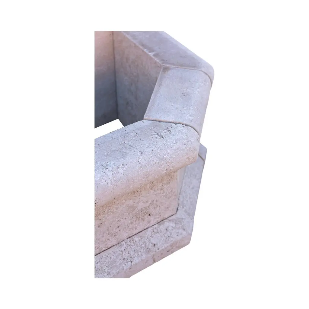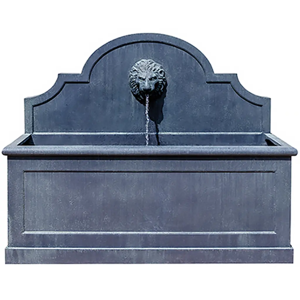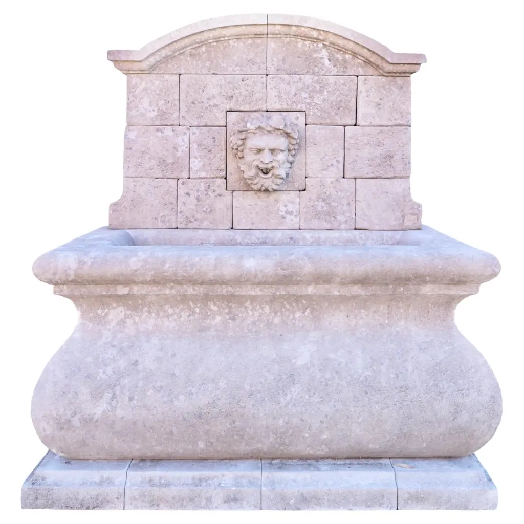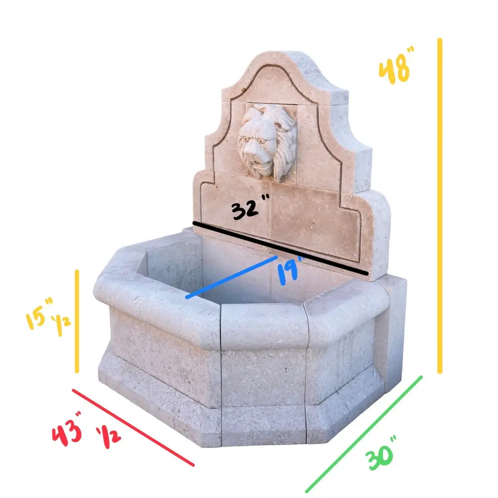 A contemporary hand-carved limestone wall fountain from France, blending geometric precision with classical elegance. The basin features a unique geometric edge design with smooth, sculpted curves, while the wall panel is adorned with gracefully carved arches. At the center, a striking lion head spout serves as the focal point, allowing water to cascade into the basin below. Delicate hand-carved linework enhances the panel, adding depth and refinement. Compact in size, this fountain is a timeless statement piece, perfect for adding charm and sophistication to any setting.