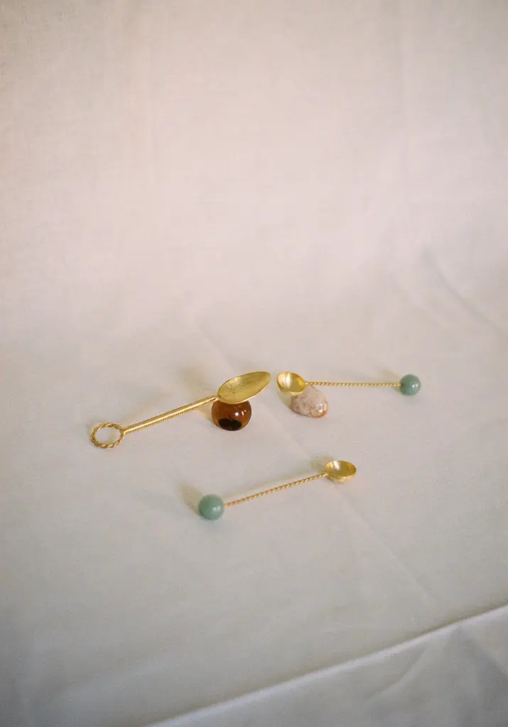 Contemporary Gold Plated Spoon Set Green Quartz Stone Handcrafted Natalia Criado