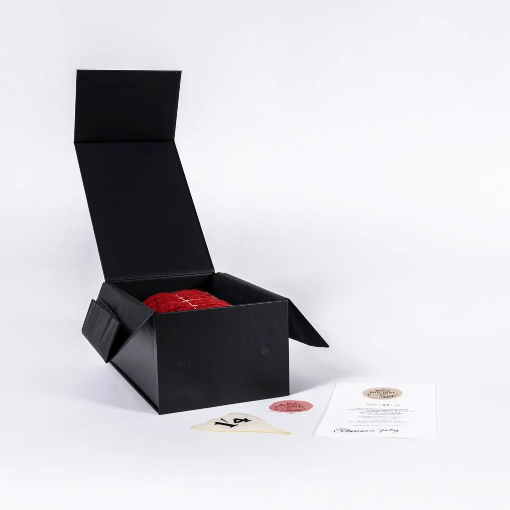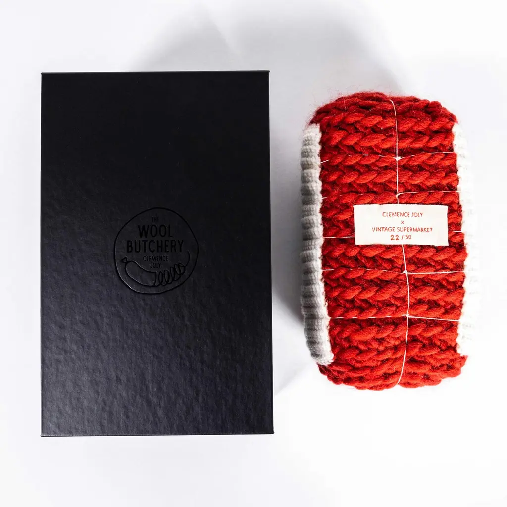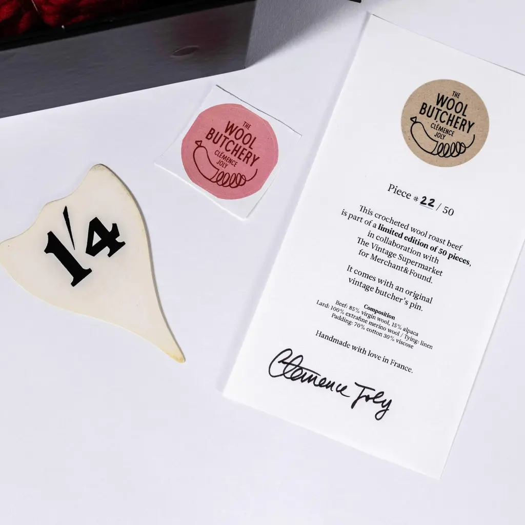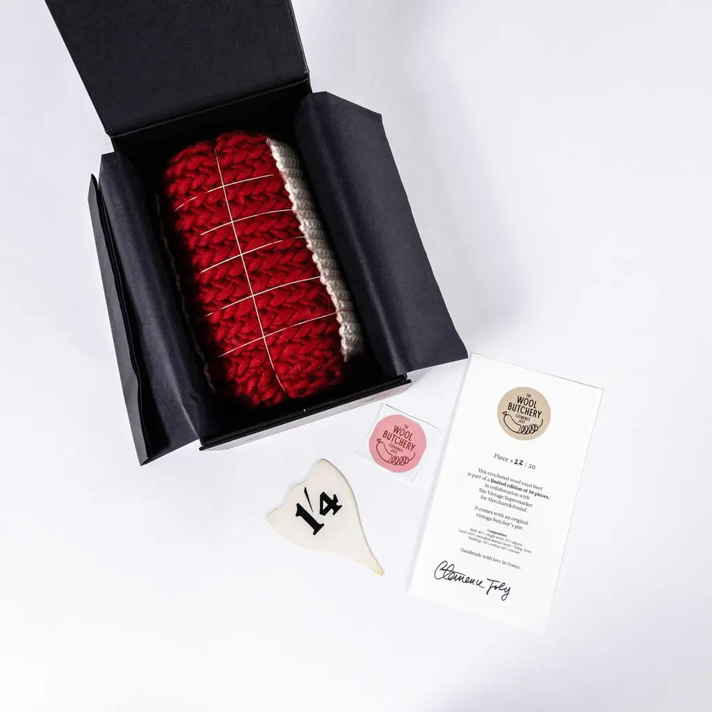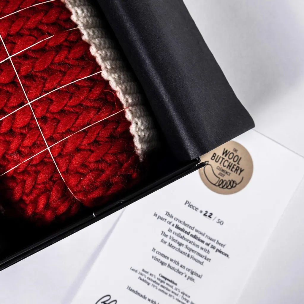 Contemporary Hand Knitted Roast Beef - Clemence Joly. Clemence Joly lives and works in Paris. Clemence graduated as a graphic designer from Ecole Nationale Superieure D'Arts Appliques et des Metieres D'Art, and from the Chelsea School Of Art and Central Saint - Martins. Clemence is an internationally renowned textile artist who was commissioned by Merchant & Found to bring wit and life to our Vintage Supermarket. Clemence took part in our inaugural Vintage Supermarket event in London and we are very proud to be partnering with her to bring to the market her hand crocheted butchers products. The listing is for one 'Roast Beef' crocheted by hand using wool in Clemence's studio and presented in a superb gift box with a certificate of authenticity from Clemence and with the addition of an original vintage price label. There are additional inspirational images from our Vintage Supermarket, showing the contemporary maker and their works created for our event – these are additional images for inspiration, the listing is for the specific product only as described.Workshop Report:Contemporary product crocheted by hand using wool in Clemence’s studio. The ‘beef’ should be treated as a unique wool product and washing should be avoided. To remove any marks use proprietary products suitable for wool only.Date:21st CenturyMaker:Handmade – FranceDimensions:12cm(w) x 19cm(l) x 8cm(h)
