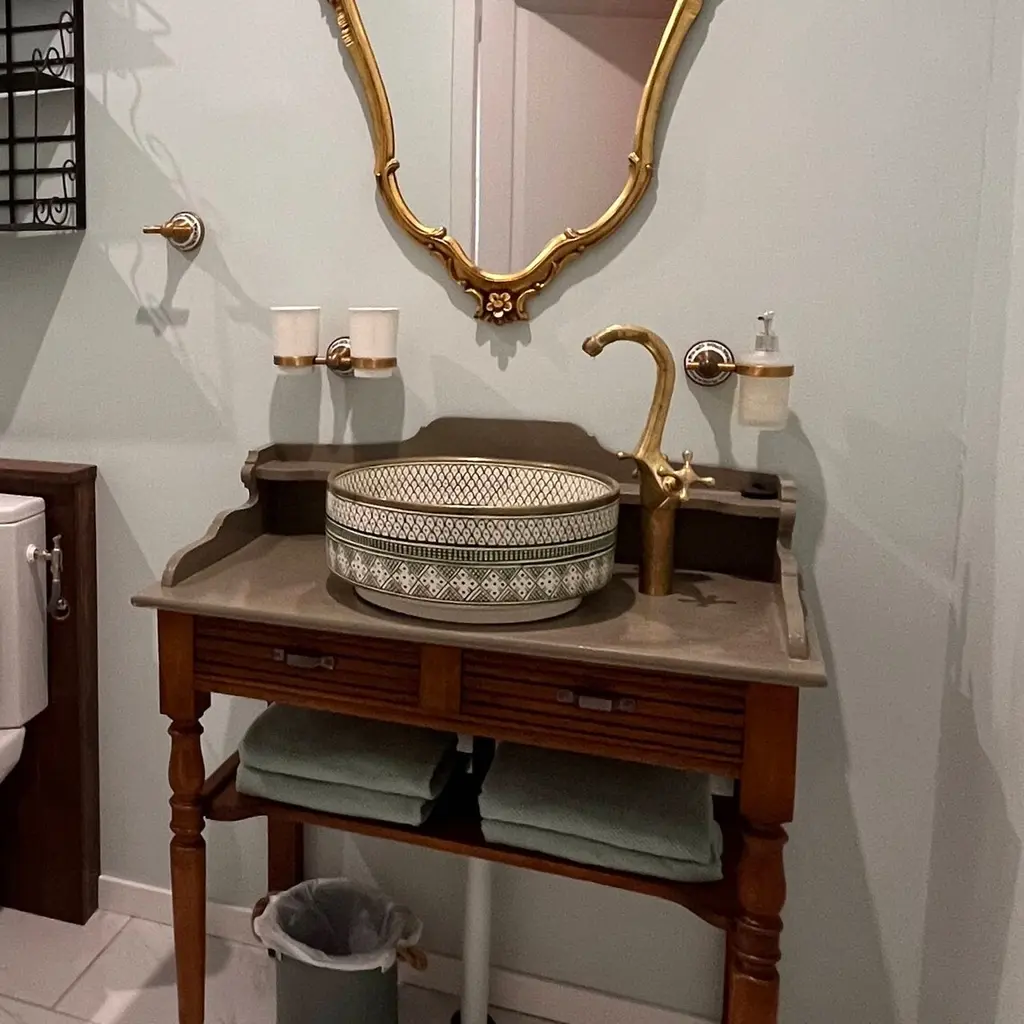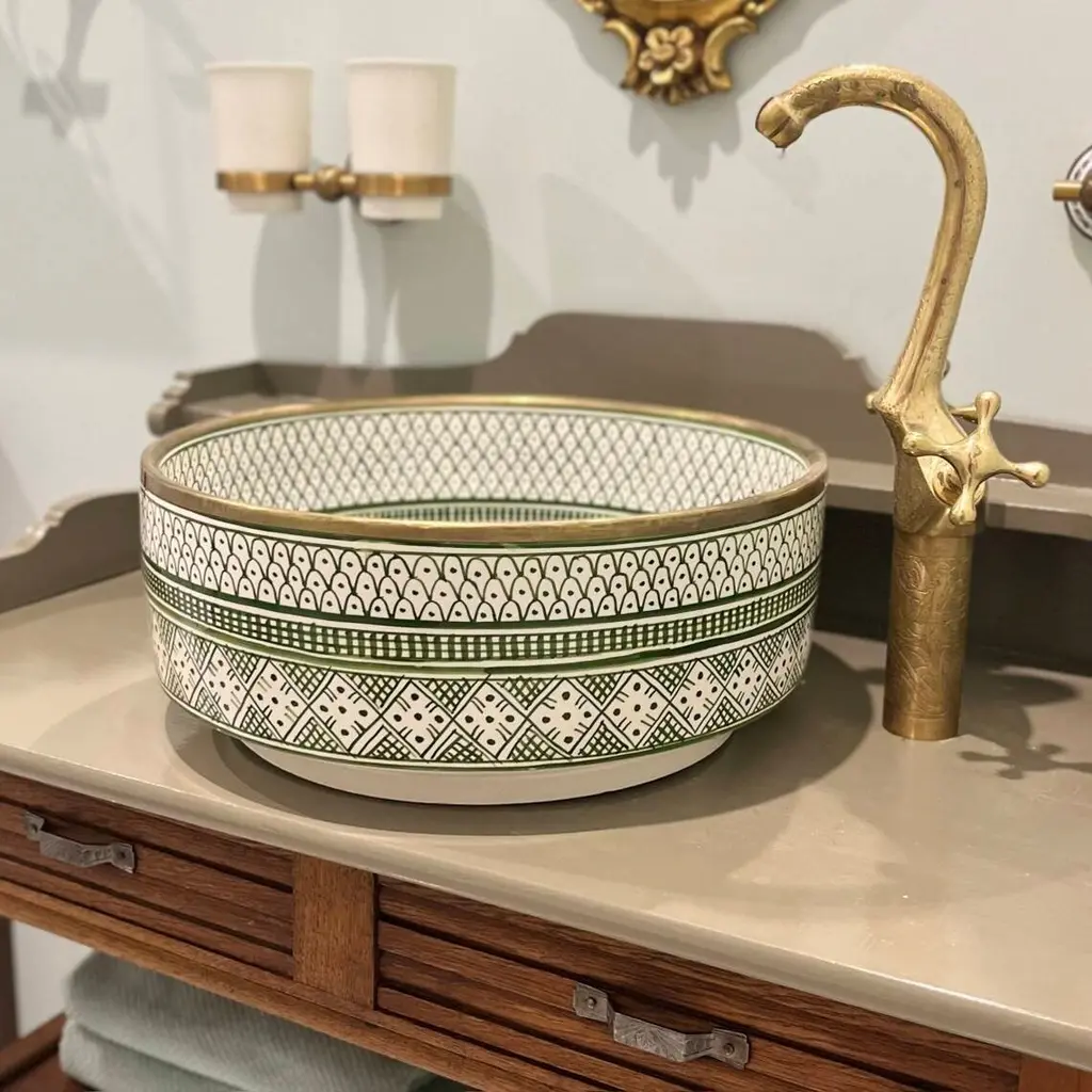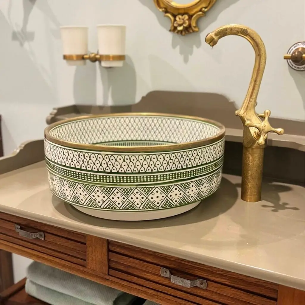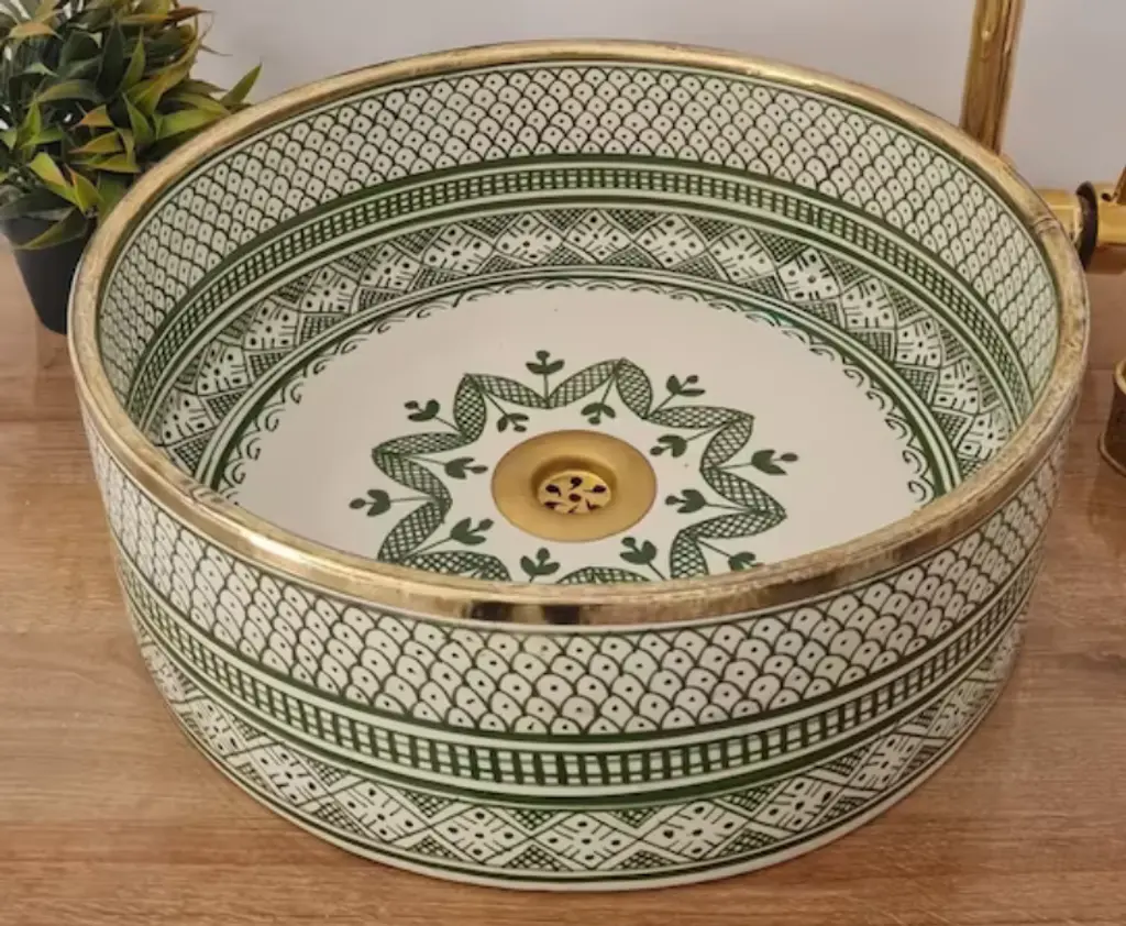 Introducing our Handcrafted Farmhouse Basin, a stunning blend of mid-century inspiration and artisanal craftsmanship designed to enhance the charm of your bathroom. With its unique brass rim and a beautiful green basin sink, this basin is a standout piece that adds elegance and character to any space. Each basin is meticulously handcrafted, showcasing the skill and attention to detail of our artisans. The brass rim exudes a timeless appeal, adding a touch of vintage sophistication to the design. The green basin sink complements the brass rim perfectly, creating a captivating contrast that catches the eye. The basin's green color brings a fresh and natural vibe to your bathroom, reminiscent of lush greenery and the beauty of the outdoors. It adds a pop of color and a sense of tranquility, transforming your bathroom into a serene oasis where you can unwind and relax. Crafted with high-quality materials, this basin is built to last. The brass rim not only enhances the aesthetics but also ensures durability and longevity. The green basin sink is not only visually striking but also practical, with its smooth surface that is easy to clean and maintain. Designed with a farmhouse style, this basin perfectly complements rustic, vintage, or eclectic bathroom themes. Its mid-century-inspired charm adds a touch of nostalgia and warmth to your space, making it an eye-catching focal point that sparks conversation. Elevate your bathroom décor with our Handcrafted Farmhouse Basin, a masterpiece that combines artistic craftsmanship, timeless design, and functional excellence. Embrace the beauty of the brass rim and the refreshing green basin sink as they effortlessly elevate the style of your bathroom. Create a unique and inviting atmosphere in your home with this exquisite basin. Order yours today and bring the allure of mid-century artistry to your bathroom.