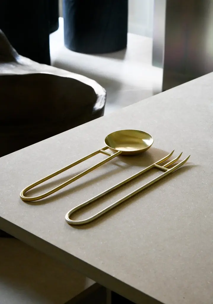 Elevate your dining experience with our artefacto servers. A fork and spoon – meticulously crafted from plated brass. Inspired by geometric forms and ornamental symbolism, this collection effortlessly combines modern aesthetics with subtle nods to craftsmanship and tradition. Each piece draws inspiration from Criado's past work in jewelry design, creating an eclectic fusion of italian and colombian craftsmanship. The result is a set that embodies perfect poise, balance, and weight, making it a unique and stylish addition to your table setting.Color: gold plated brass Handcrafted in Italy