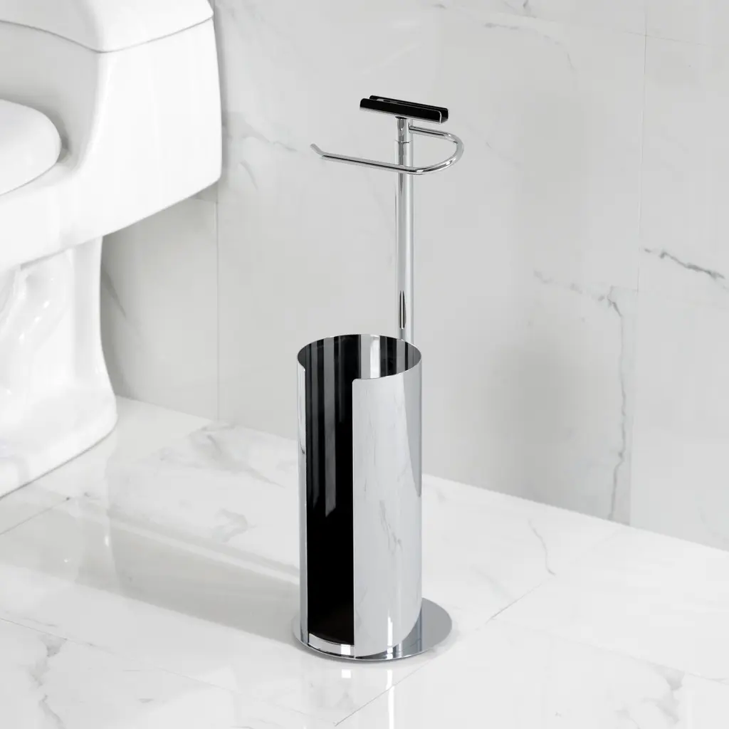 The Continental freestanding toilet paper holder with roll storage and phone stand gives the bathroom a contemporary touch. Additionally, its weighted base provides ease of use as it avoids tipping and falling.Features304 grade stainless steel constructionHold up to 4 rolls toilet paper rollsExtra storage space for extra toilet paper rolls5-1/16" toilet paper rod tube6-7/8" round base with weighted base22-7/8" overall heightFreestanding Design, no installation requiredSmart devices holder on the topProp 65 disclaimerWARNING: This product can expose you to chemicals, including lead which is known to the State of California to cause cancer or birth defects or other reproductive harm, for more information, go to www.p65warnings.ca.gov