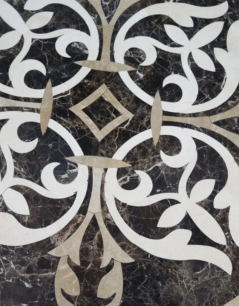 An exquisite circular marble mosaic medallion that is a testament to the artistry of stonework. Featuring a striking contrast between a dark background and intricate white marble inlay, the design captivates the eye with its intricate details. Delicate floral motifs gracefully intertwine, creating a sense of movement and fluidity. At the heart of the medallion, a central diamond shape adds a touch of geometric elegance and symmetry. This high-quality mosaic medallion is a perfect choice for enhancing the aesthetic appeal of any space, whether it's a residential or commercial setting. Its timeless design and luxurious materials make it a true statement piece that will be admired for years to come.