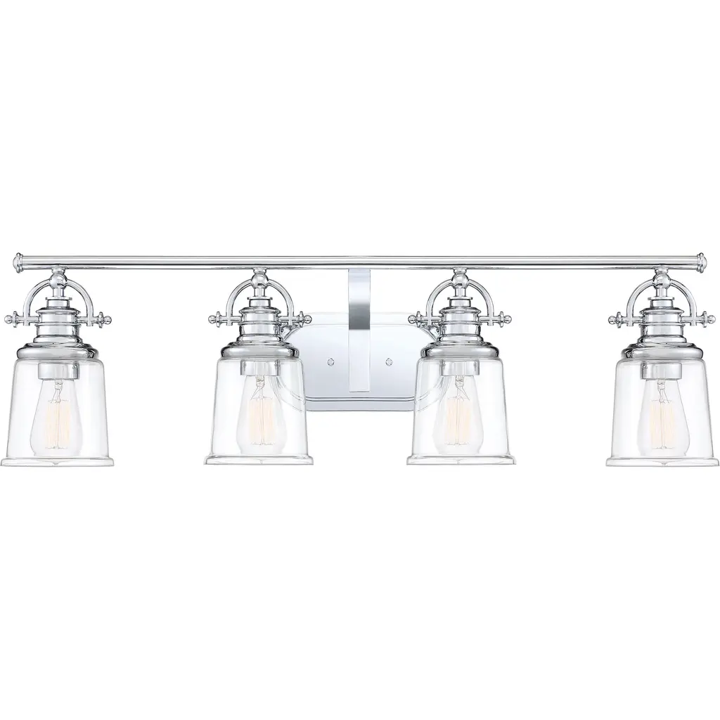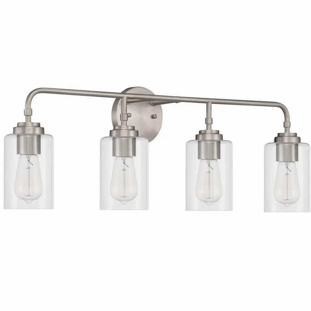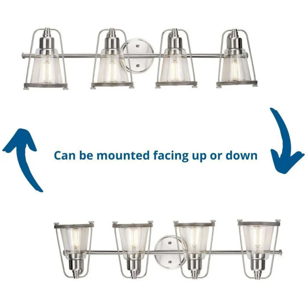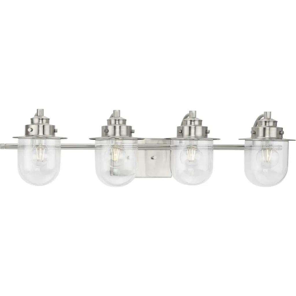 Mix old and new for charming character with the Conway Collection 4-Light Brushed Nickel Clear Seeded Farmhouse Bath Vanity Light. A brushed nickel bell-shaped frame and round backplate are accented by hand-painted, weathered grey wood-style accents for a charming nautical aesthetic. A light source glows from within a clear seeded glass shade for visual texture.