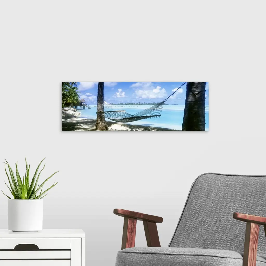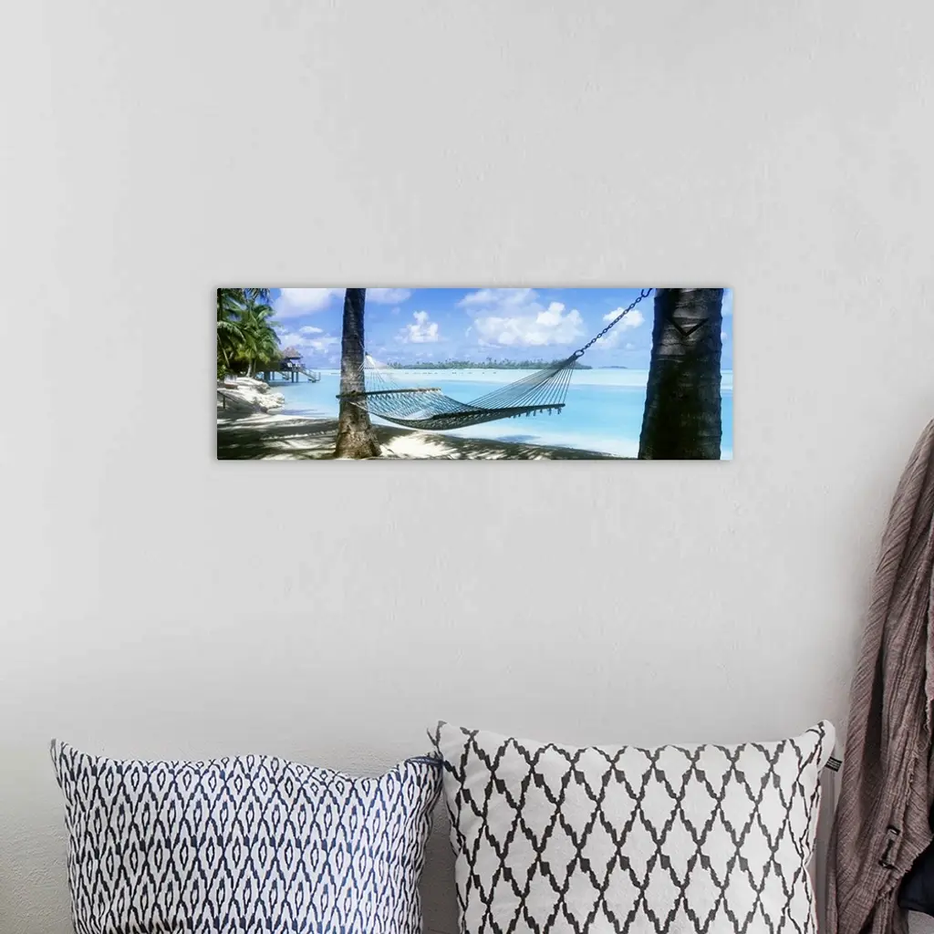 Panoramic photograph of a hammock hanging between two palm along the shore of the Cook Islands, clear blue waters of the South Pacific in the background.