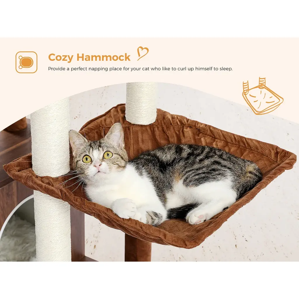 Elaborate Playhouse: This 51.4-inch cat tree offers a fun environment with a top perch, large hammock, platforms, cozy condo, and a swing tunnel, perfect for your frisky cats.Ultra Comfort: The top perch with a raised rim, extra-large hammock, and plush cushion in the condo provide ultimate comfort and relaxation.Exquisite Wonderland: This versatile activity center includes scratching posts, a dangling ball, and removable mats for endless entertainment and easy cleaning.Reliable Quality: Crafted from CARB-certified natural boards, it ensures stability and safety, with antibacterial fabric.Surprise Your Cats: Easy installation, a one-year free replacement for parts (except the dangling ball), and a delightful gift for your furry friends.