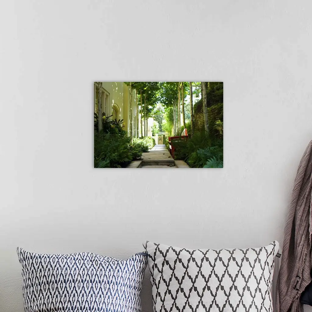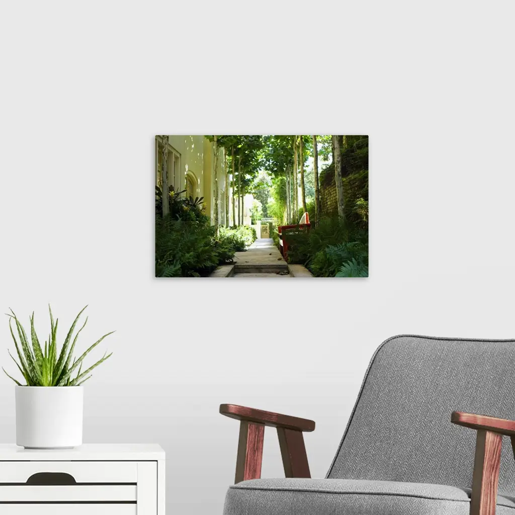 A photograph of a shaded garden pathway besides a house, landscaped with tropical plants, and adjacent to a brick wall.