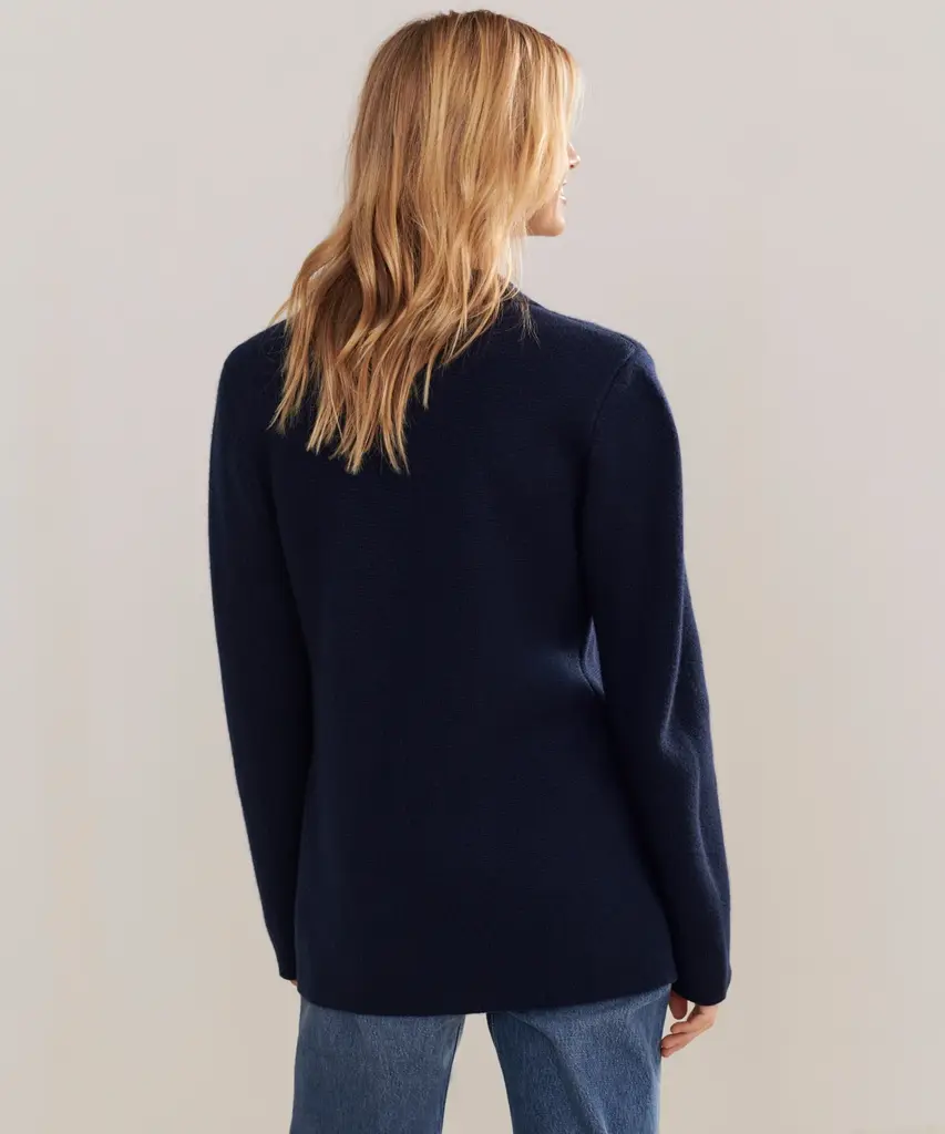 Cooper Blazer Dark Navy With the same knit and weight as our coveted Cooper Cardigan, this relaxed take on a classic blazer brings the best of California style to the forefront. With the comfort and coziness of a knit, use this blazer to elevate a lounge look or soften a dressier take.  70% wool, 30% cashmere. Made in China. Single breasted button blazer with notch collar and pockets.
