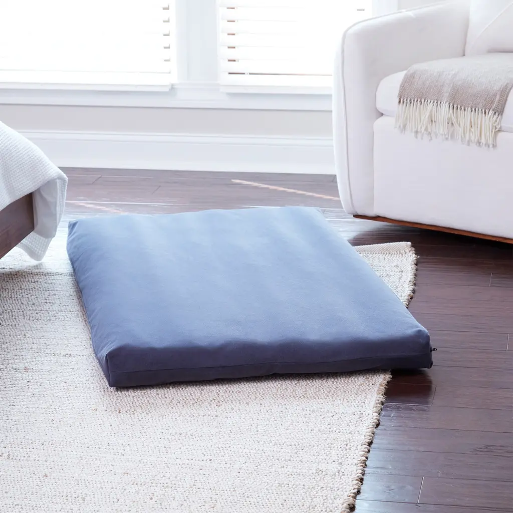 The Happy Hounds' Cooper Deluxe Crate pad is designed to make your dog's crate time as comfortable as possible. The super soft microfiber fabric is both water and stain resistant, as well as machine washable for easy care. This reversible cushion was designed to fit most standard crates, but is plush enough to use as a simple pillow style bed out of the crate as well. The zipper closure allows for easy removal and cleaning of the cover. The channel-filled insert keeps fill in place for a consistent comfort for your pet. Insert is generously filled with a soft polyfiber made from 100% post-consumer recycled plastic. Available in Denim, Gray or Latte colorsHeavy-duty 100% microfiber fabric Water and stain-resistant, recommended for indoor use Removable cover with hidden zipper to prevent chewingFilled with 100% post-consumer recycled plastic poly-fiberfillMachine washable coverFilled and finished in the USAExtra Large bed dimensions: 48"L x 30"W x 3"HLarge bed dimensions: 42"L x 28"W x 3"HMedium bed dimensions: 36"L x 23"W x 3"HSmall bed dimensions: 30"L x 19"W x 3"HExtra Small bed dimensions: 24"L x 18"W x 3"HBed dimensions can be ± 1 inchPlease note: Product will arrive in a slightly compressed state; please allow a few days for product to expand to final size listed in description.
