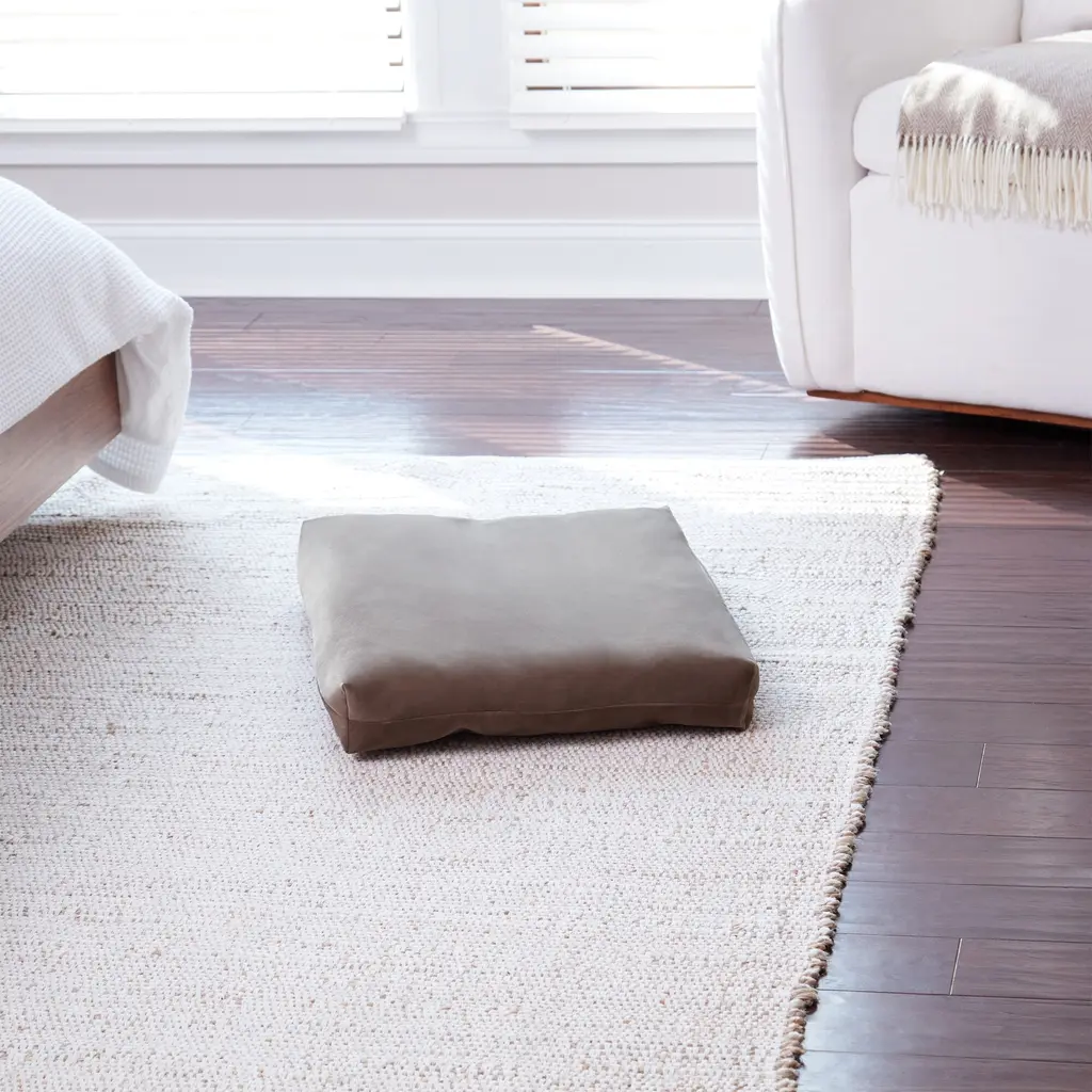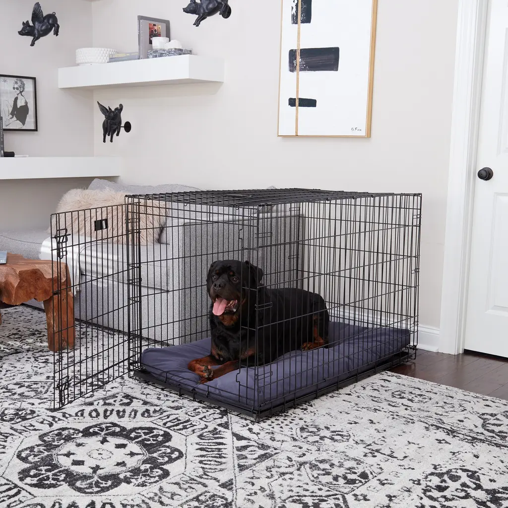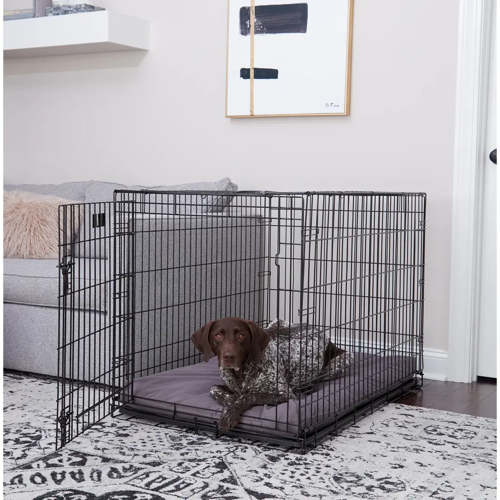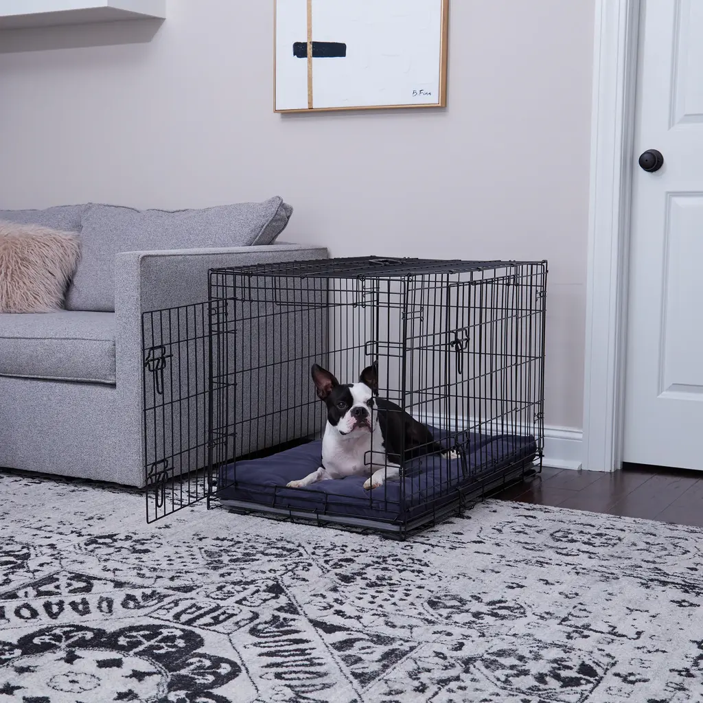 The Happy Hounds' Cooper Deluxe Crate pad is designed to make your dog's crate time as comfortable as possible. The super soft microfiber fabric is both water and stain resistant, as well as machine washable for easy care. This reversible cushion was designed to fit most standard crates, but is plush enough to use as a simple pillow style bed out of the crate as well. The zipper closure allows for easy removal and cleaning of the cover. The channel-filled insert keeps fill in place for a consistent comfort for your pet. Insert is generously filled with a soft polyfiber made from 100% post-consumer recycled plastic. Available in Denim, Gray or Latte colorsHeavy-duty 100% microfiber fabric Water and stain-resistant, recommended for indoor use Removable cover with hidden zipper to prevent chewingFilled with 100% post-consumer recycled plastic poly-fiberfillMachine washable coverFilled and finished in the USAExtra Large bed dimensions: 48"L x 30"W x 3"HLarge bed dimensions: 42"L x 28"W x 3"HMedium bed dimensions: 36"L x 23"W x 3"HSmall bed dimensions: 30"L x 19"W x 3"HExtra Small bed dimensions: 24"L x 18"W x 3"HBed dimensions can be ± 1 inchPlease note: Product will arrive in a slightly compressed state; please allow a few days for product to expand to final size listed in description.